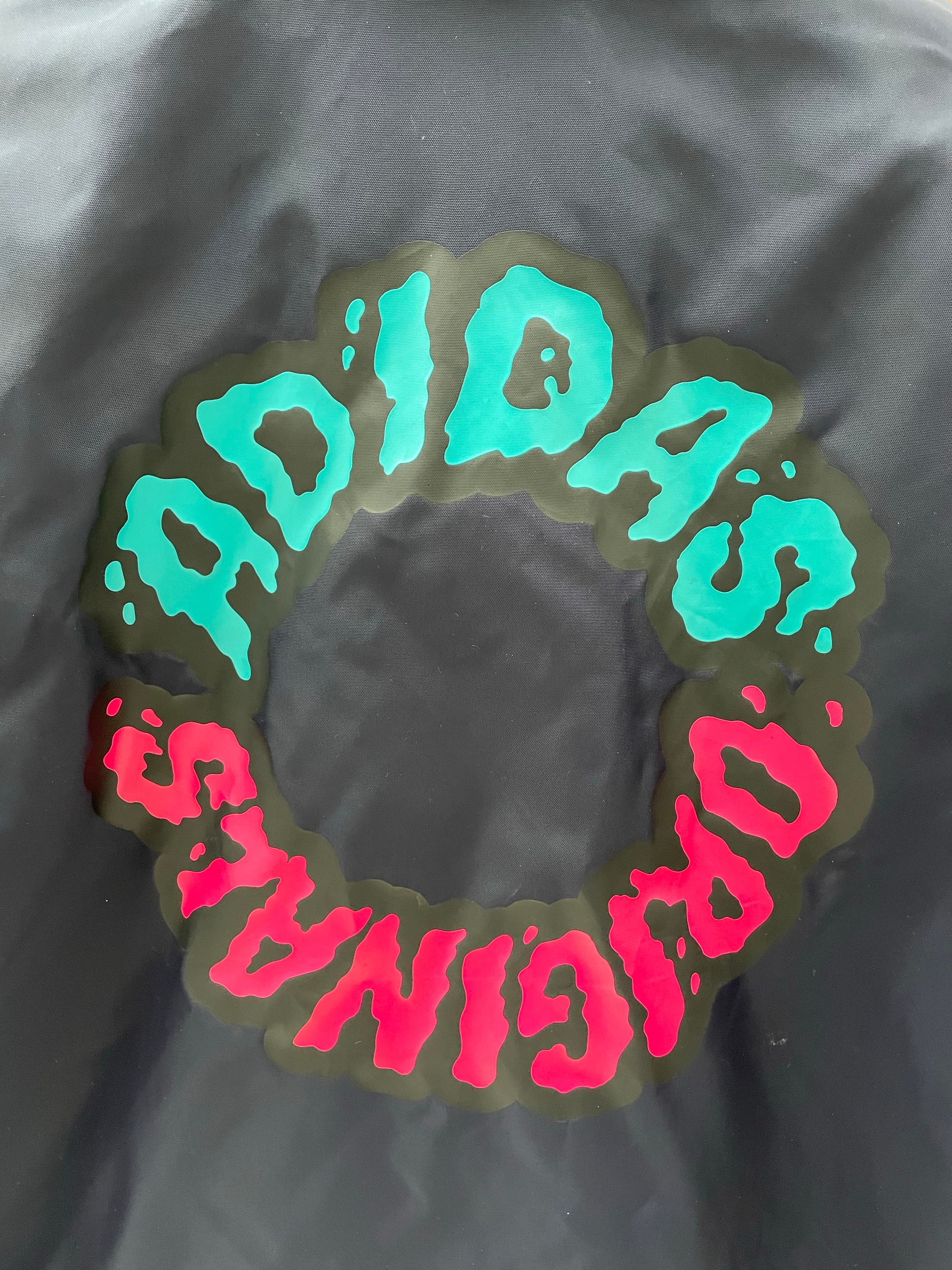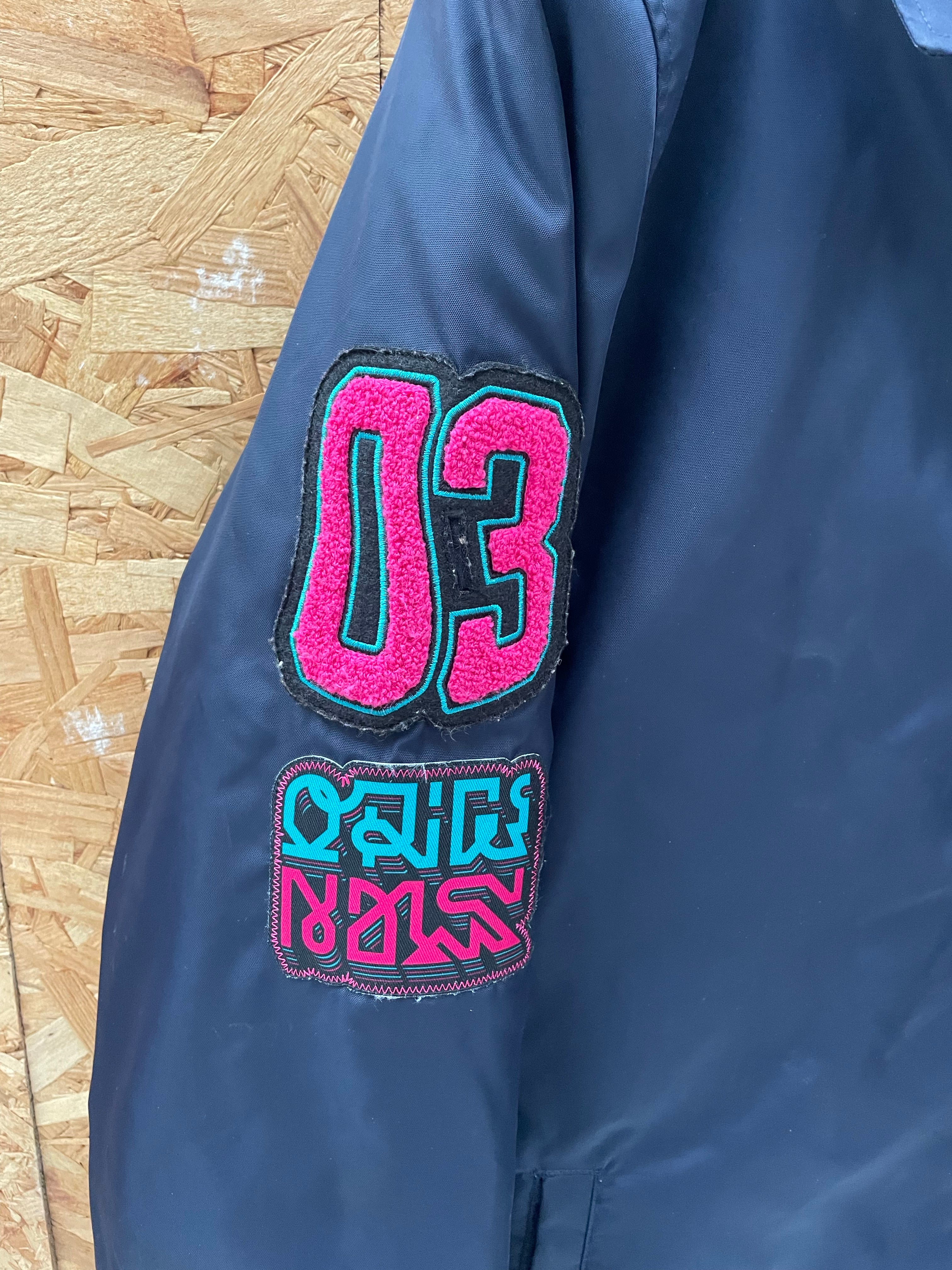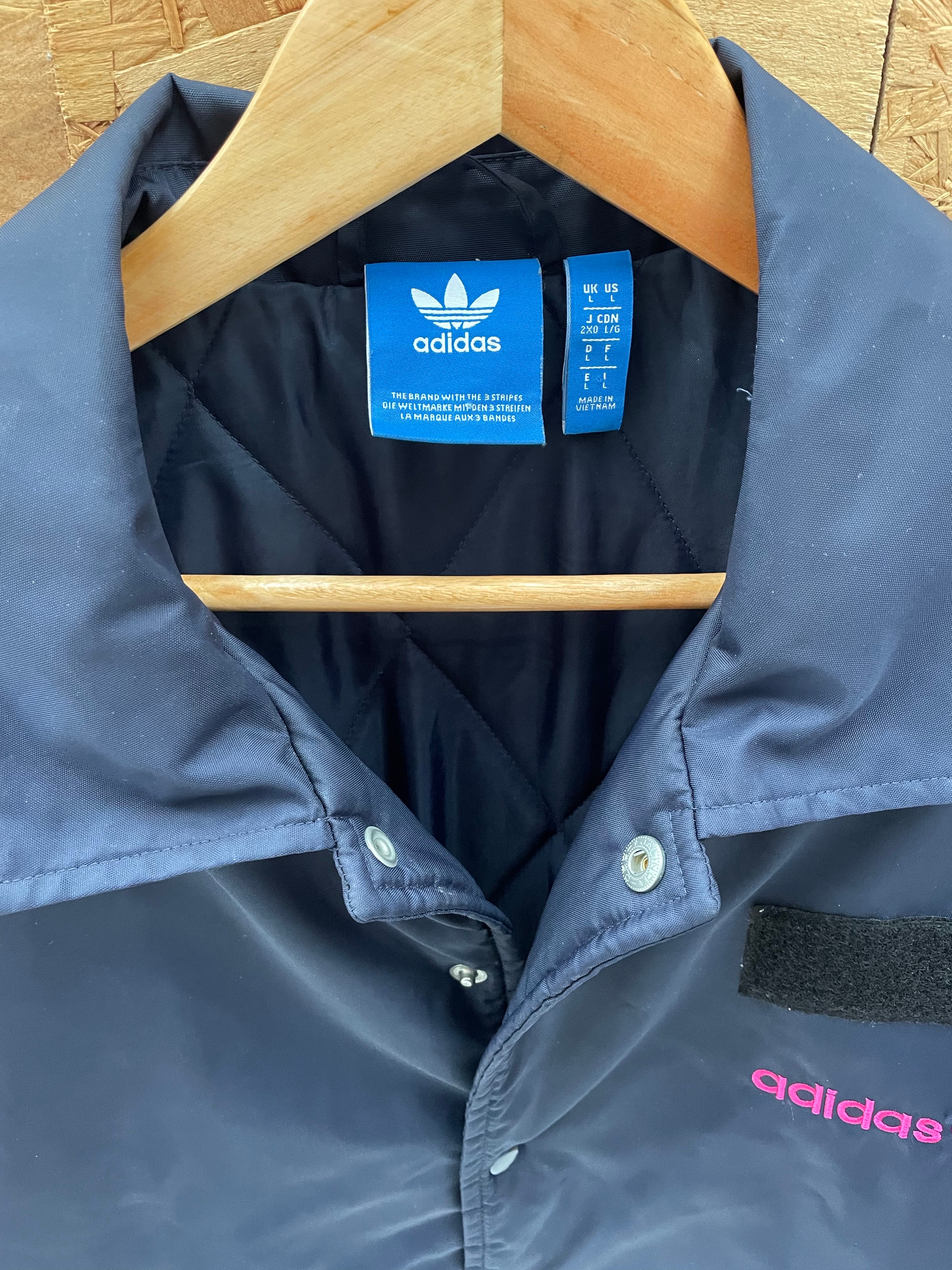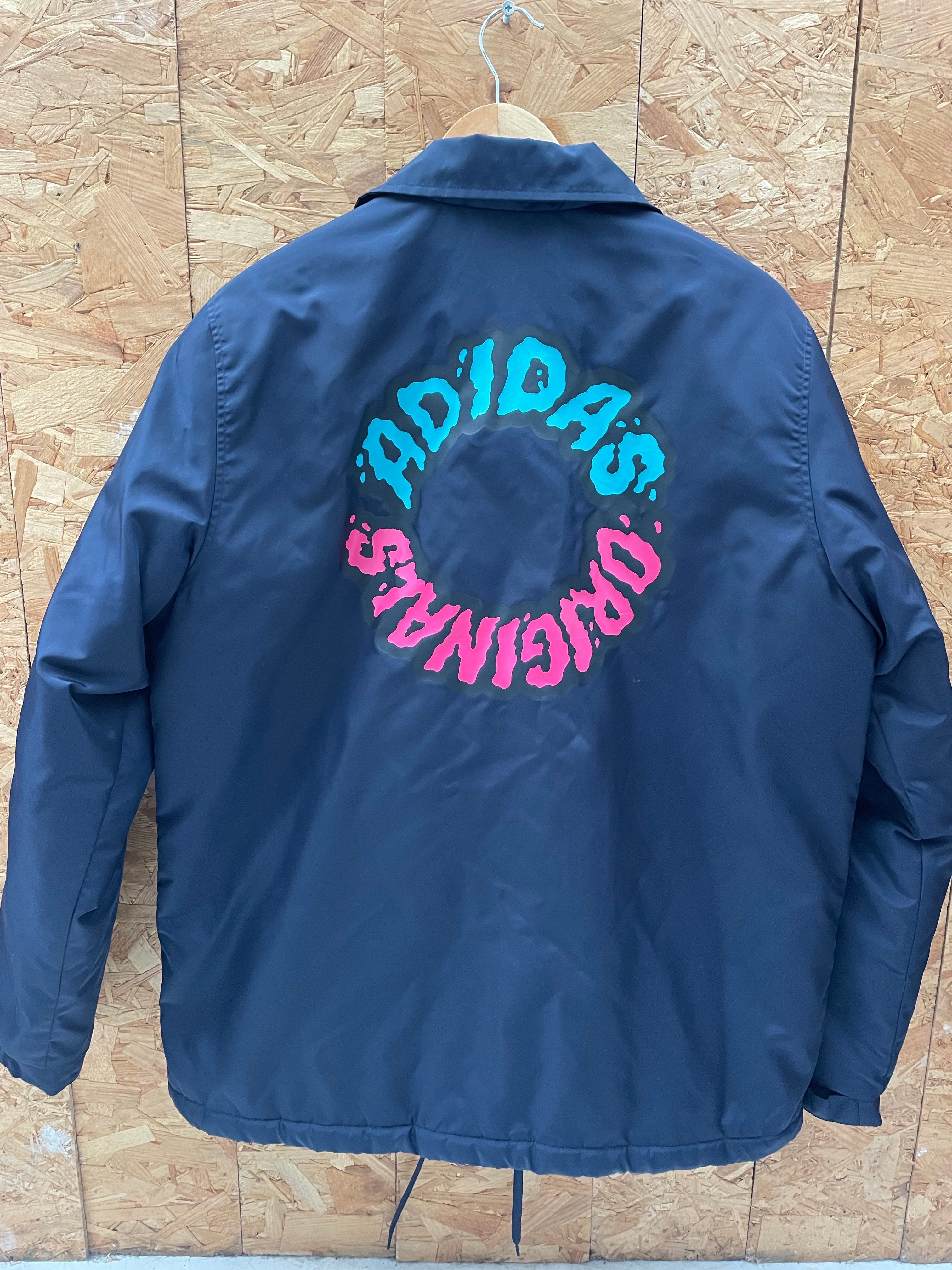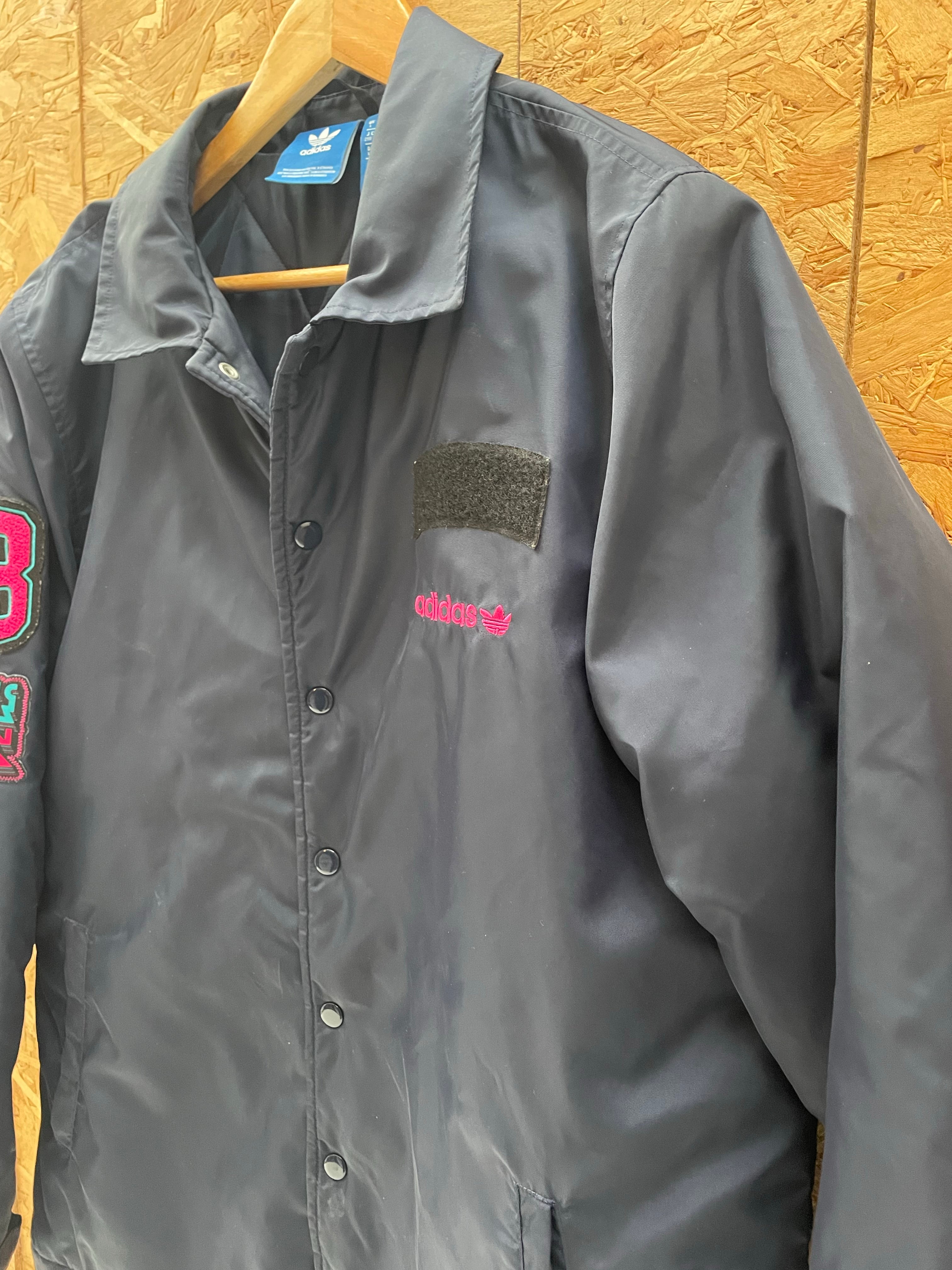 Adidas Originals navy blue track jacket with "03" patch on the sleeve and circular "Adidas Originals" graphic on the back. Features snap button closure and adjustable drawstring hem. Excellent condition, appears lightly used.