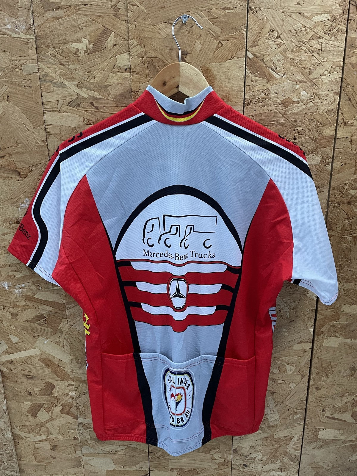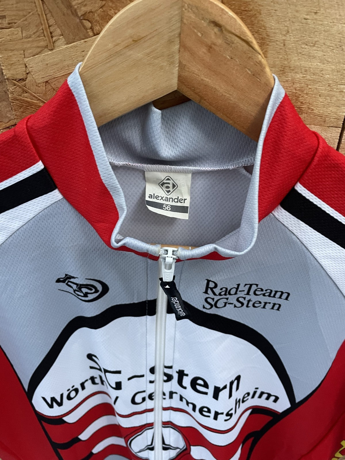 Short sleeve cycling jersey for SG-Stern Wörth/Germersheim team. Features Mercedes-Benz branding. Full zip closure. Lightweight and breathable fabric. Perfect for cycling enthusiasts and collectors.