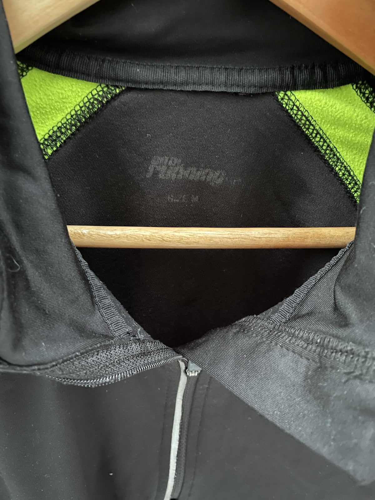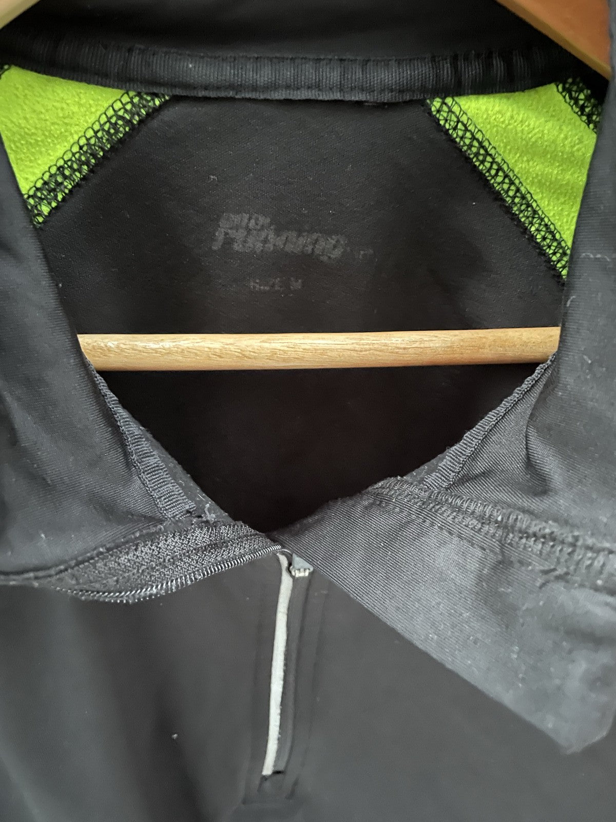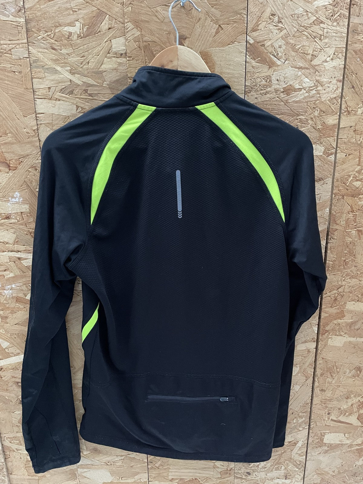 Men's athletic pullover jacket with a 1/4 zip and neon green accents. Features reflective details on the sleeves and back, and a zippered pocket on the back. Perfect for running or training. Size M.