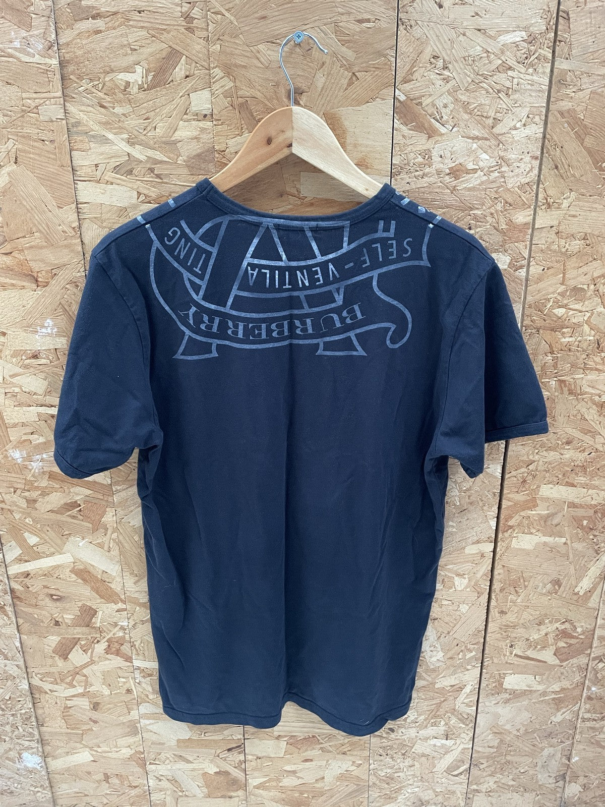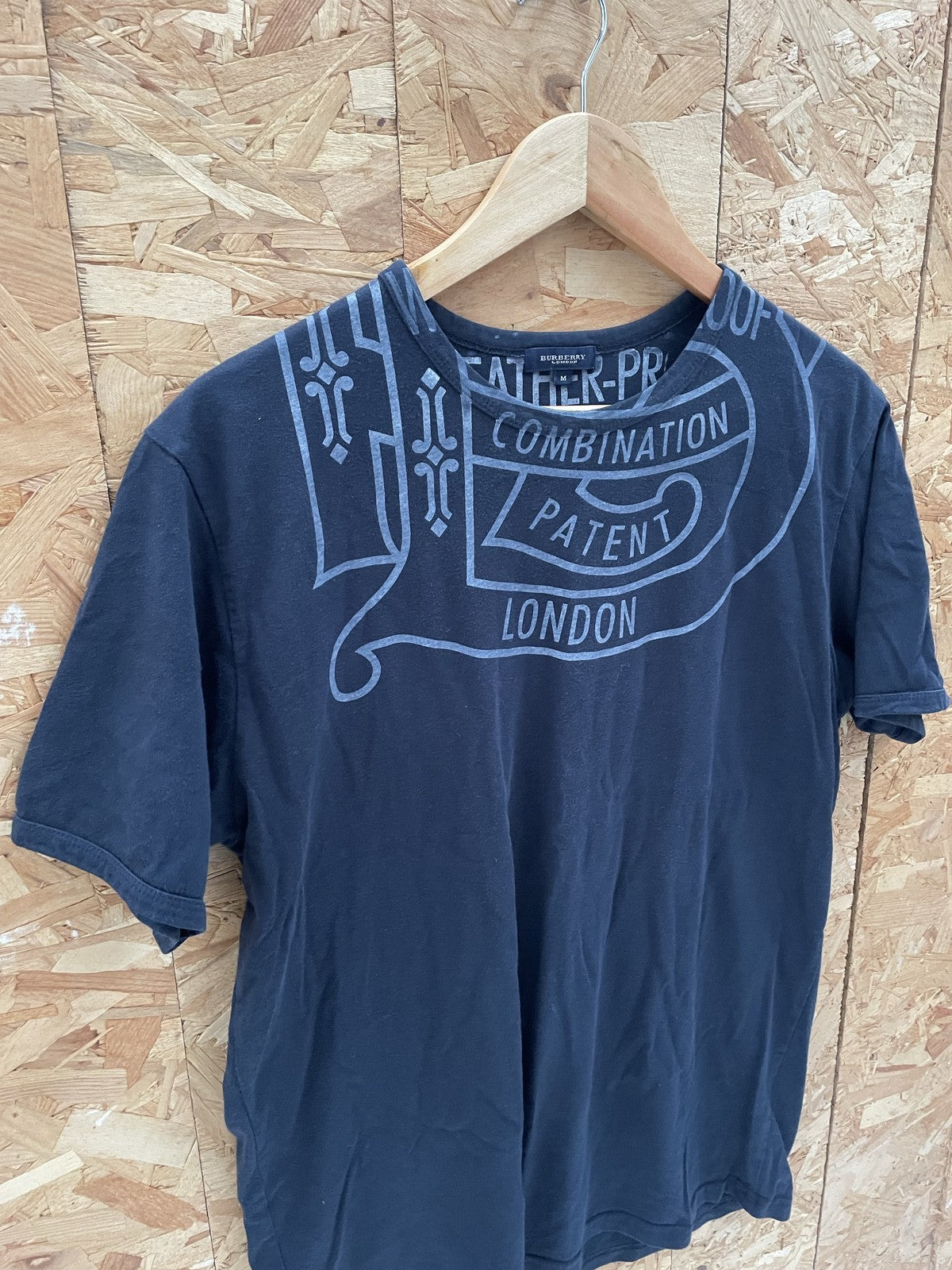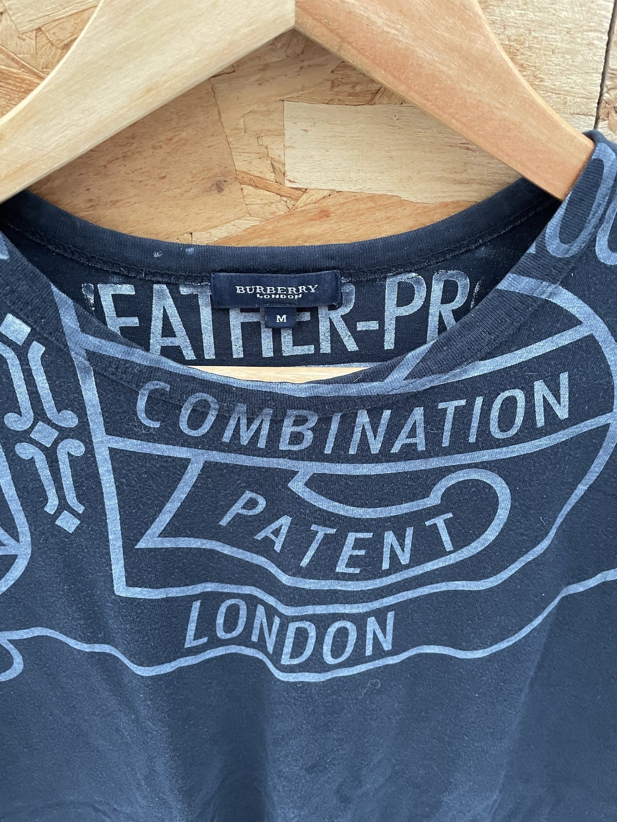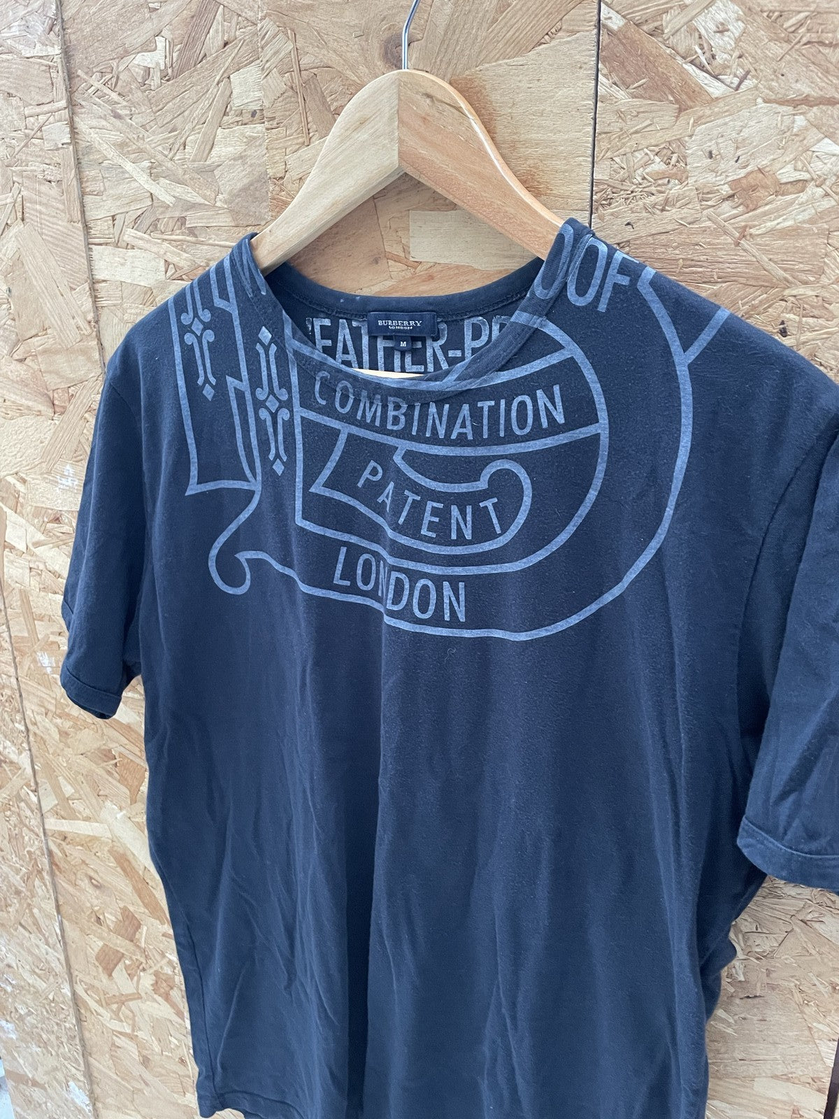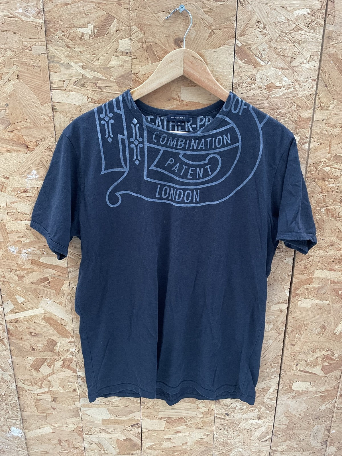 Stylish Burberry men's graphic t-shirt in black, size medium. Features a unique graphic print with 'Burberry London' and 'Patent Combination' text. Made from comfortable cotton, this short-sleeve crew neck tee is perfect for casual wear.
