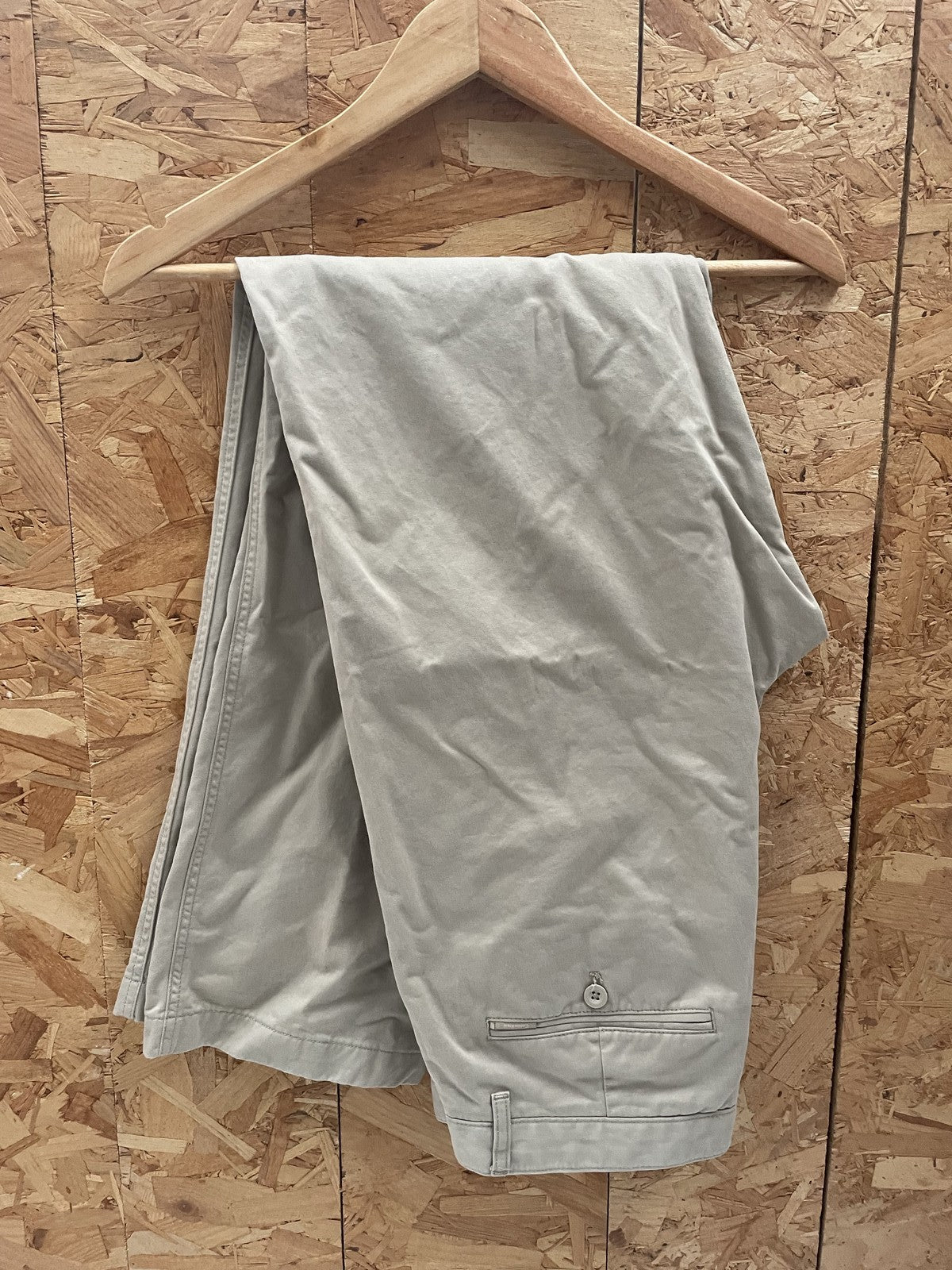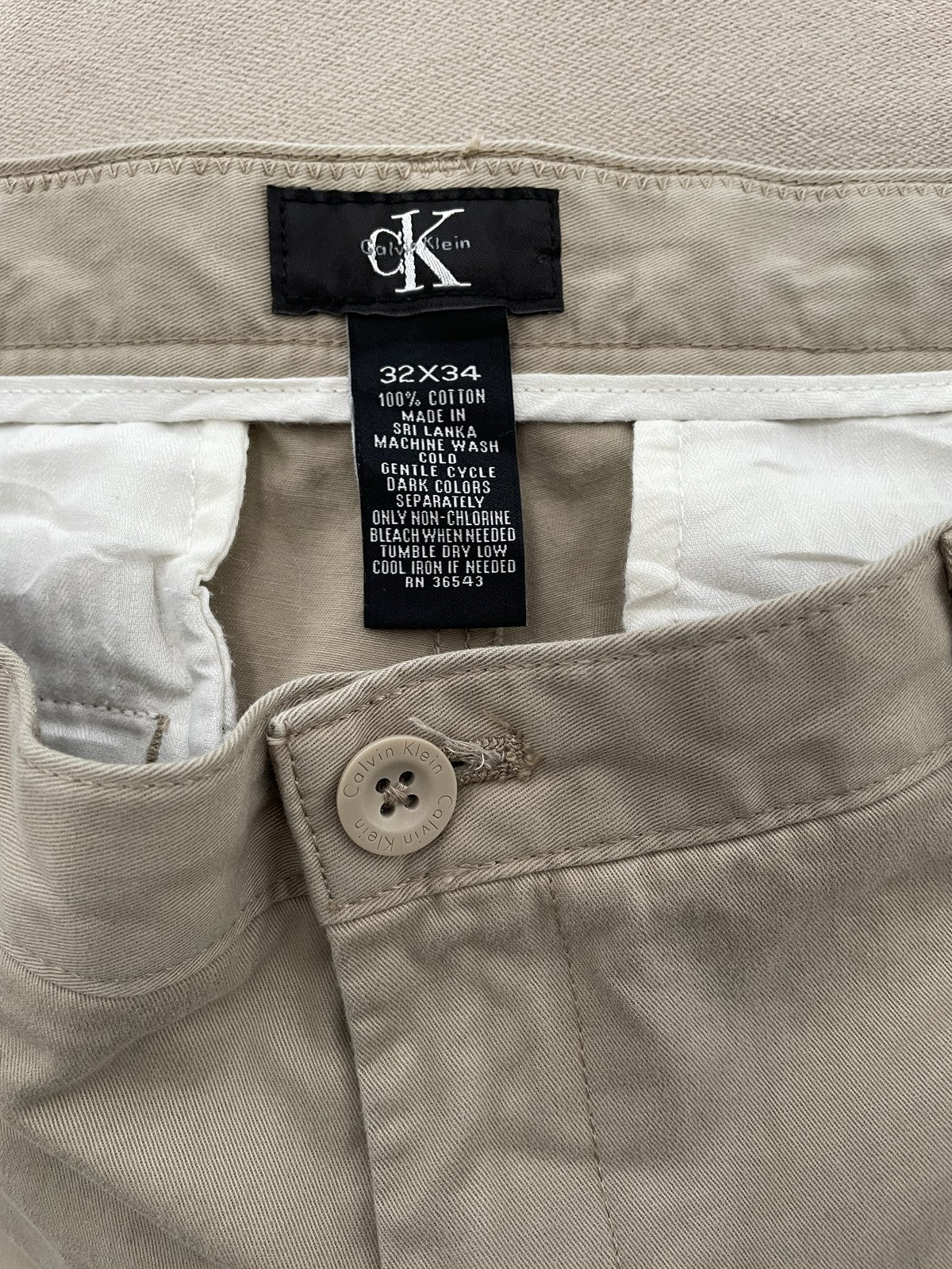 Classic Calvin Klein men's chino pants in a versatile khaki color. Made from a comfortable cotton blend, these straight-fit pants are perfect for casual wear. Features a button closure and belt loops. Size 32x34.