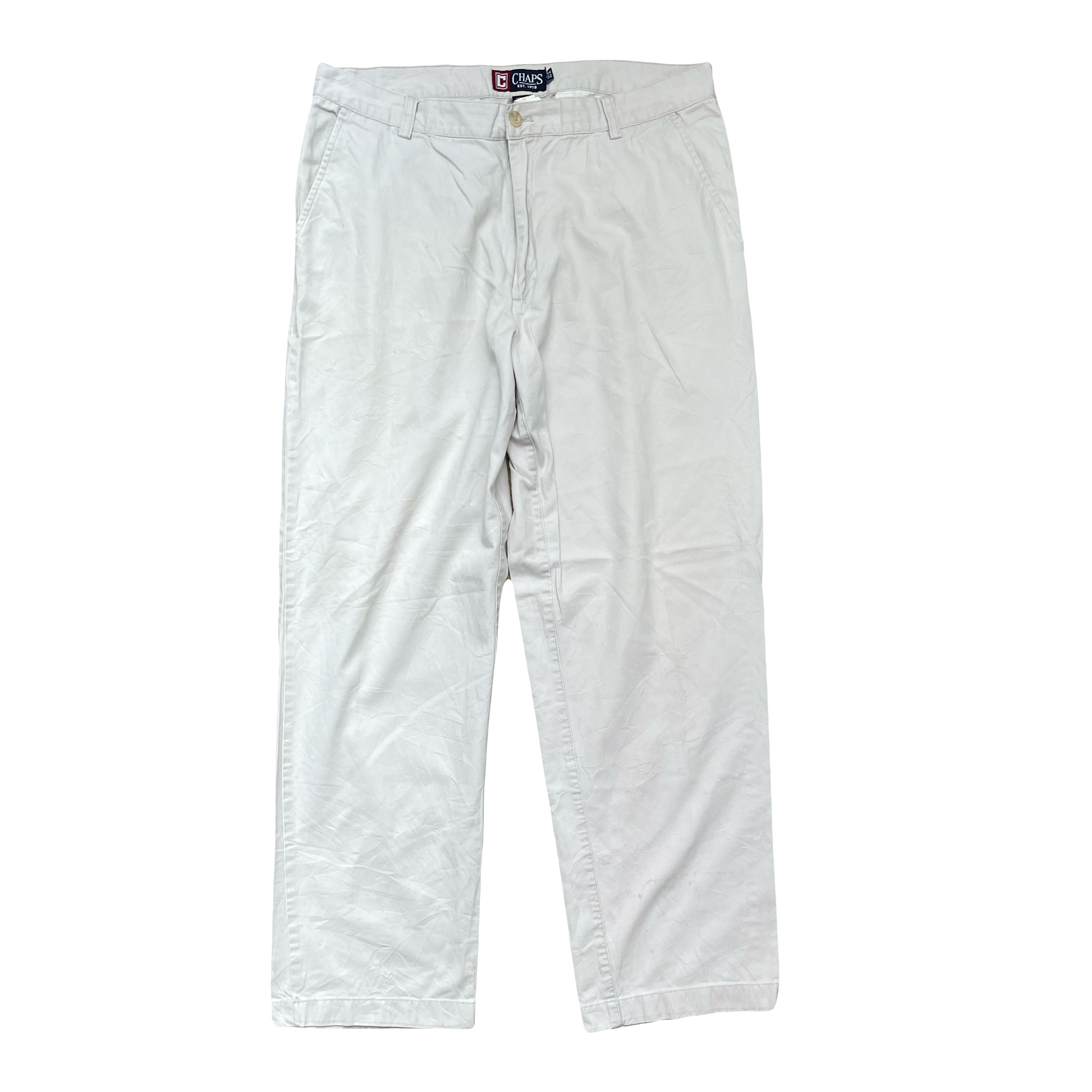 Pre-owned Chaps men's casual pants in beige. Size W34 L32. Flat front style. Good condition, some minor wear. Color: White.