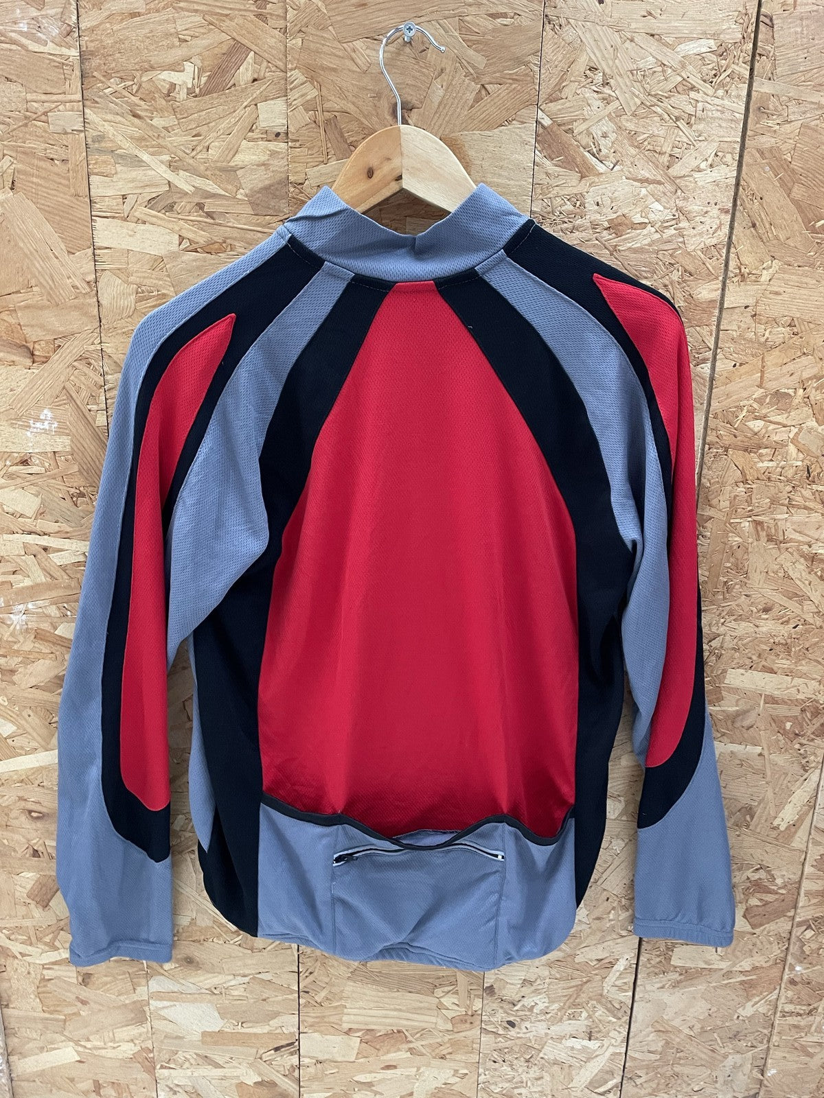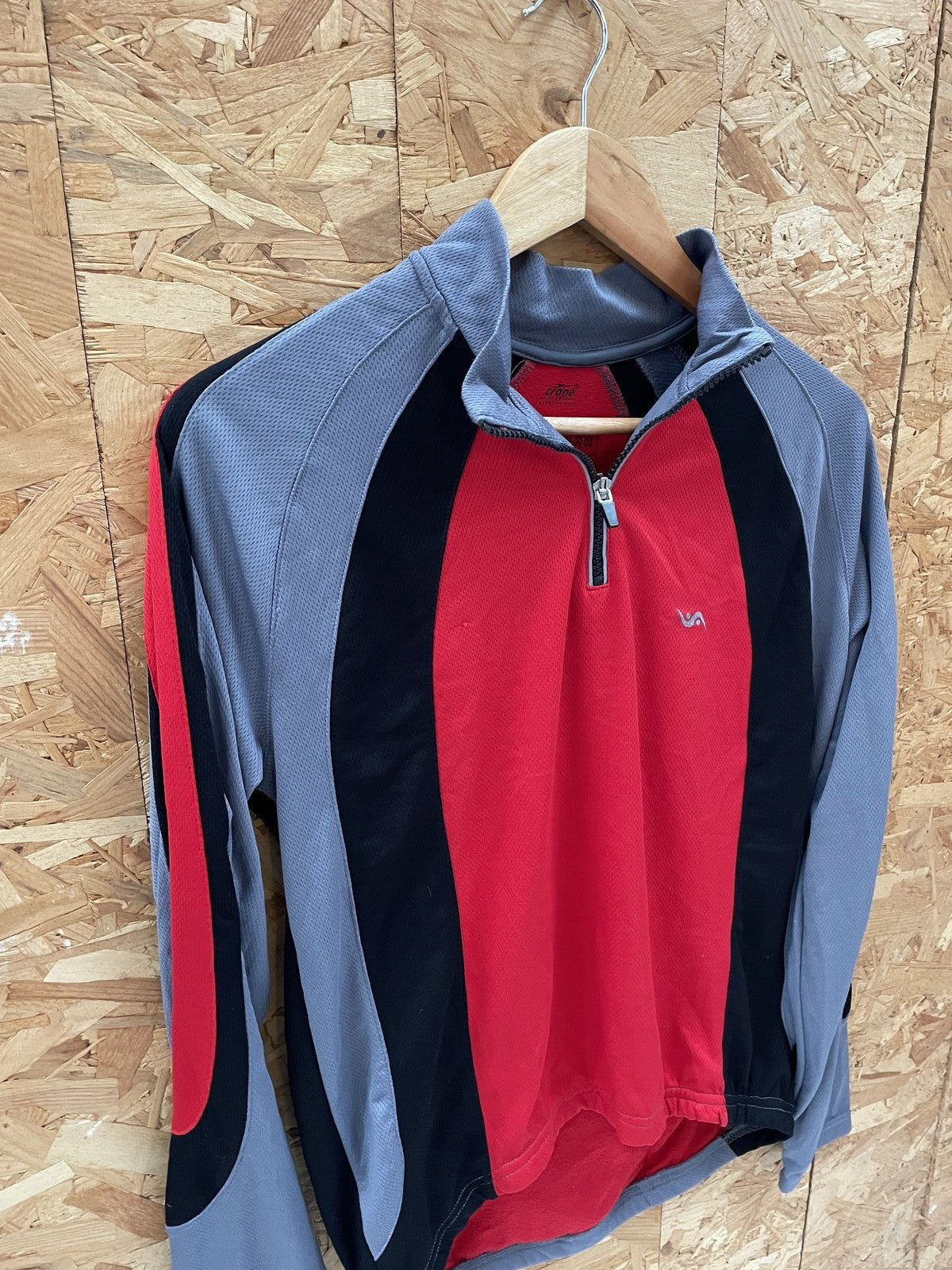 This Crane Sport cycling jersey is designed for performance and comfort. Featuring a vibrant red, black, and grey color block design, it has a quarter-zip neckline for ventilation and long sleeves for coverage. Perfect for your next ride.