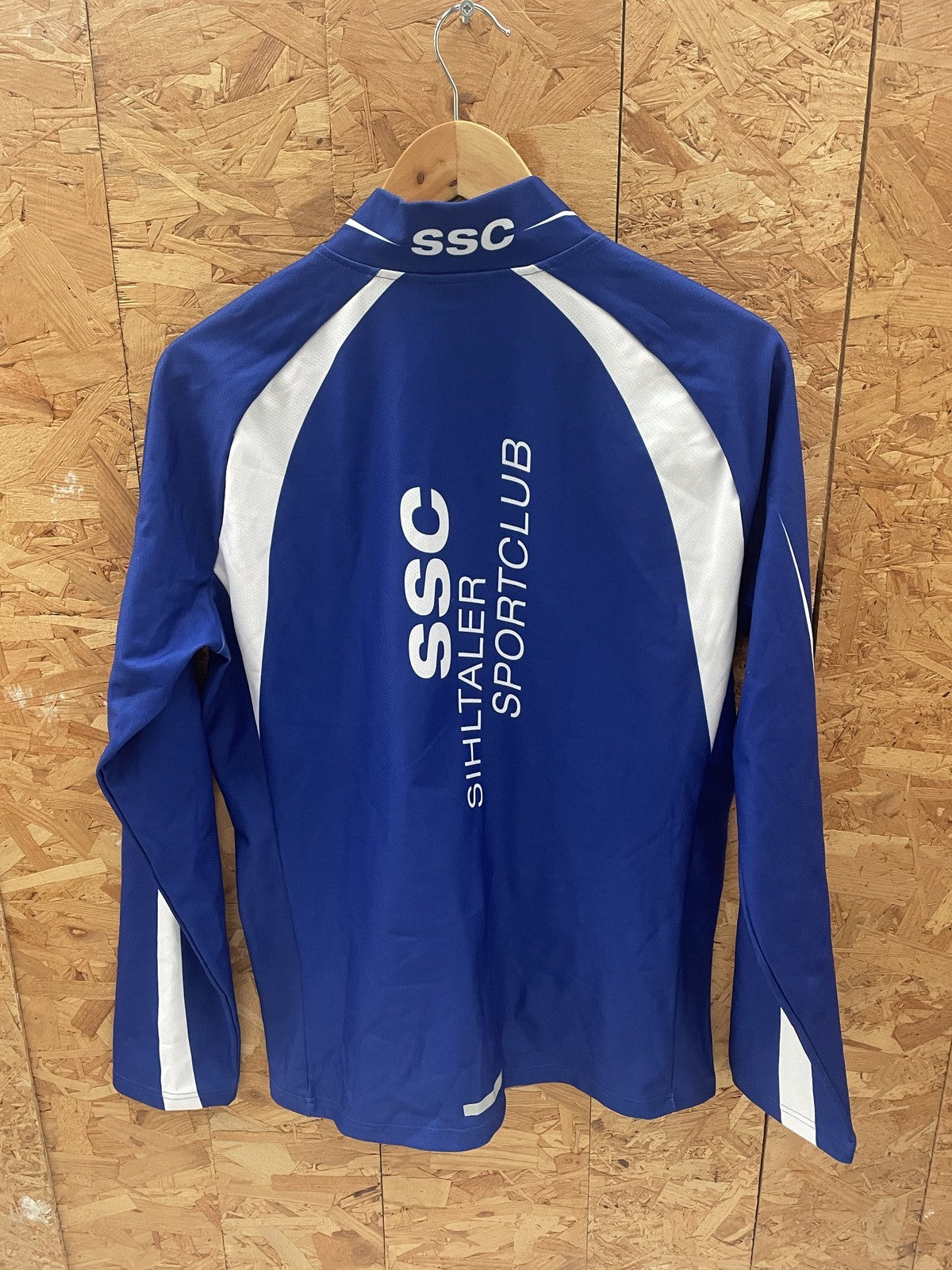 This Crespo jacket features a vibrant blue and white design with the SSC Sihltaler Sportclub logo. It has a full zip closure and two zippered pockets. Perfect for athletic activities or casual wear. Size M.