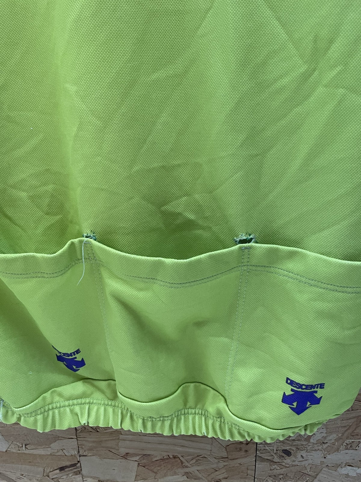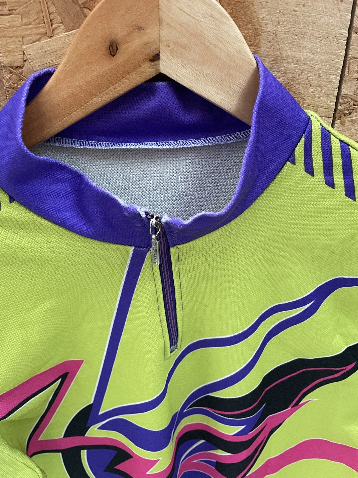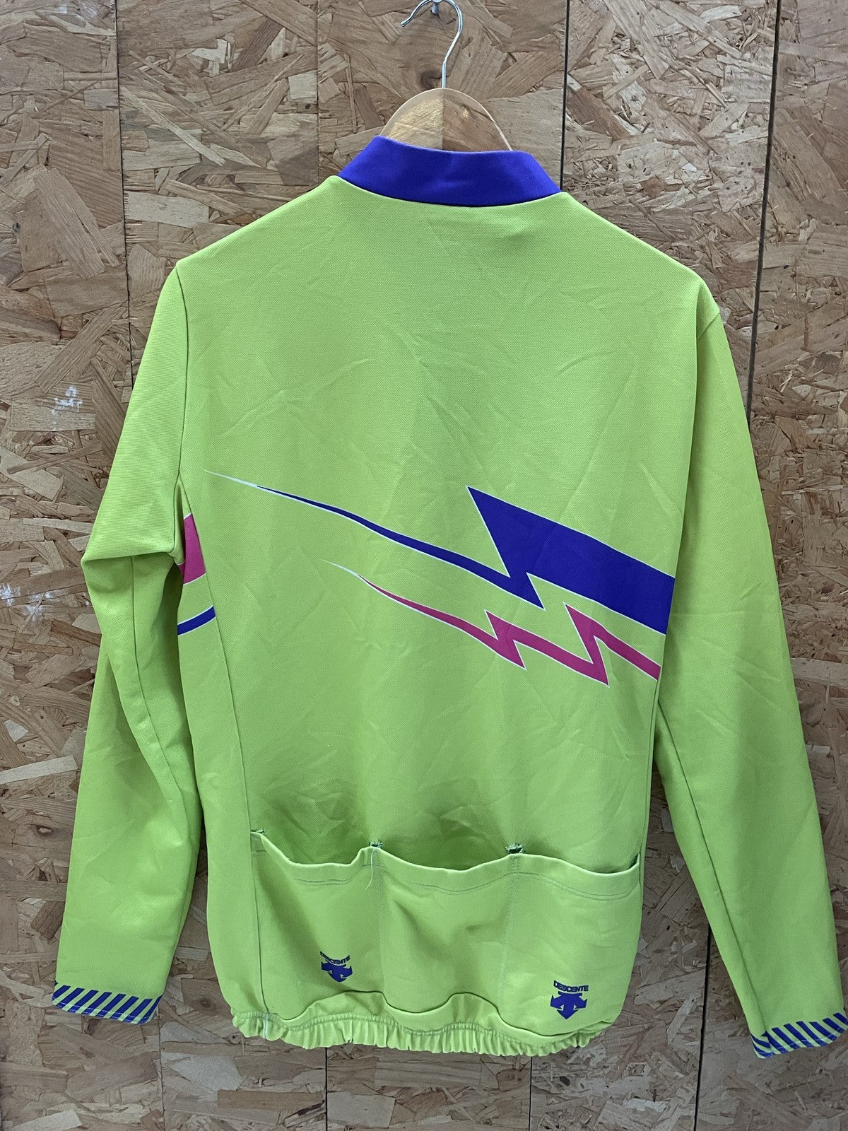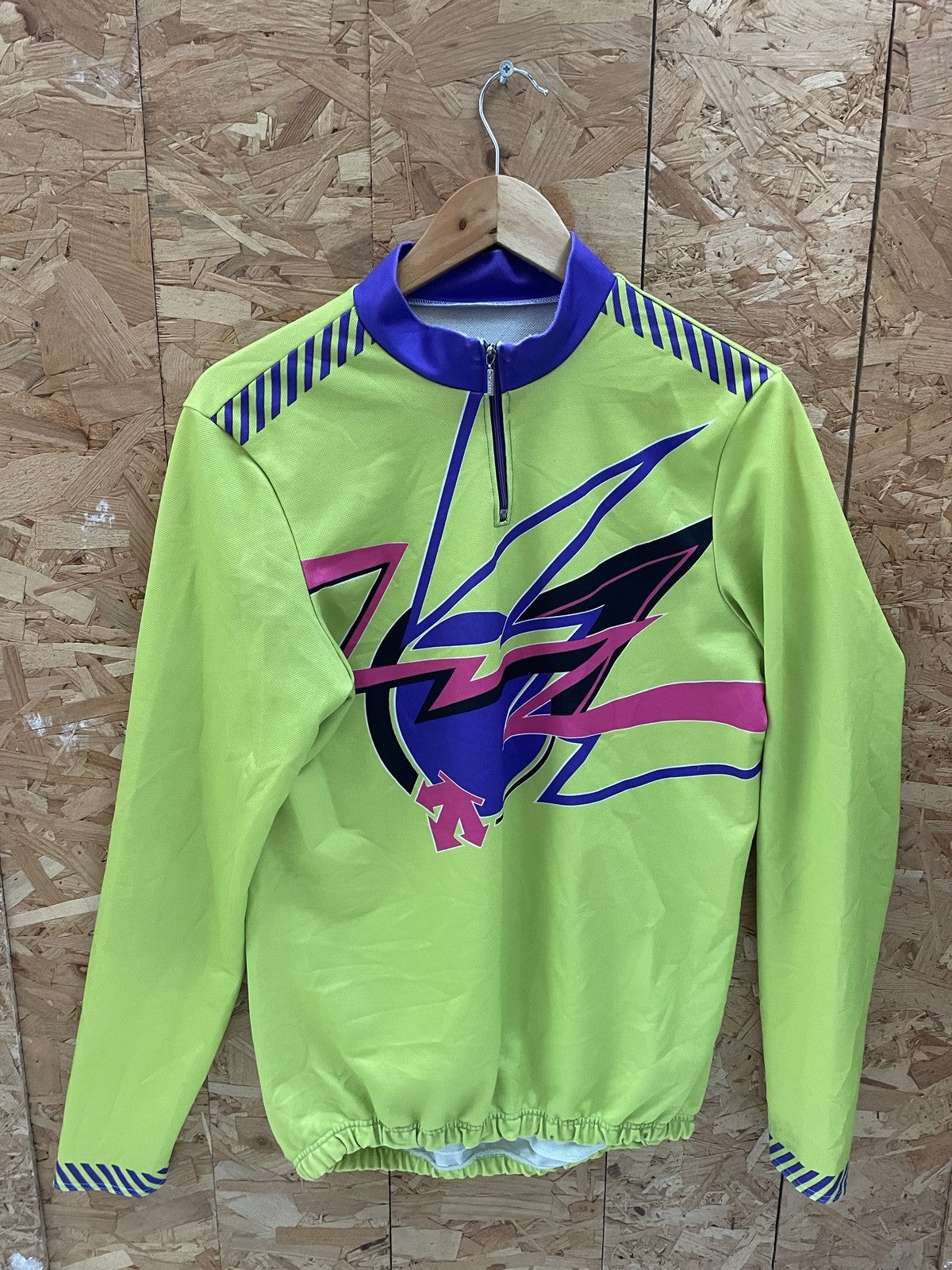 Vintage Descente cycling jersey in a vibrant lime green. Features a bold graphic design with purple, pink, and black lightning bolts. This long-sleeve jersey has a 1/4 zip neckline and elasticated hem. Perfect for collectors or those seeking a retro athle