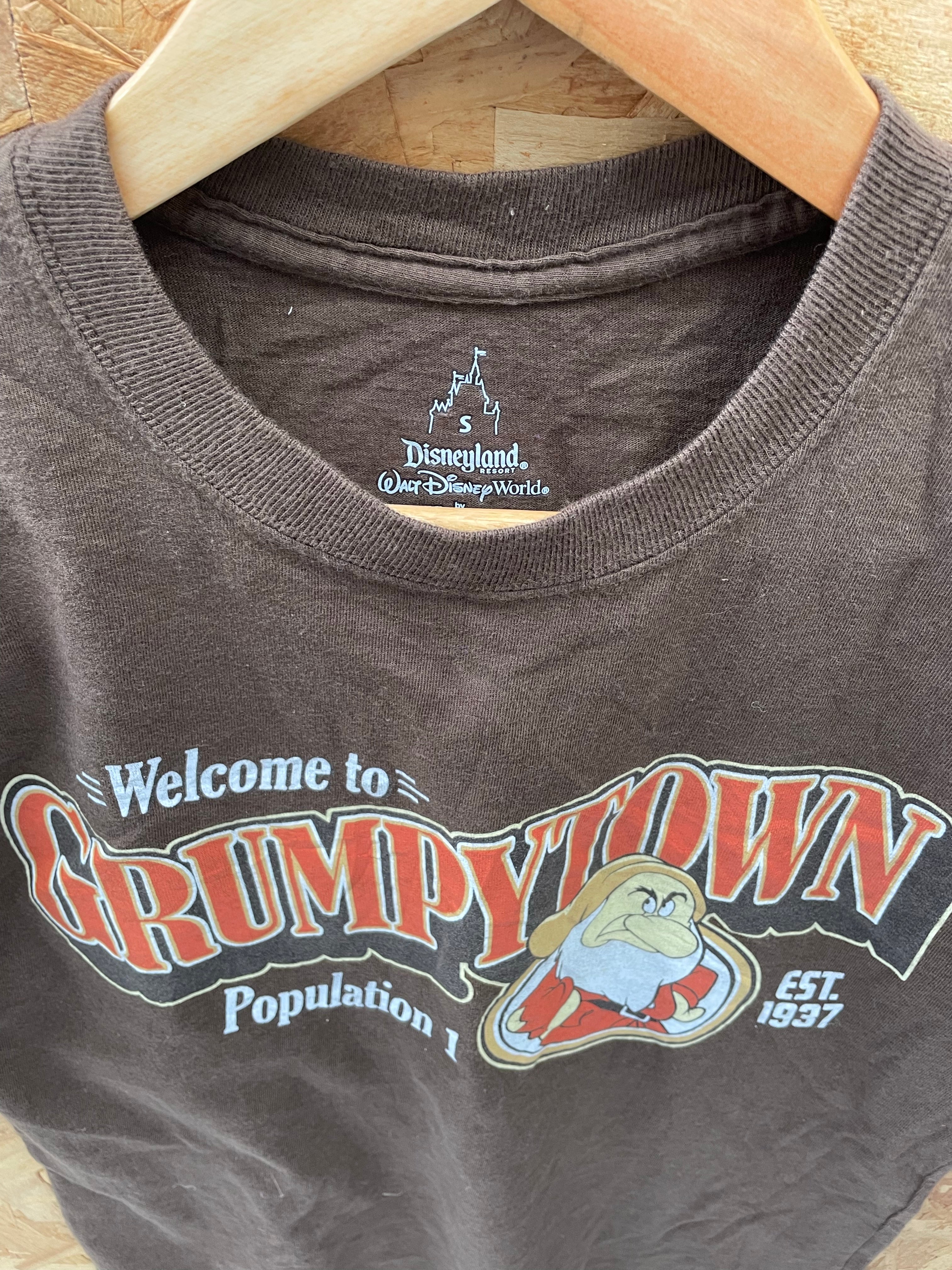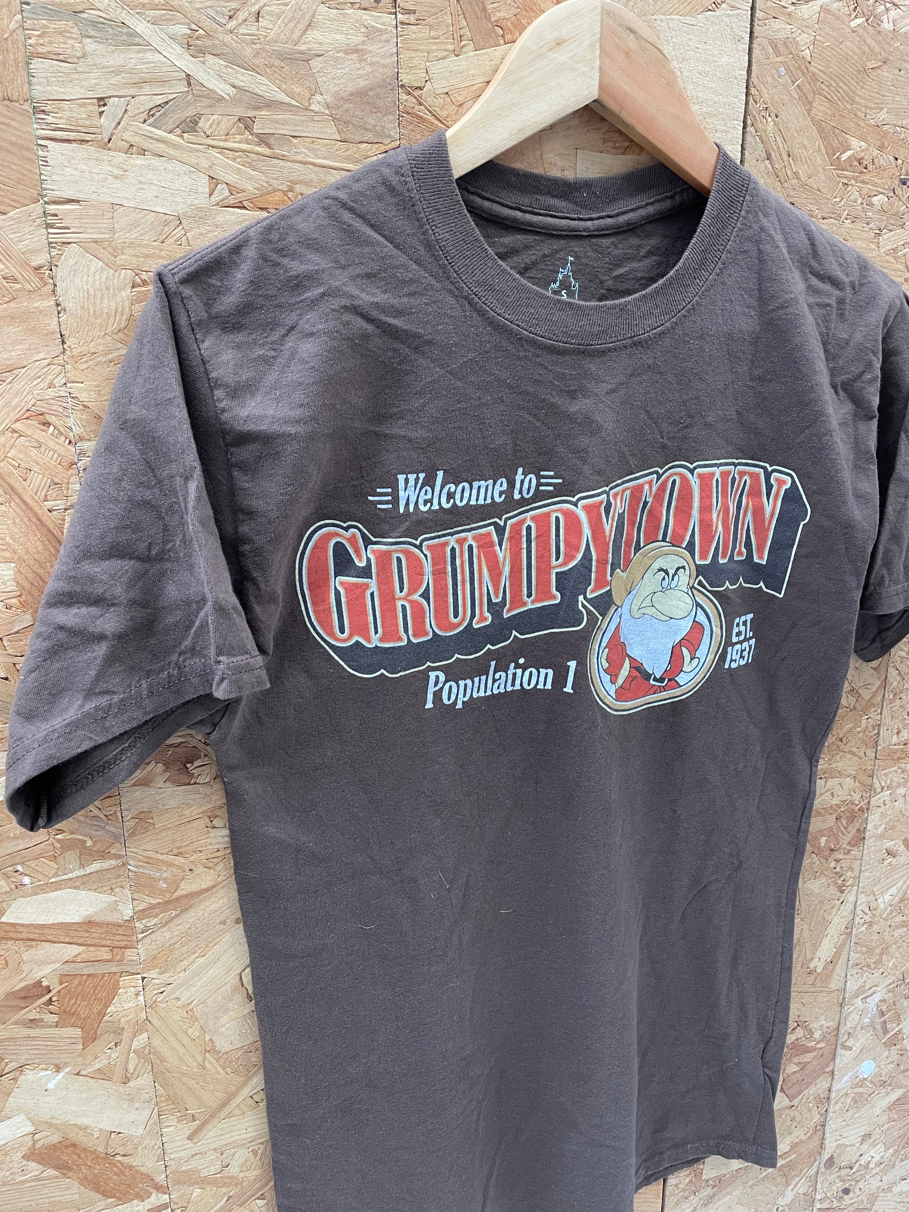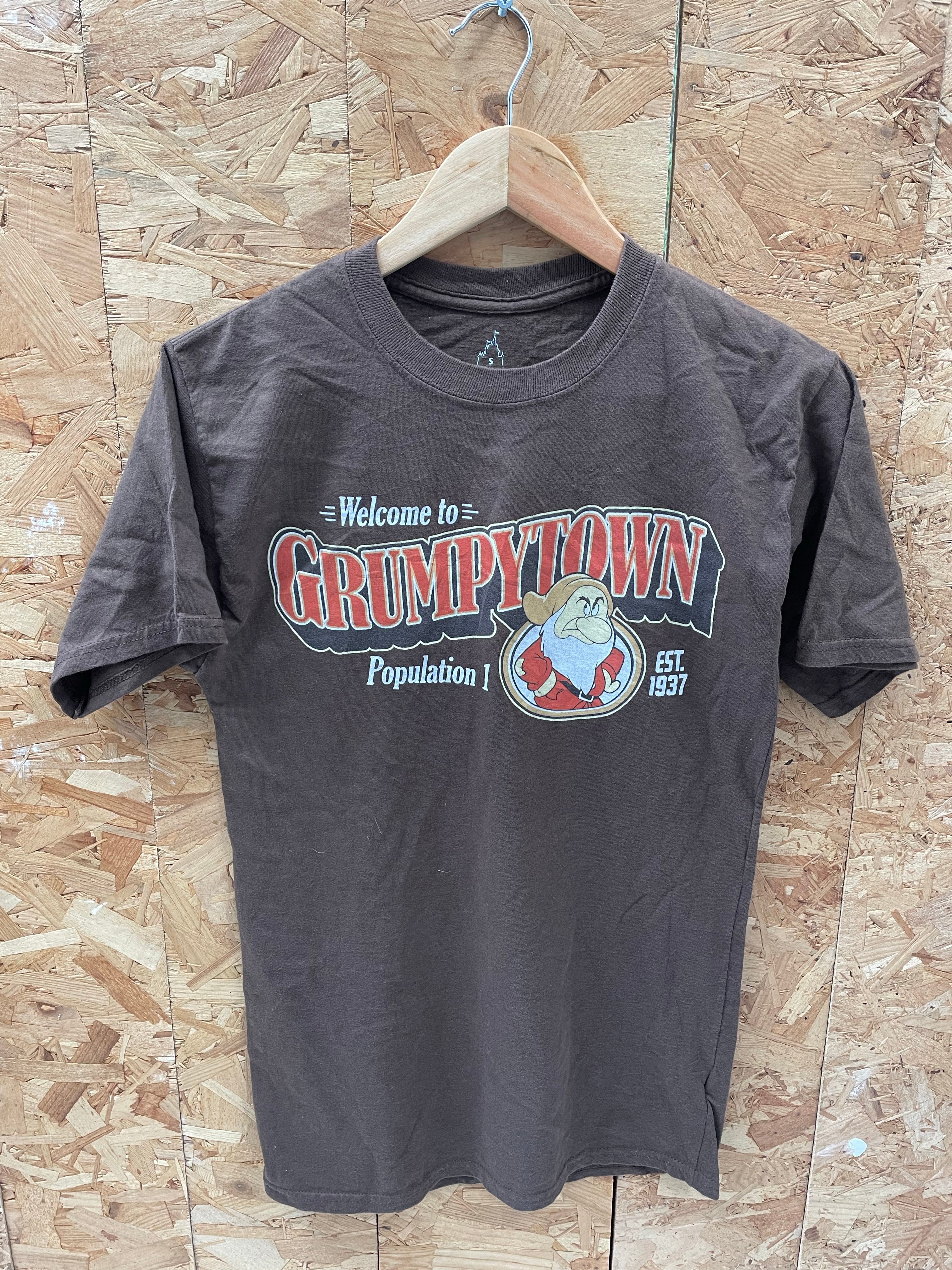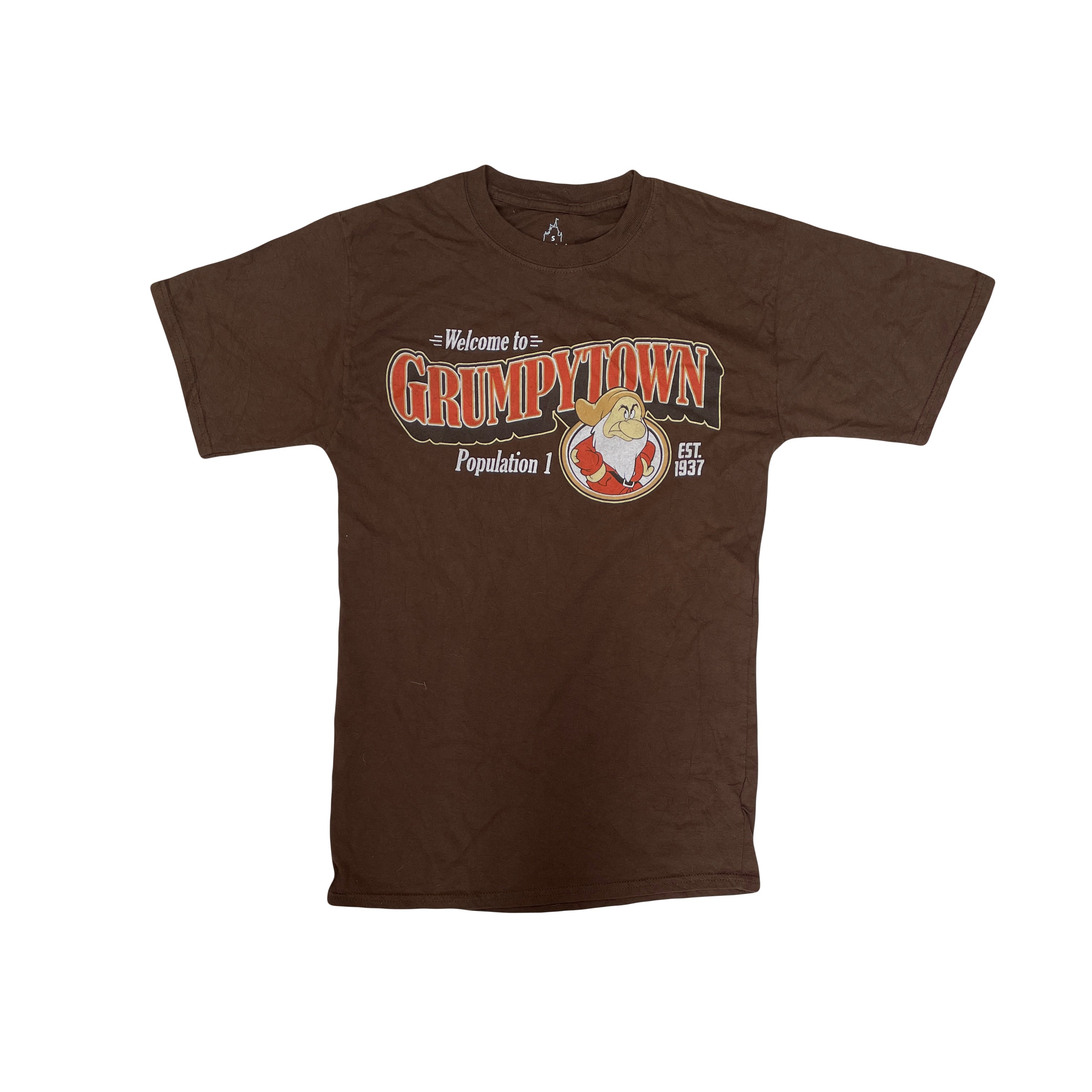 Brown Grumpy Town graphic tee. Features Grumpy from Snow White and the Seven Dwarfs. Adult size small. Good condition. Color: Brown.