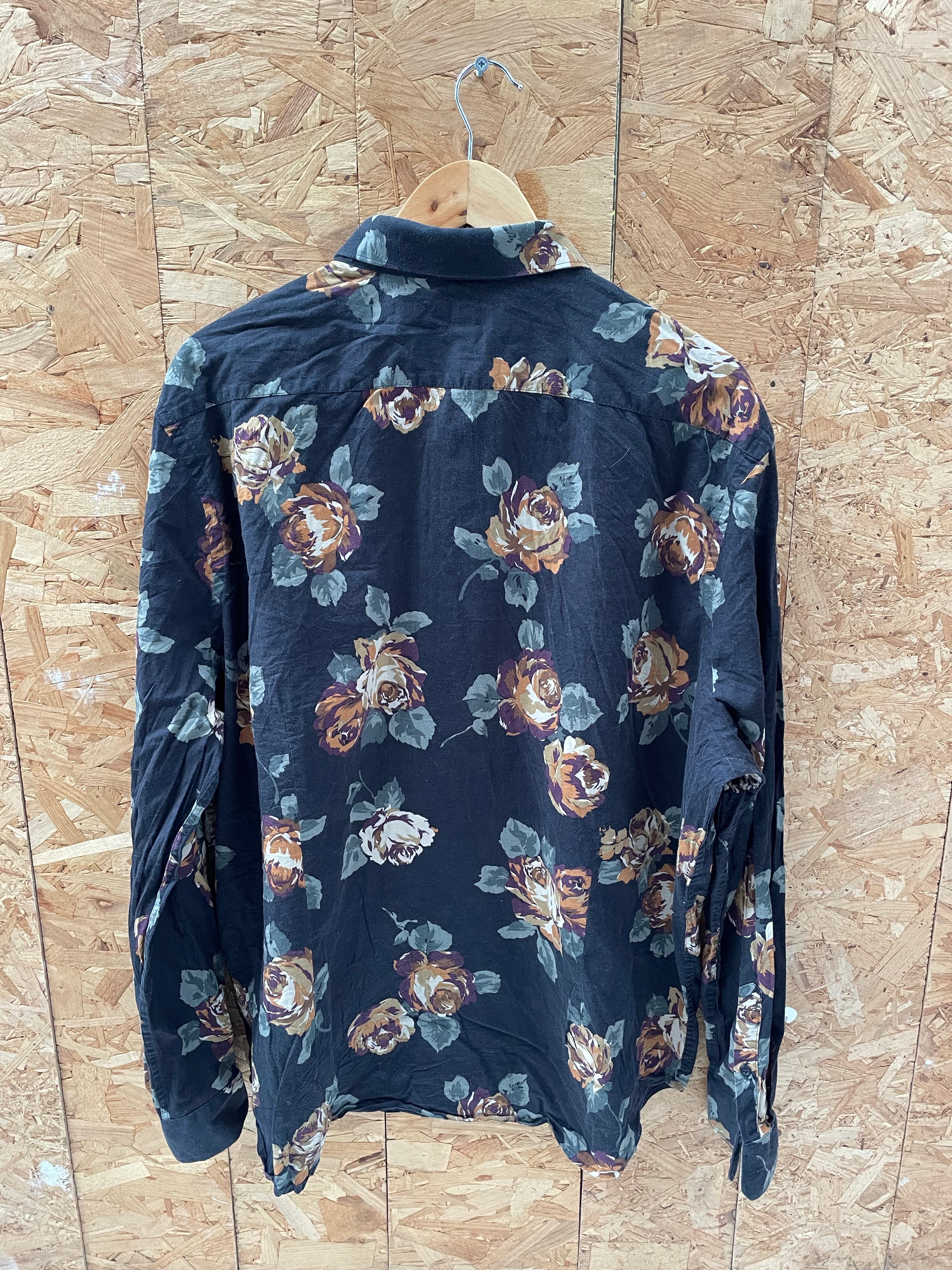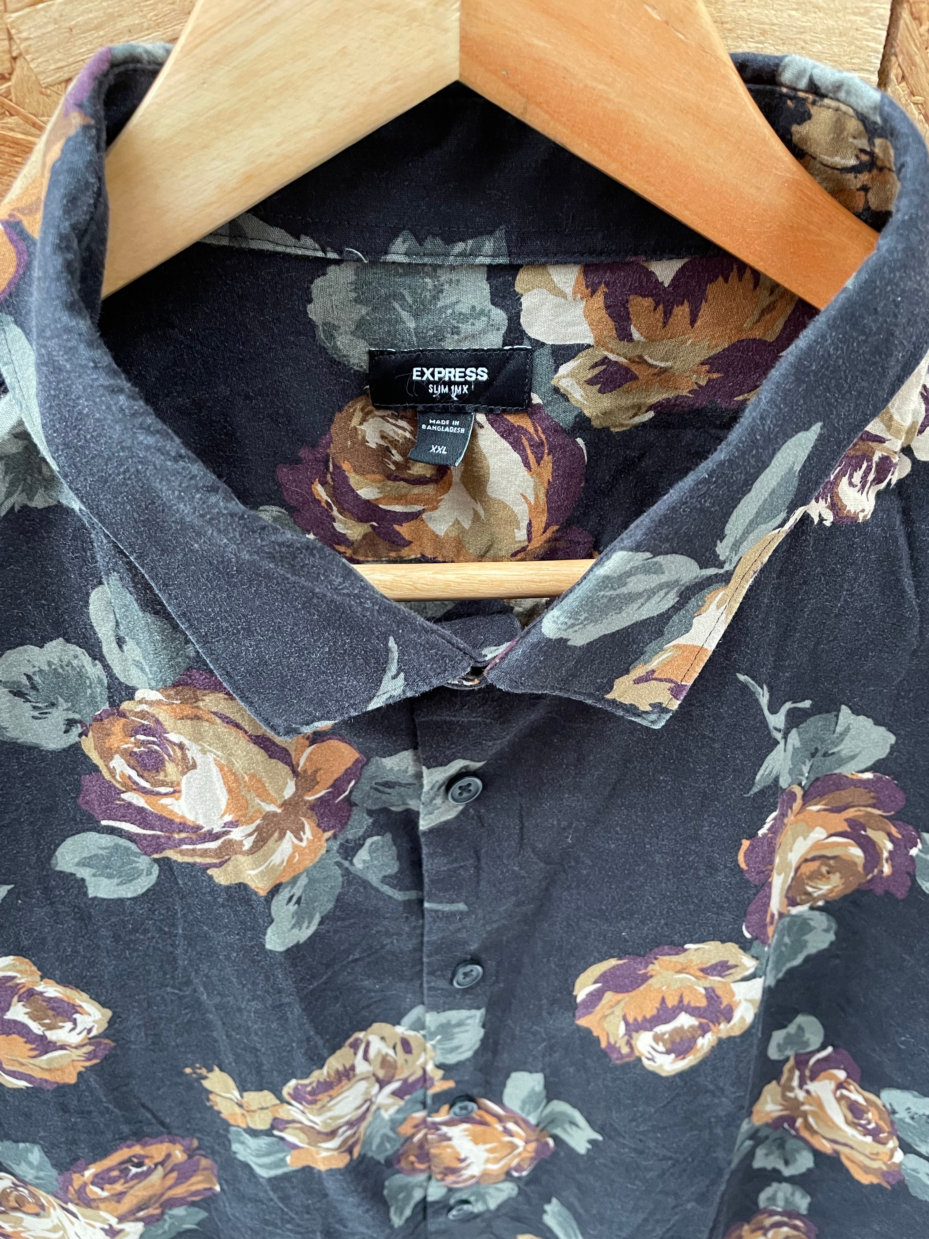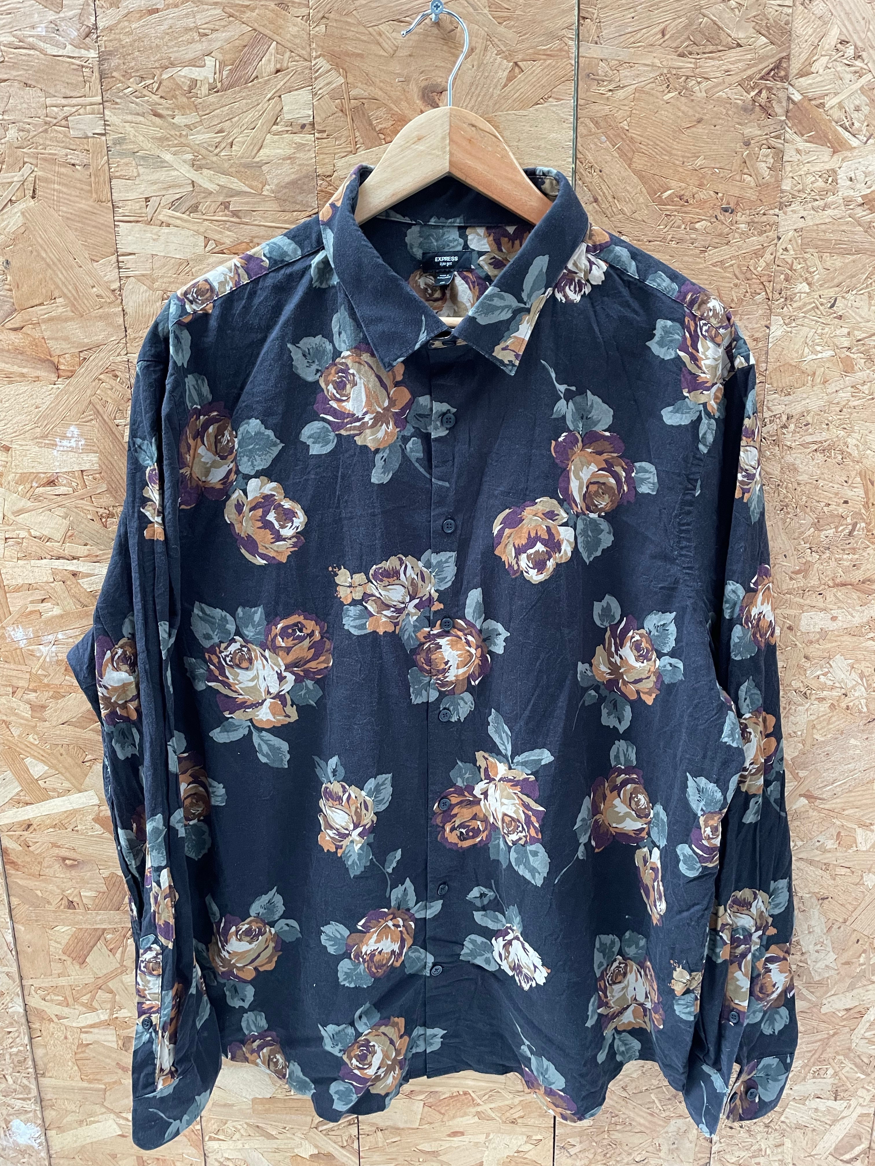 Express men's long sleeve button up shirt. XXL slim fit. Black background with a multicolor rose print. Excellent condition. Color: Black with Multicolor Floral.