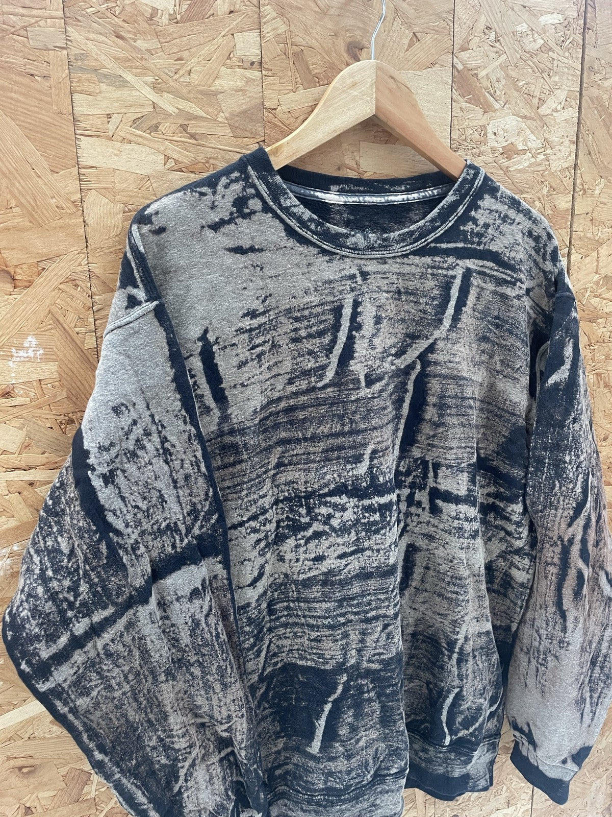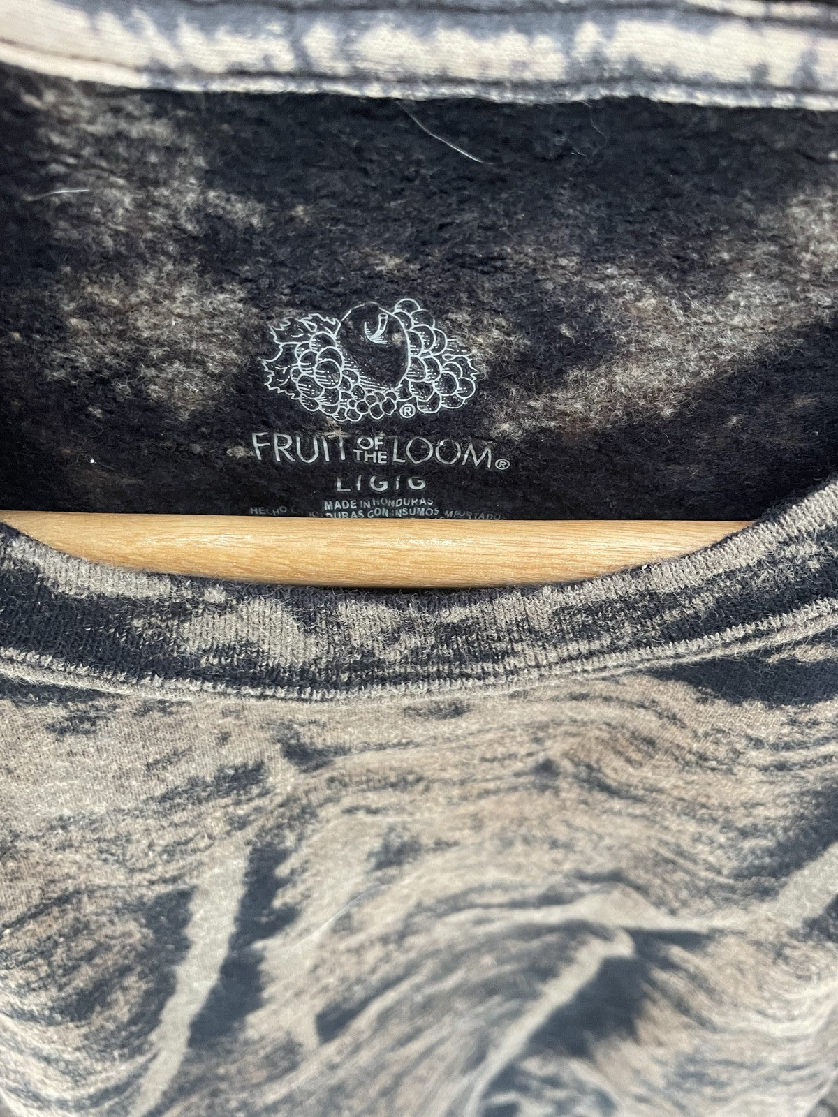 Vintage Fruit of the Loom tie-dye graphic sweatshirt in a size Large. Features a unique brown and black abstract pattern. Perfect for a retro or casual look. In good used condition with no visible damage.