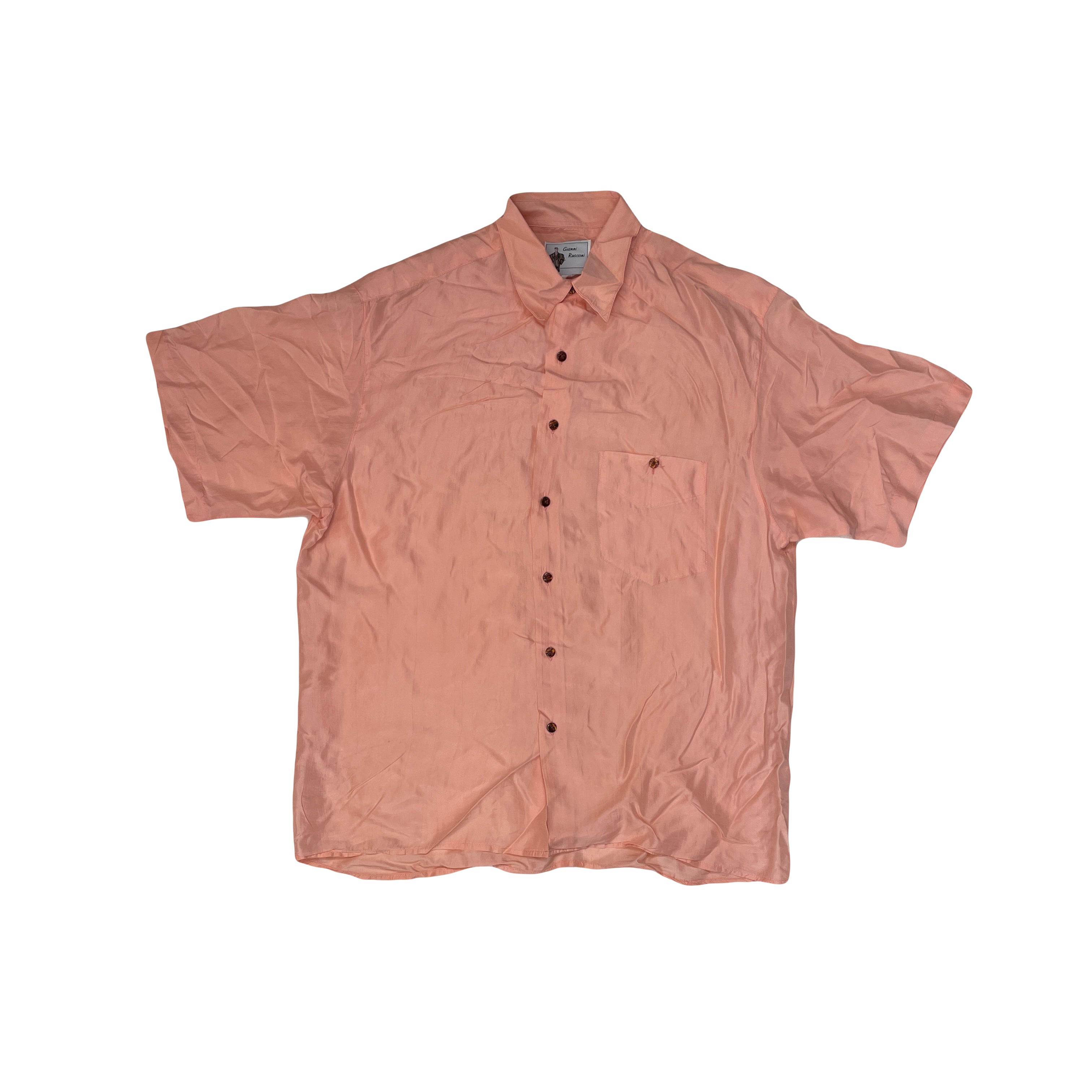 Vintage Gianni Rusconi short sleeve button-up shirt in a beautiful peach color. Made from a luxurious silk this shirt features a classic collar, a single chest pocket, and dark brown buttons. Perfect for a retro or casual look. Color: Peach.