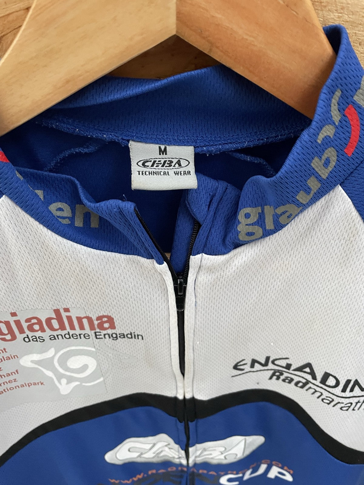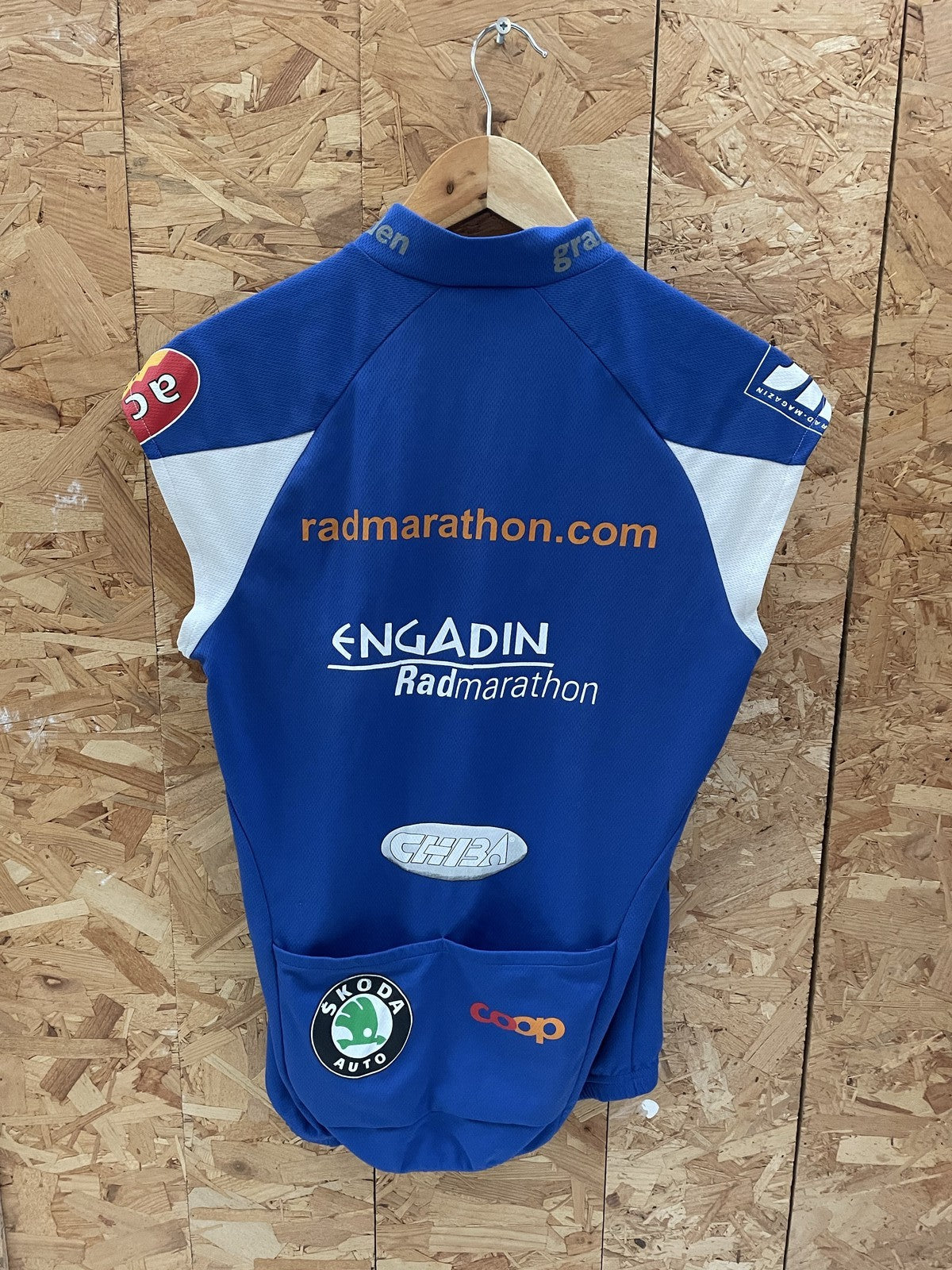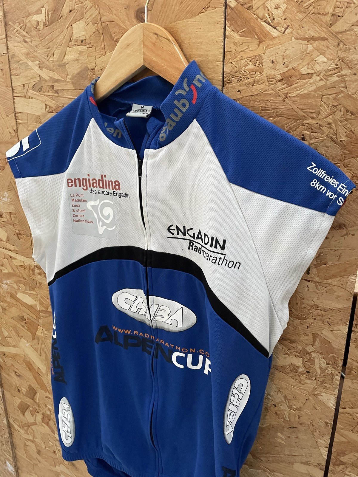 GIBBA Technical Wear cycling vest in blue and white. Features 'Engadin Radmarathon' and 'Alpen Cup' graphics. Full zip front. Lightweight and breathable for performance. Size M.