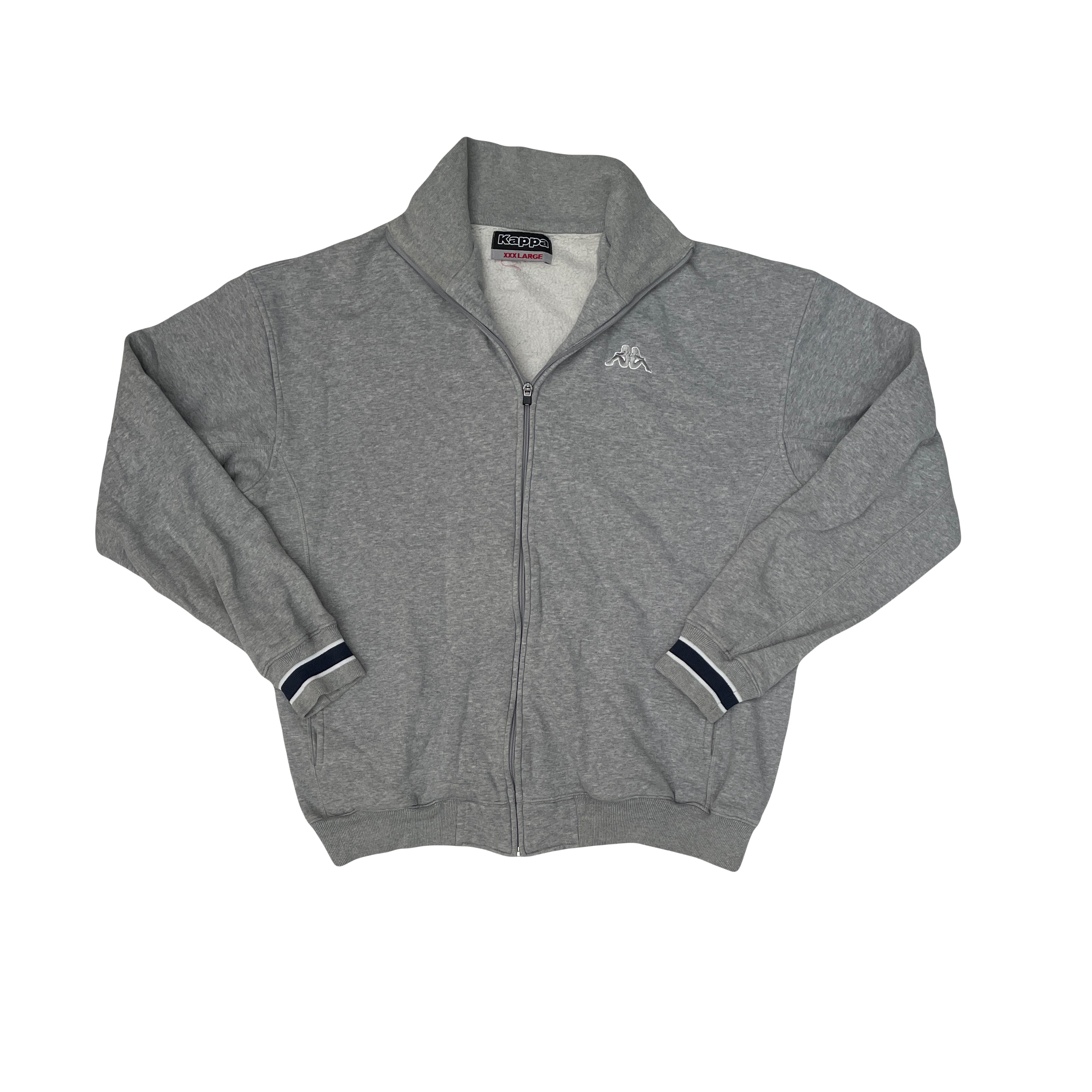Vintage Kappa track jacket in a grey color. Features the iconic Kappa logo embroidered on the chest and striped cuffs. This zip-up sweatshirt is perfect for athletic or casual wear. Size XXXL.