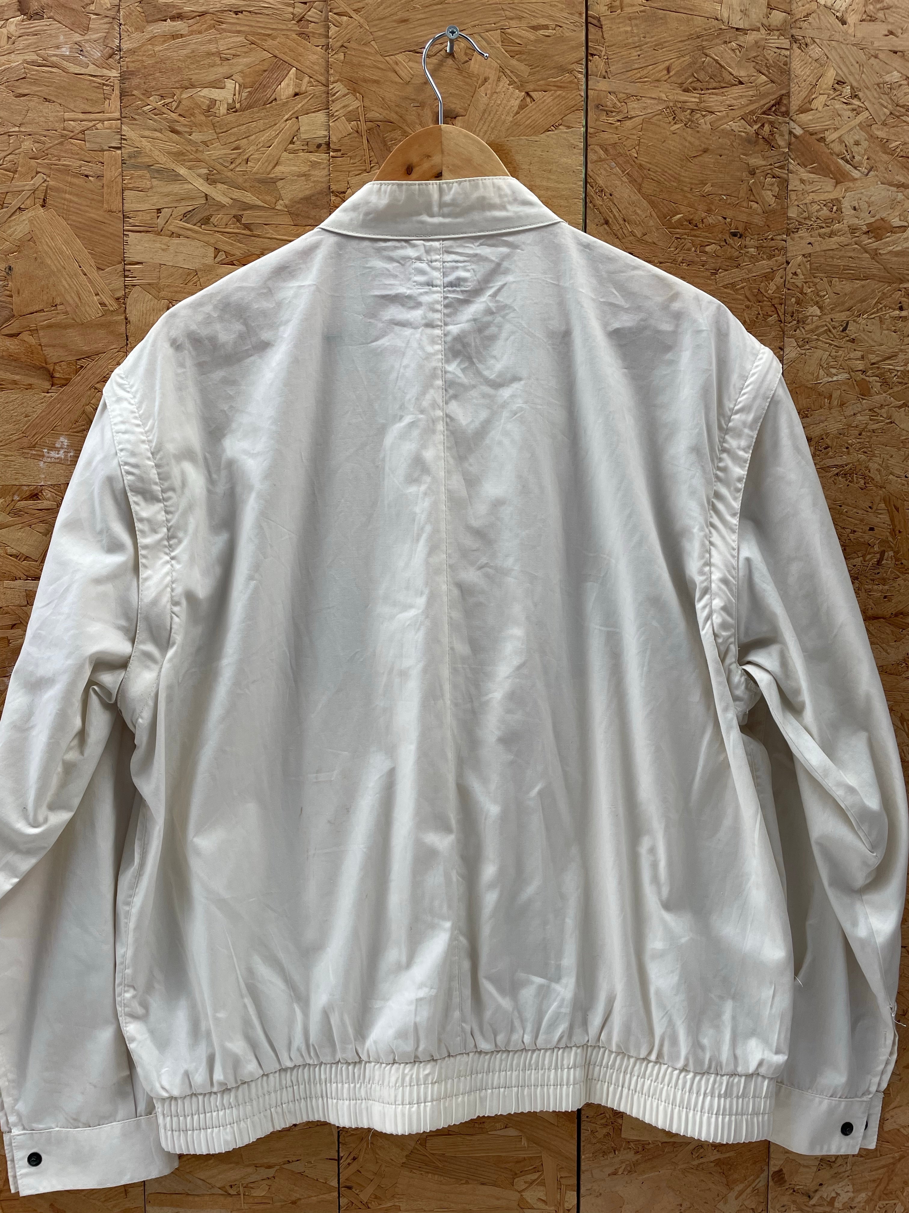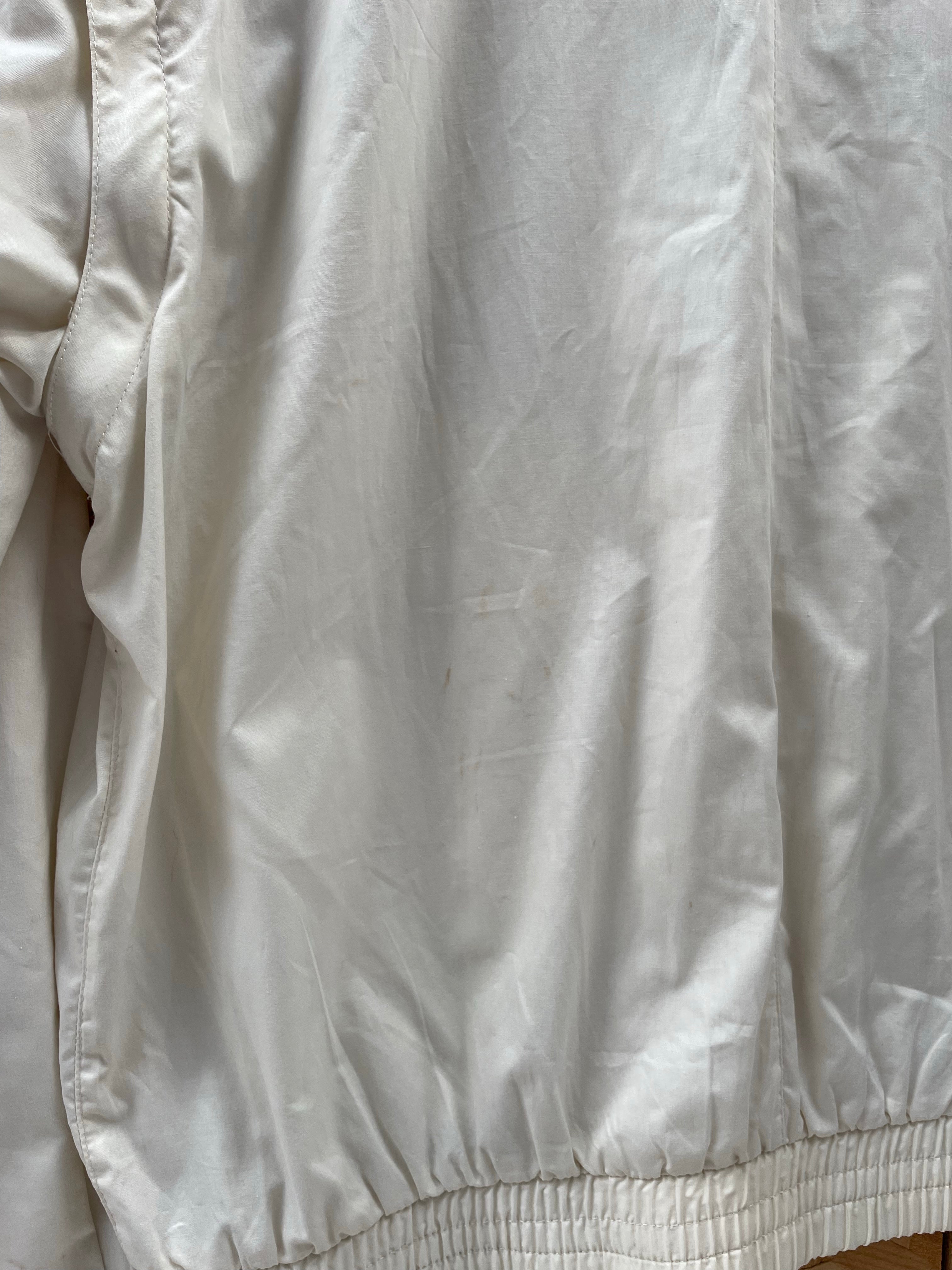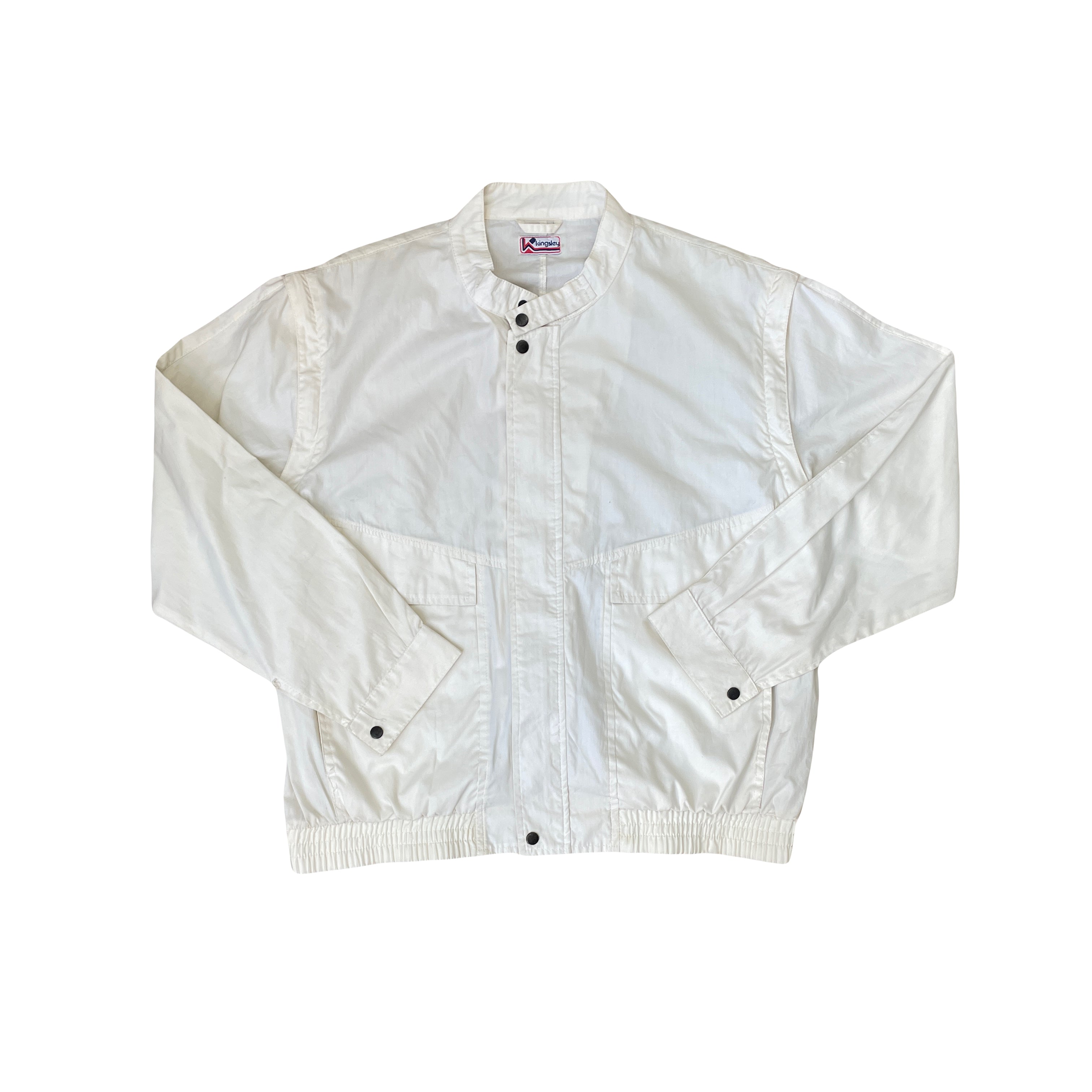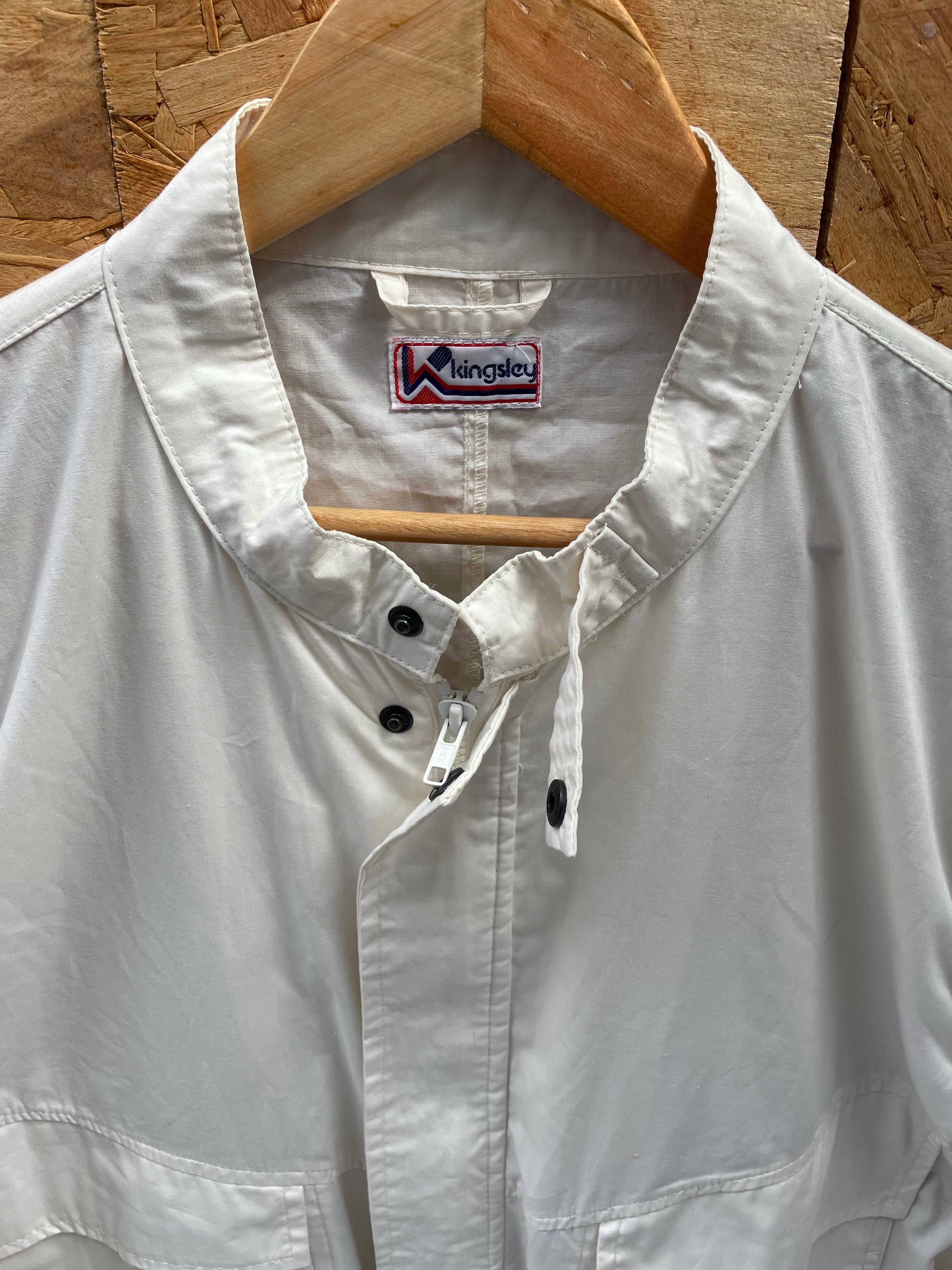 Vintage Kingsley-London jacket in white. Features a zip-up front, button accents, and pockets. Great condition, slight discoloration visible. Perfect for a retro look. Color: White.