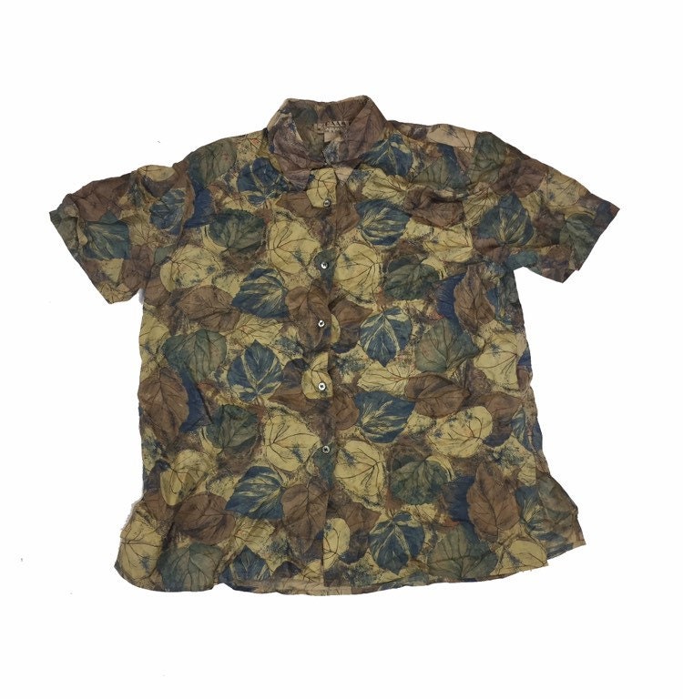 Ladies pure silk 90s autumn leaf print crazy abstract pattern oversized blouse size large with shoulder pads