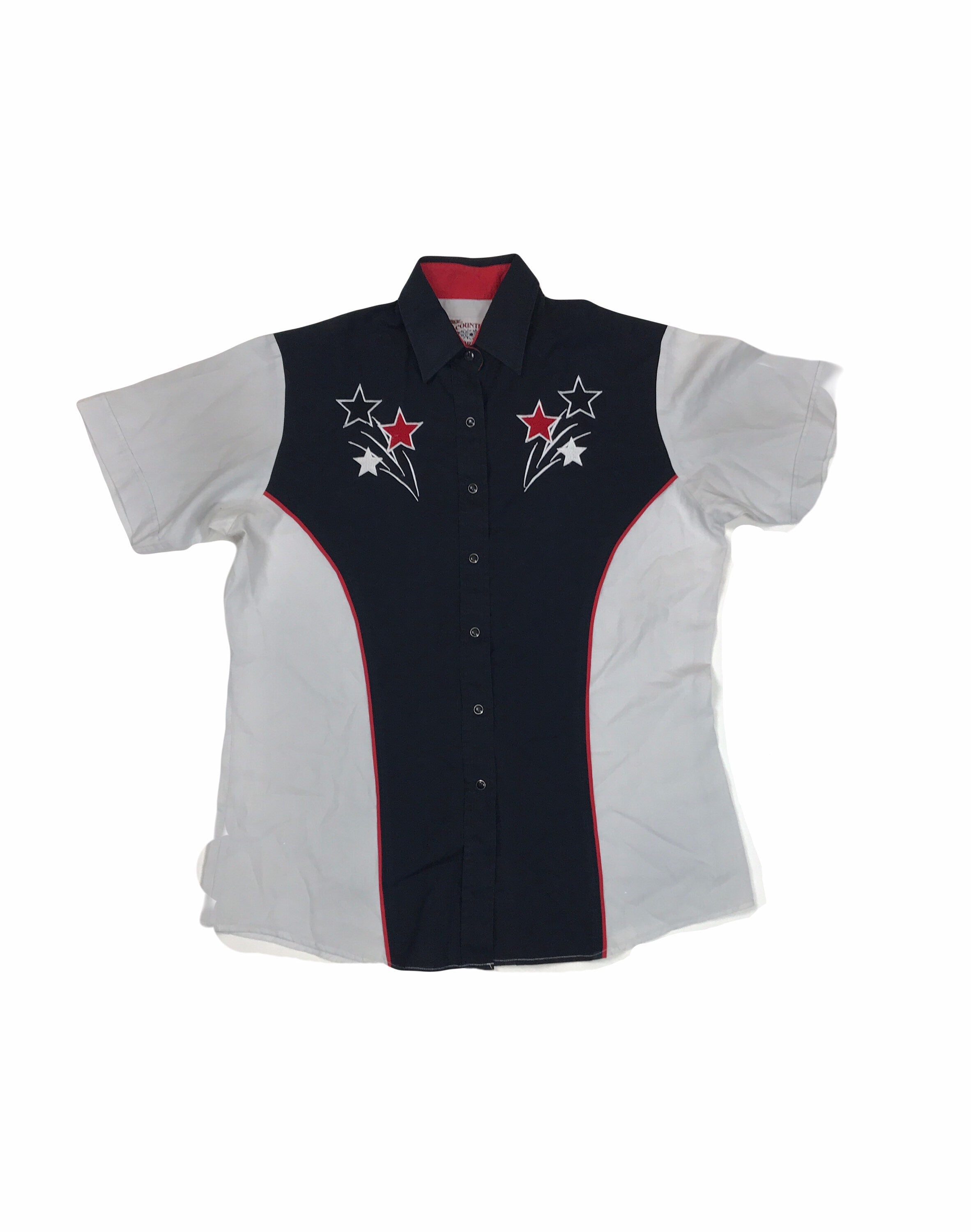 Country Charmers western blouse by Ely Cattleman. Features white red shooting stars motif embroidery & black pearl snap buttons.