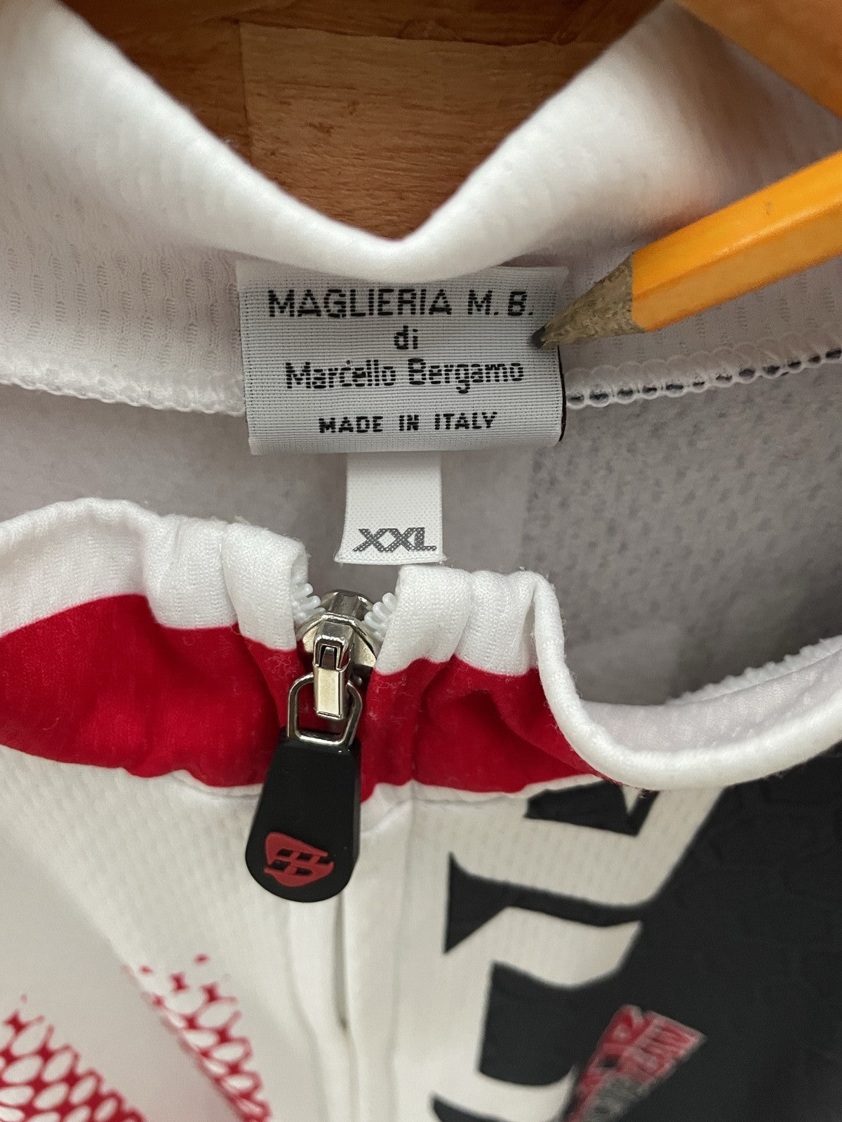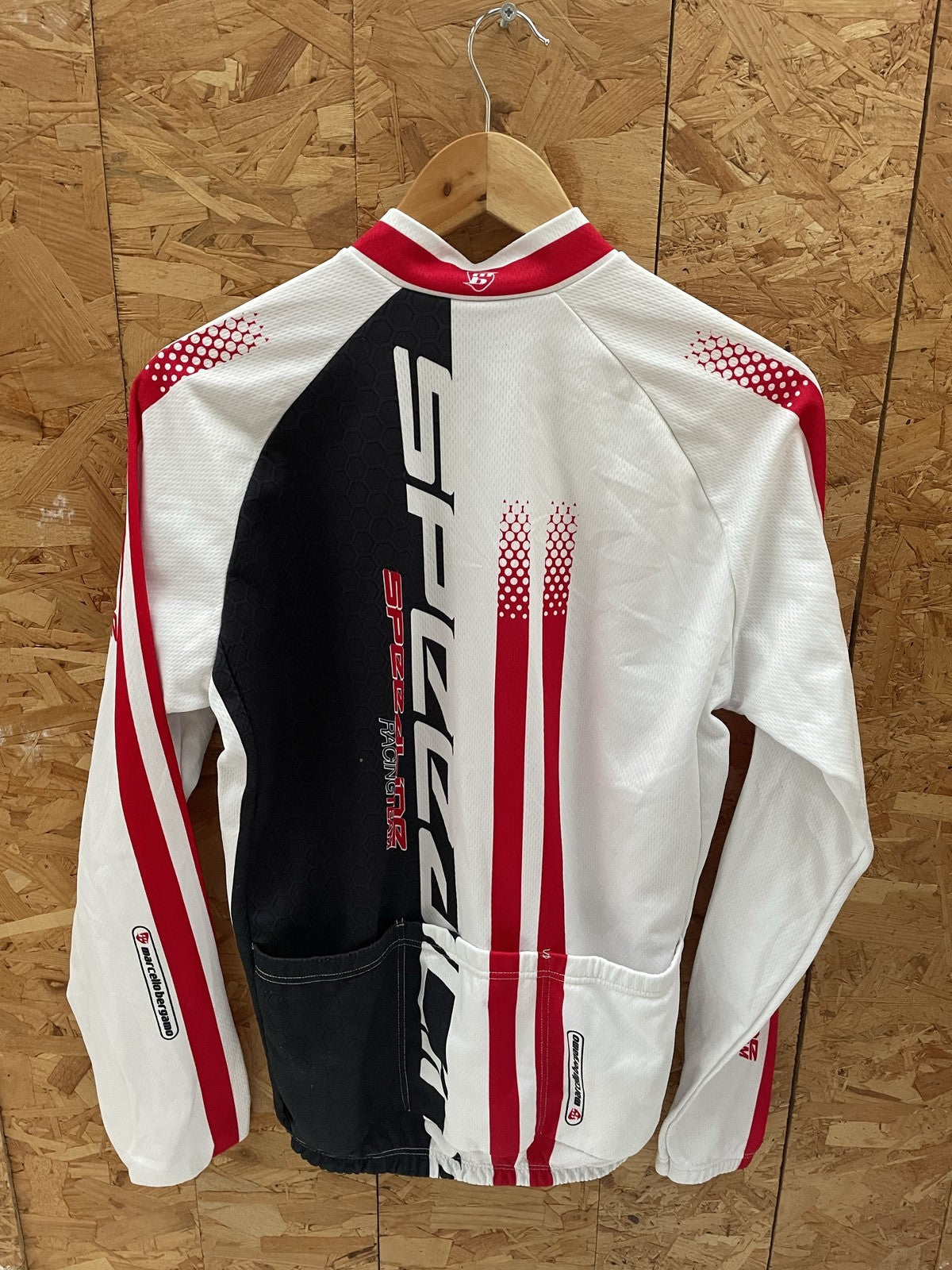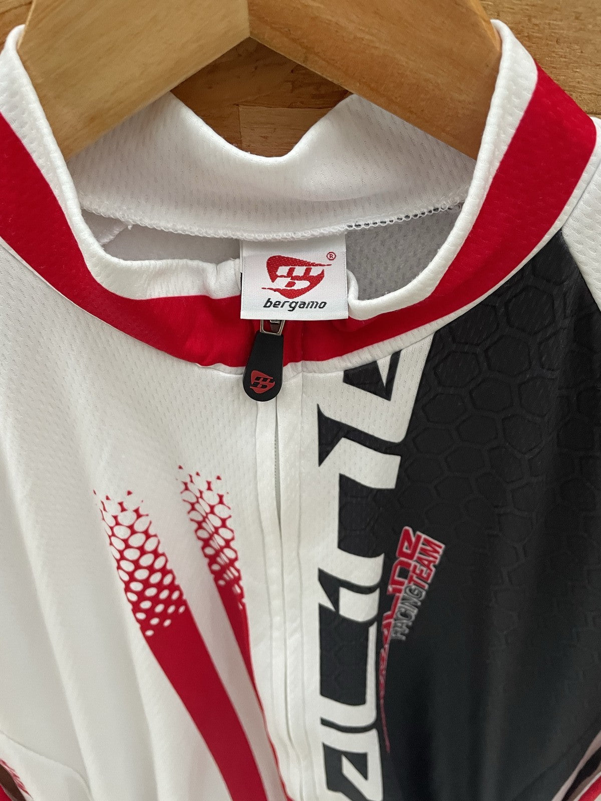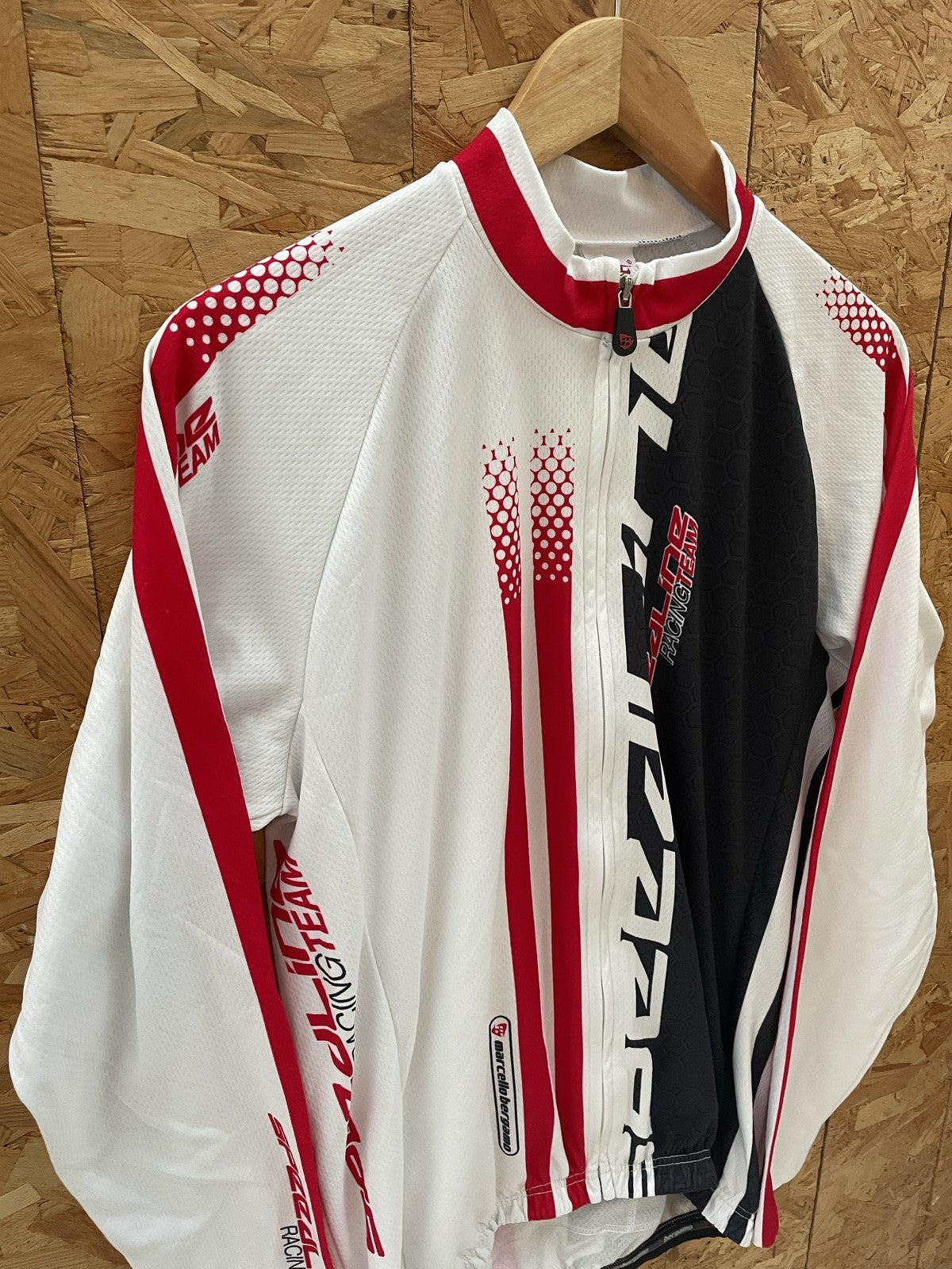High-performance long-sleeve cycling jacket from Marcello Bergamo's Racing Team collection. Features a striking white, red, and black color block design with bold 'Speedline Racing Team' graphics. Made in Italy, this jacket is designed for comfort and aer