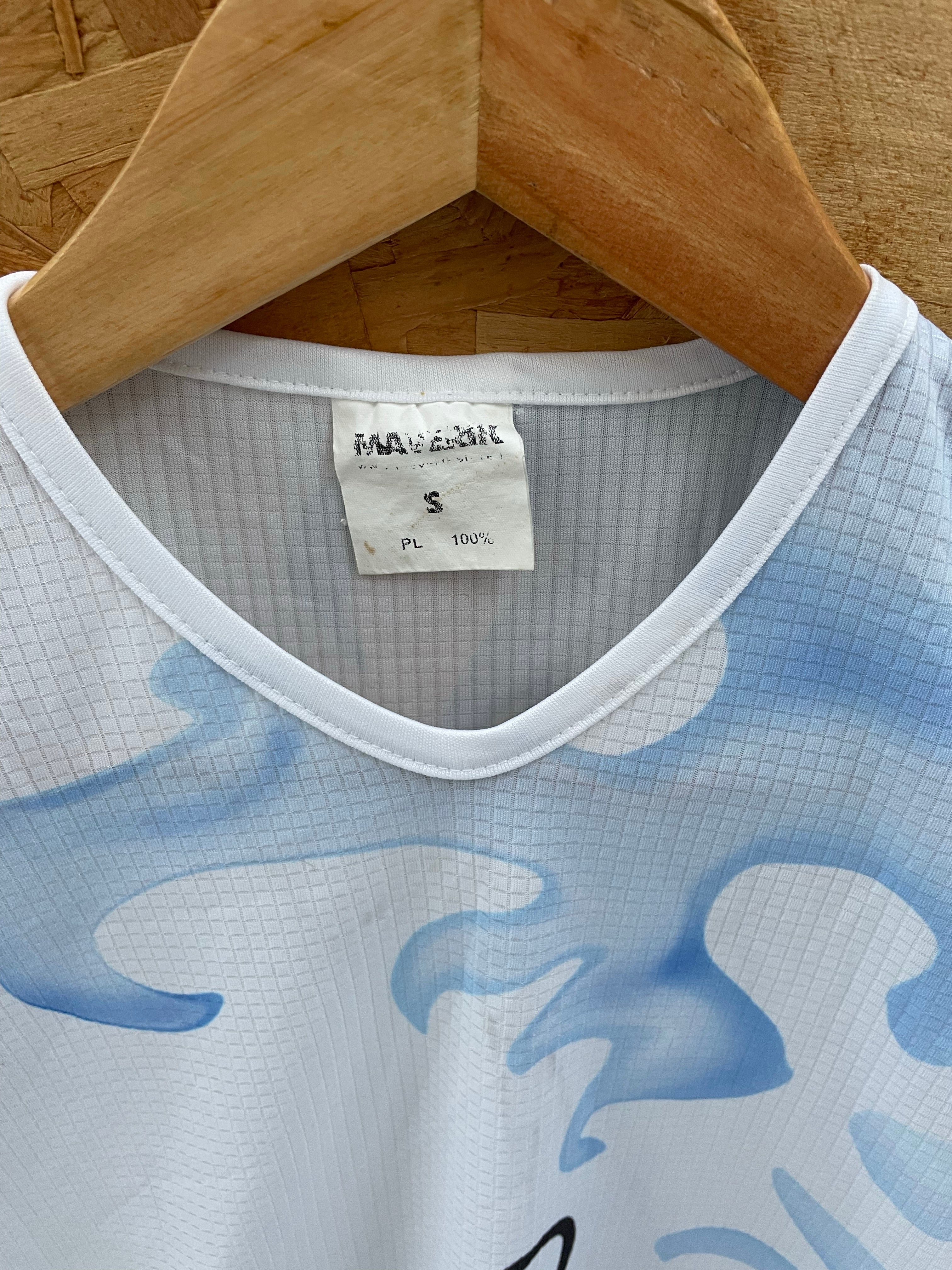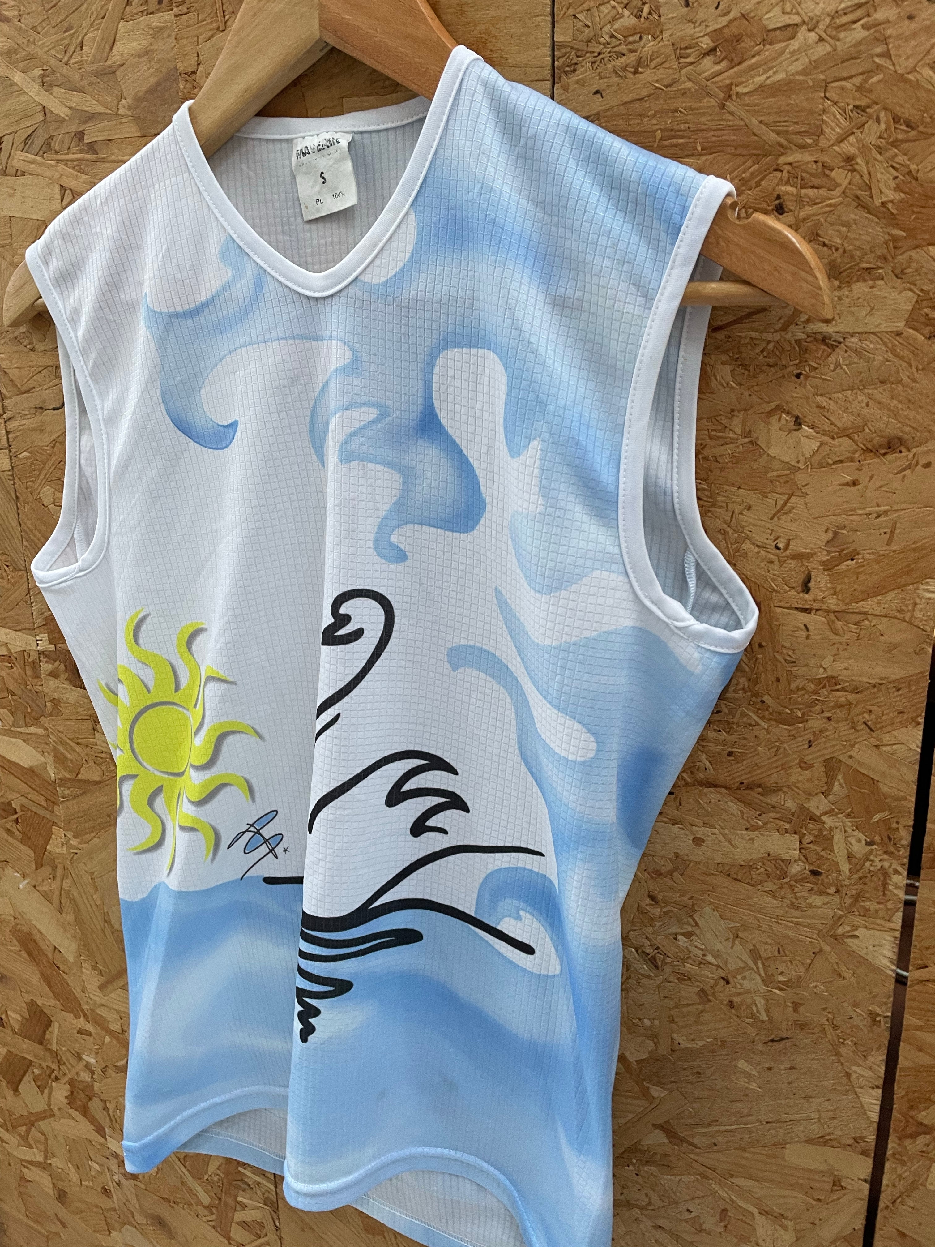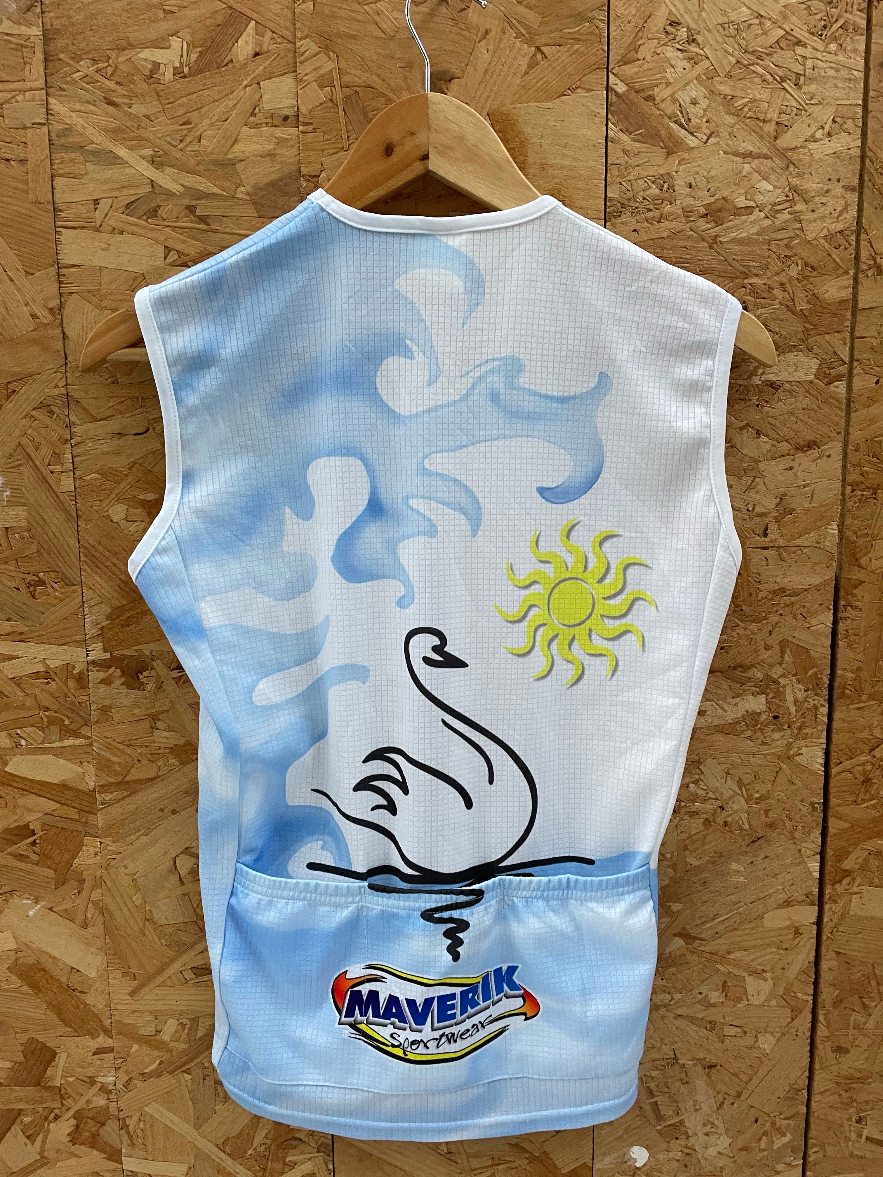 Lightweight athletic sleeveless shirt from Maverik. Features a vibrant graphic with a sun and swan design on a blue wave background. Perfect for sports or casual wear. Size S. Color: White, Blue, Yellow. Size: S
