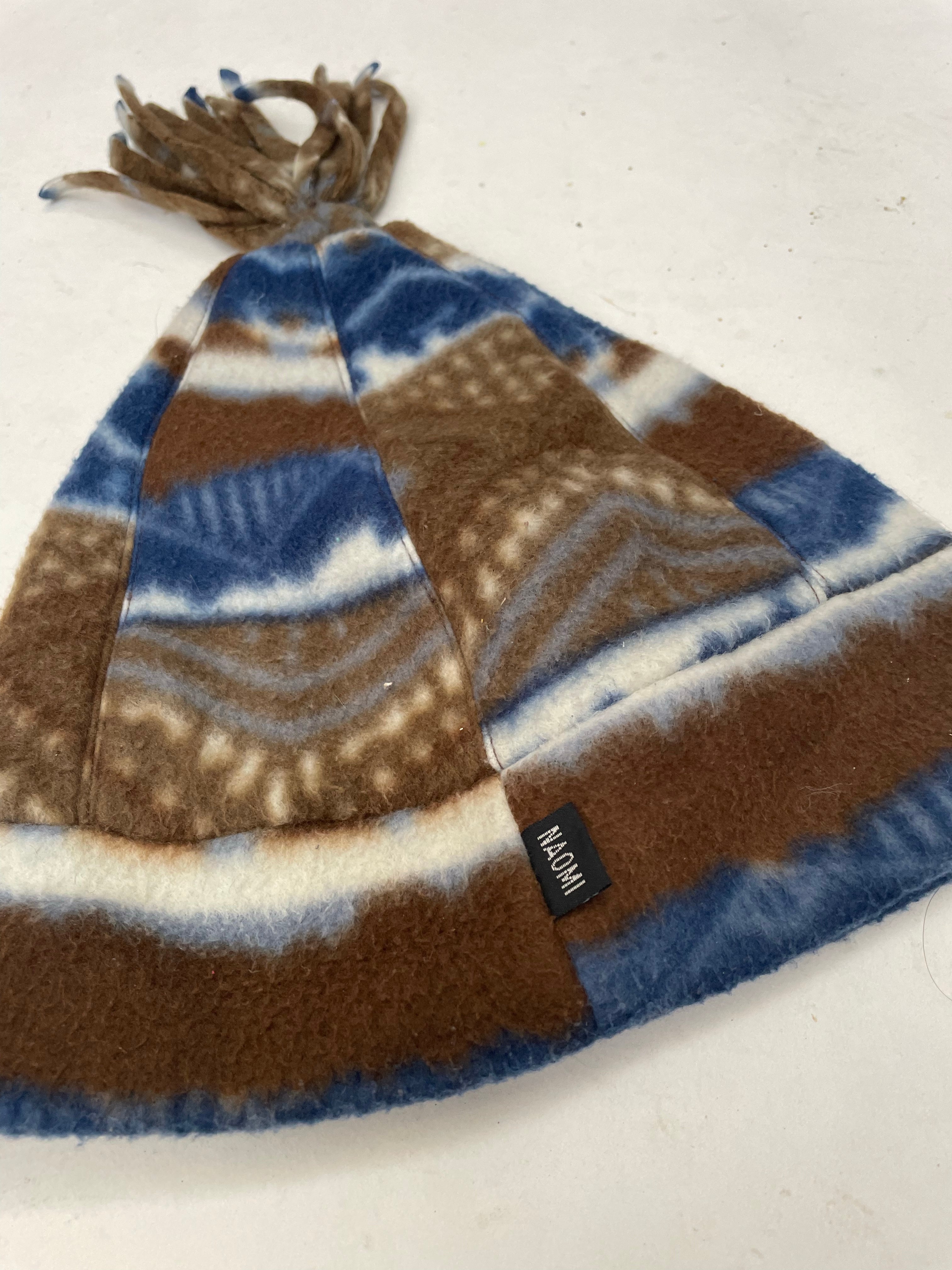 Cozy fleece beanie hat by Naomi featuring a unique tie-dye pattern in blue, brown, and white. This hat has a playful tassel on top and is perfect for keeping warm during colder months. One size fits most. Color: Blue/Brown/White.