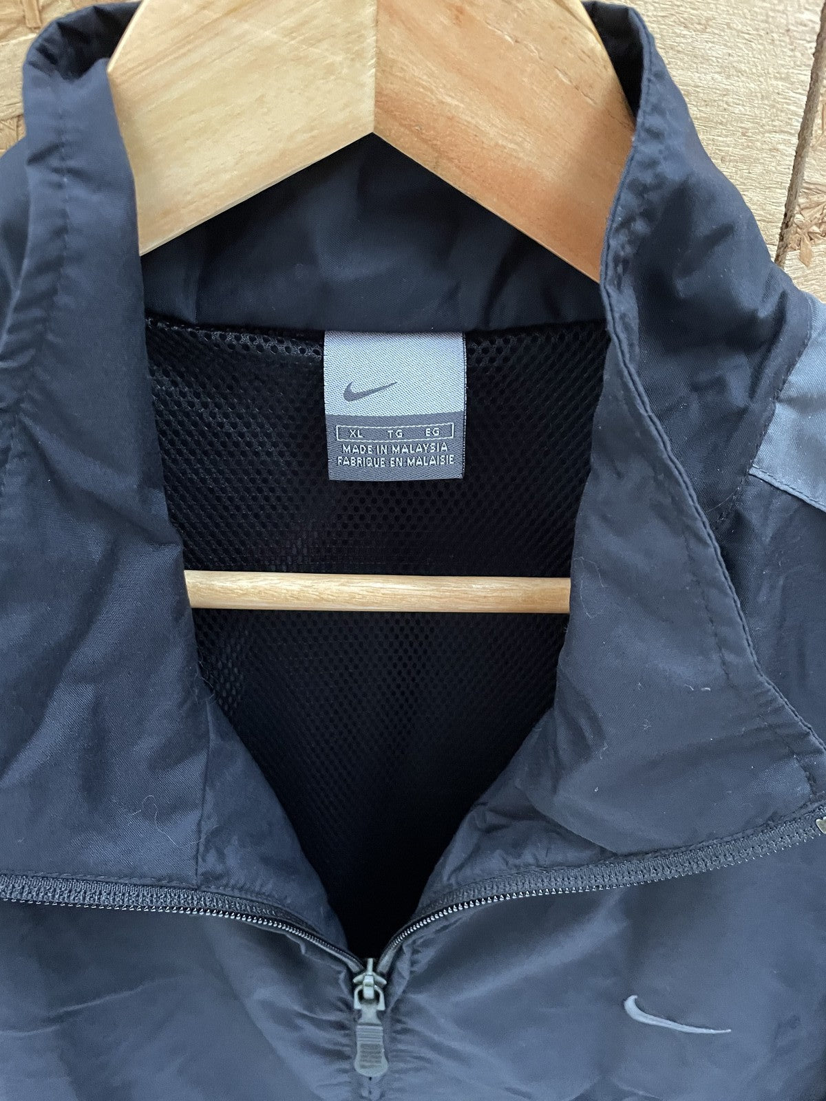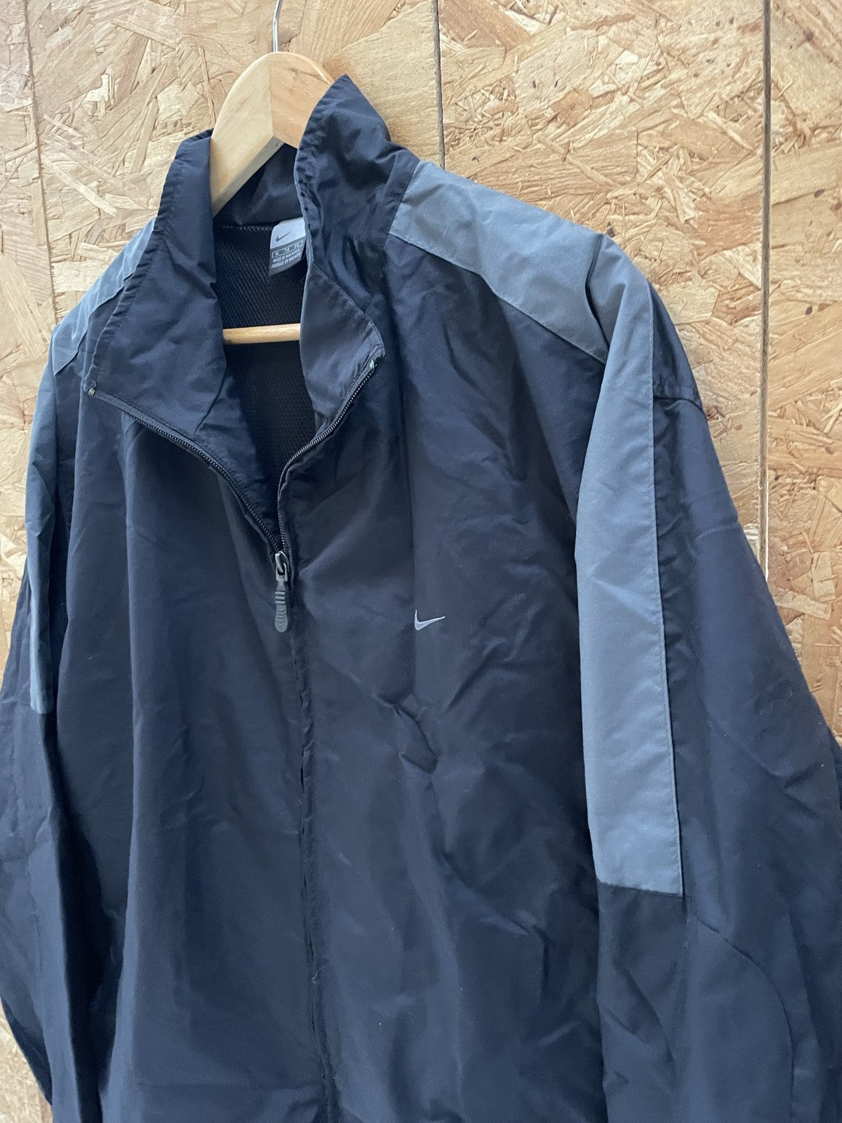 Lightweight Nike track jacket in black with grey accents. Features a full zip closure and a classic sportswear design. Ideal for athletic activities or casual wear. Size XL.