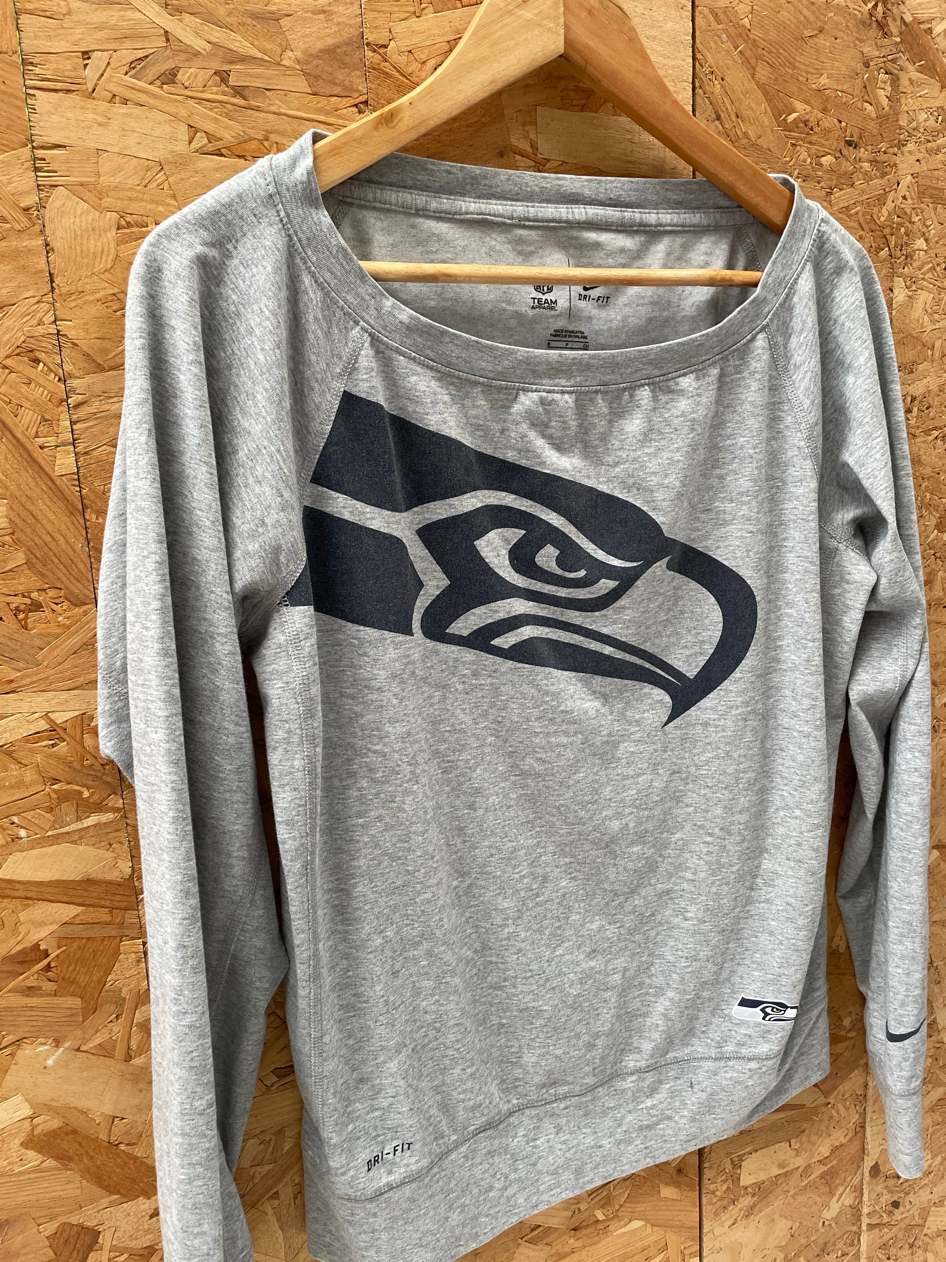 Nike NFL Seattle Seahawks gray long sleeve shirt. Size small. slouchy neckline, Features a large Seahawks logo on the front. Good condition. Color: Gray.