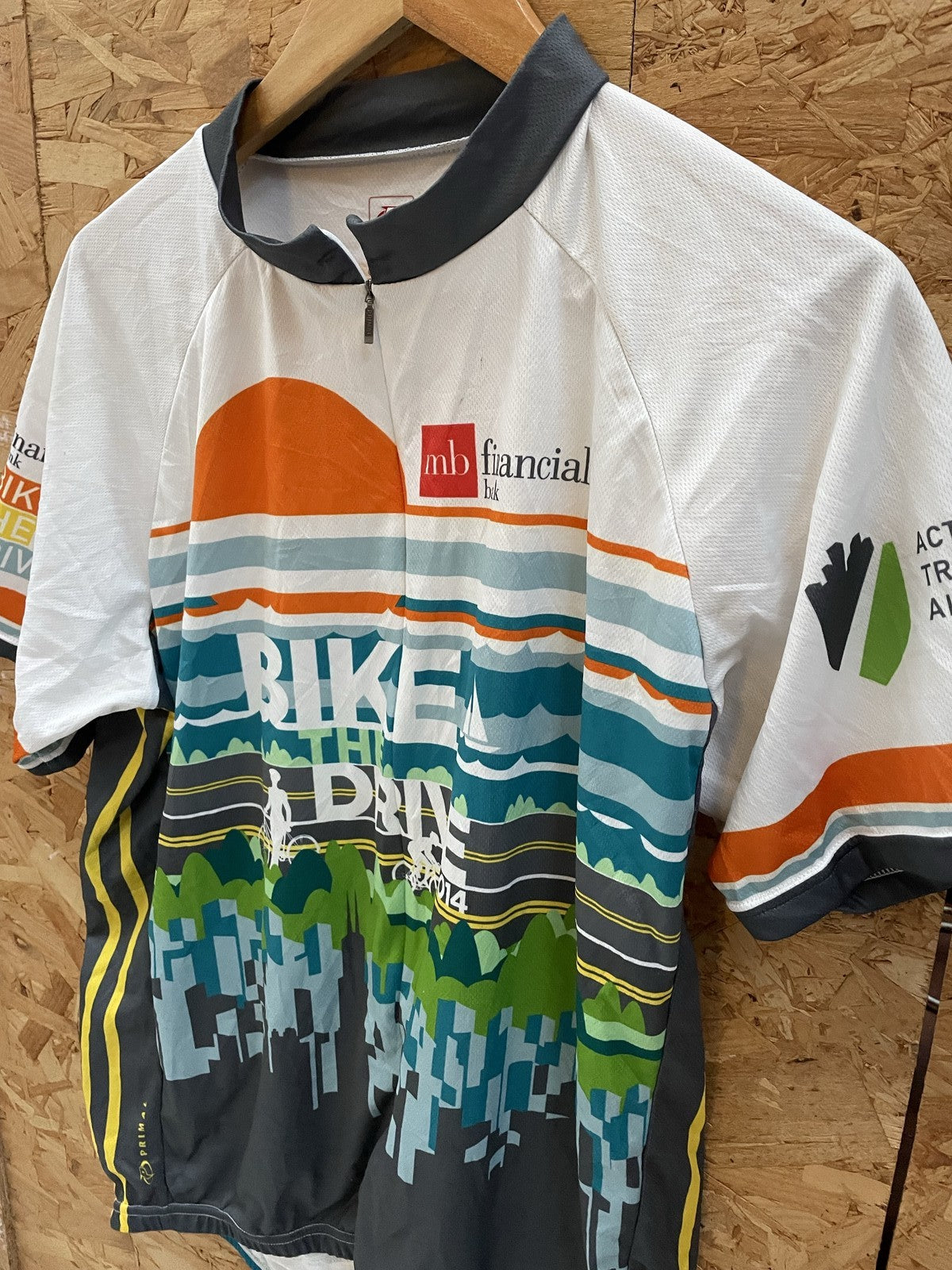 This Primal cycling jersey is perfect for any cycling enthusiast. Featuring a vibrant "Bike the Drive" graphic from 2014 and sponsored by MB Financial Bank, this jersey is both stylish and functional. Made with breathable fabric for comfort during long ri