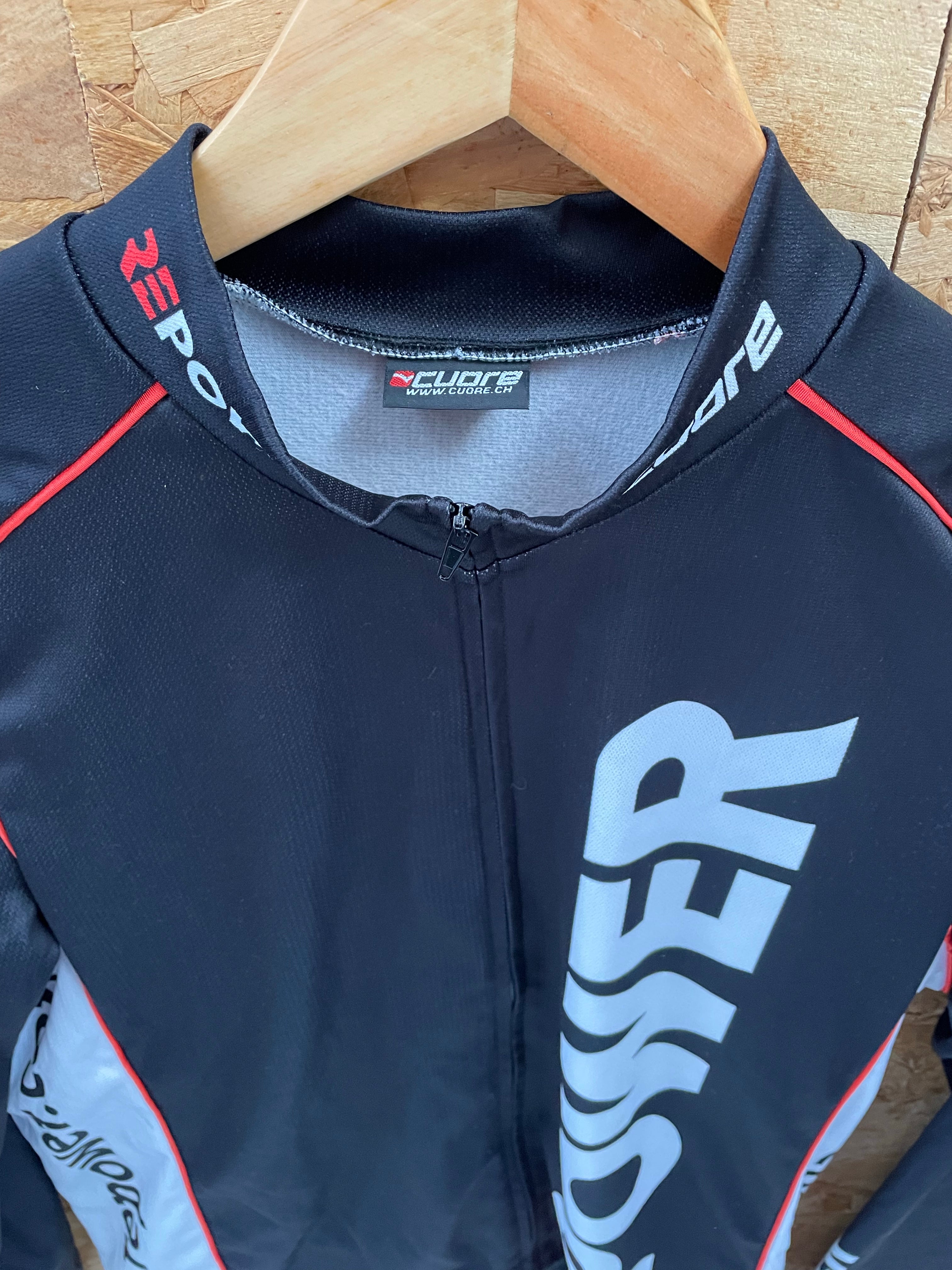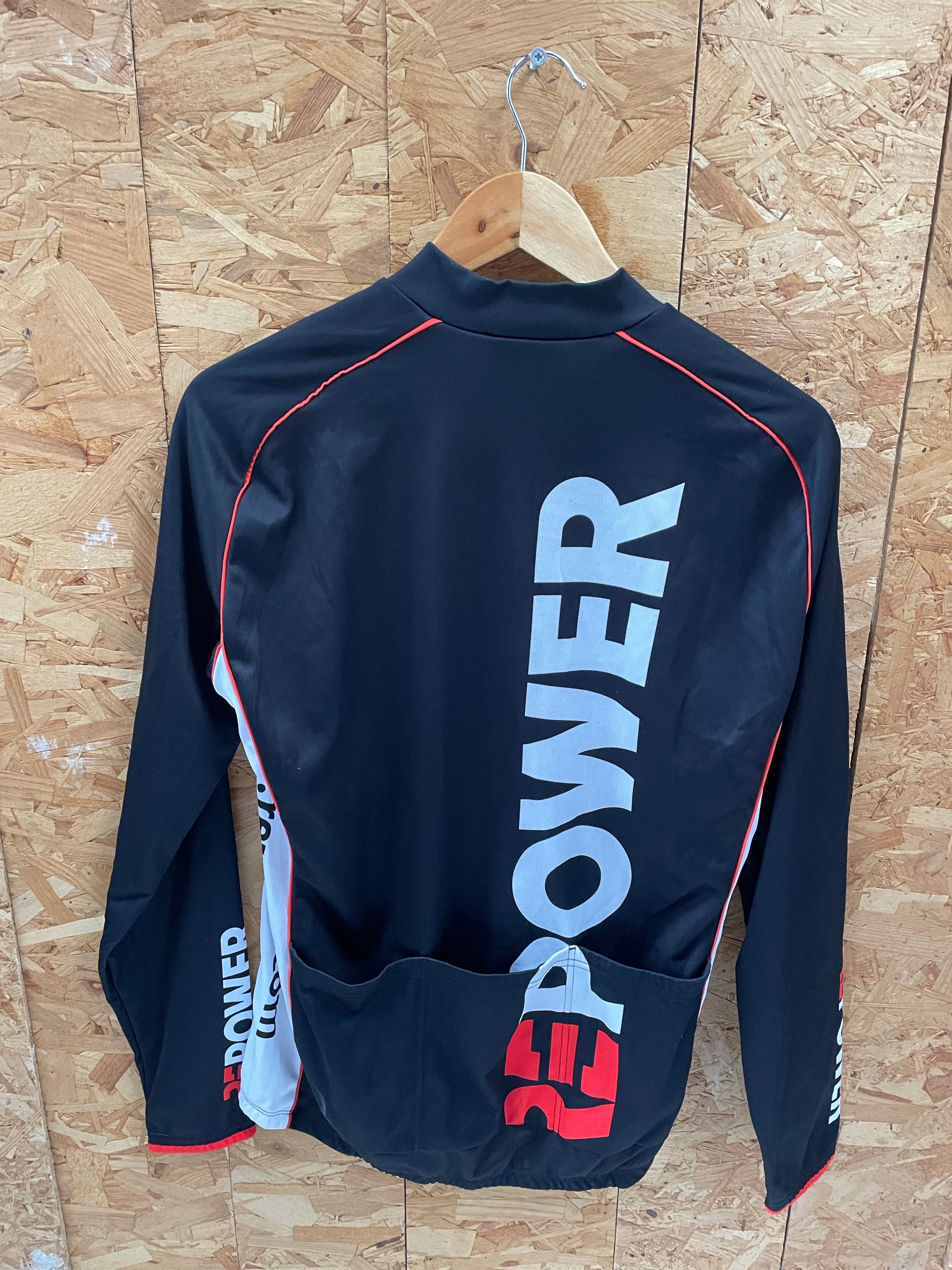 RePower long sleeve cycling jersey in black with red and white accents. Features a full zip front and bold REPOWER branding. Ideal for athletic activities. Color: Black, Red, White. Size: L