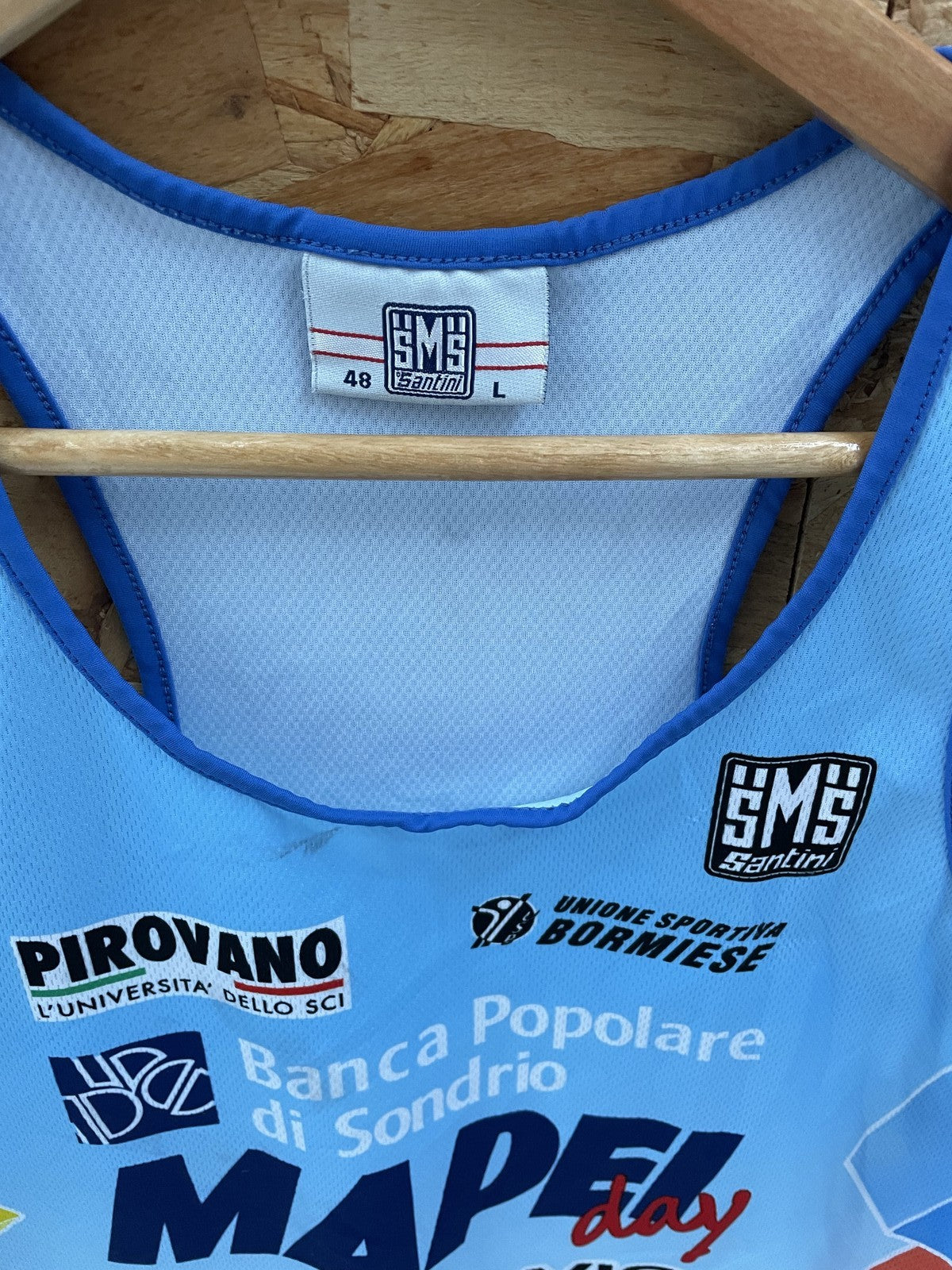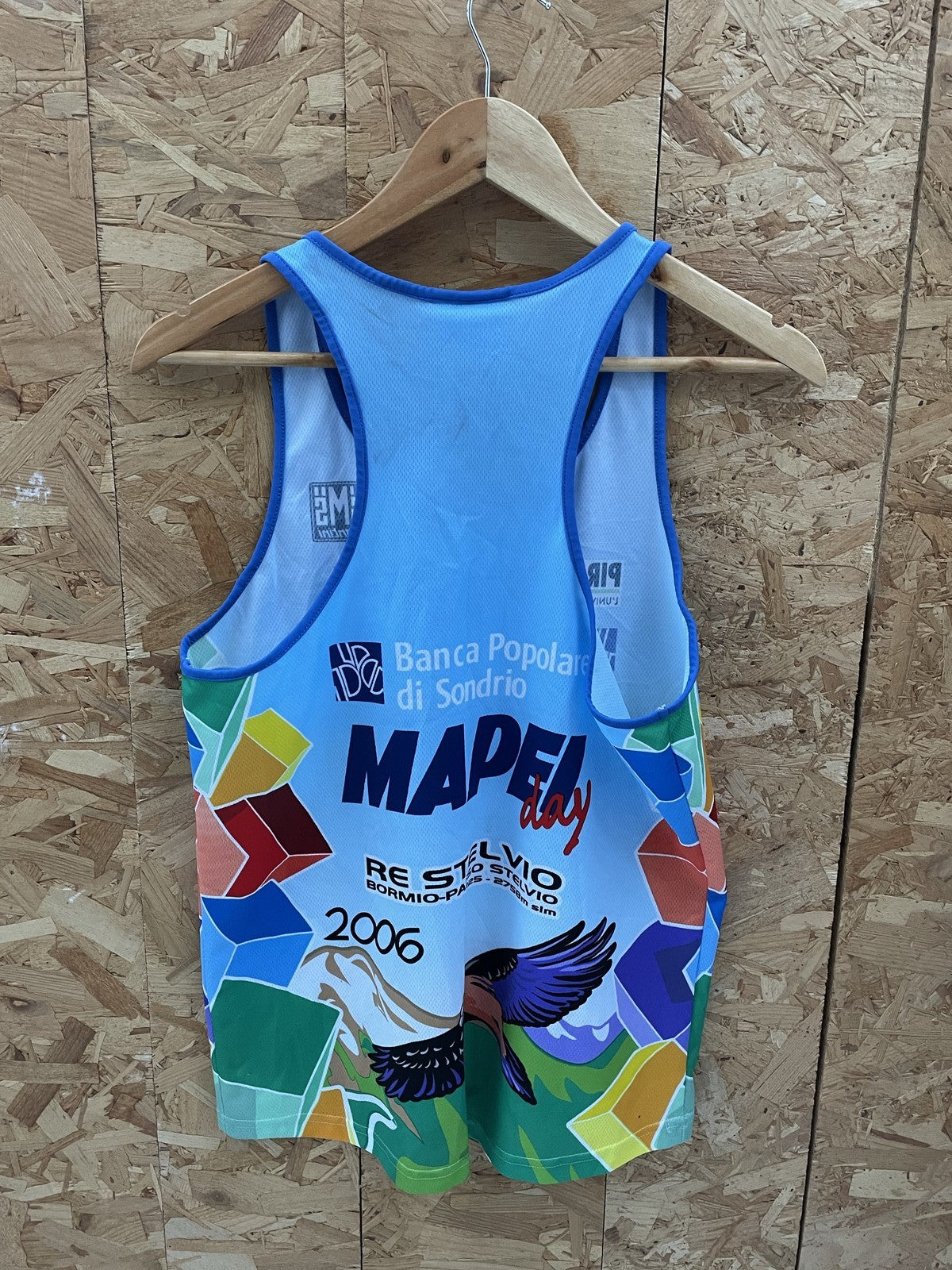 Vintage Santini Mapei cycling jersey tank top from the 2006 race event. Features a vibrant blue base with colorful geometric patterns and bird graphic. Size L. Perfect for collectors or cycling enthusiasts.