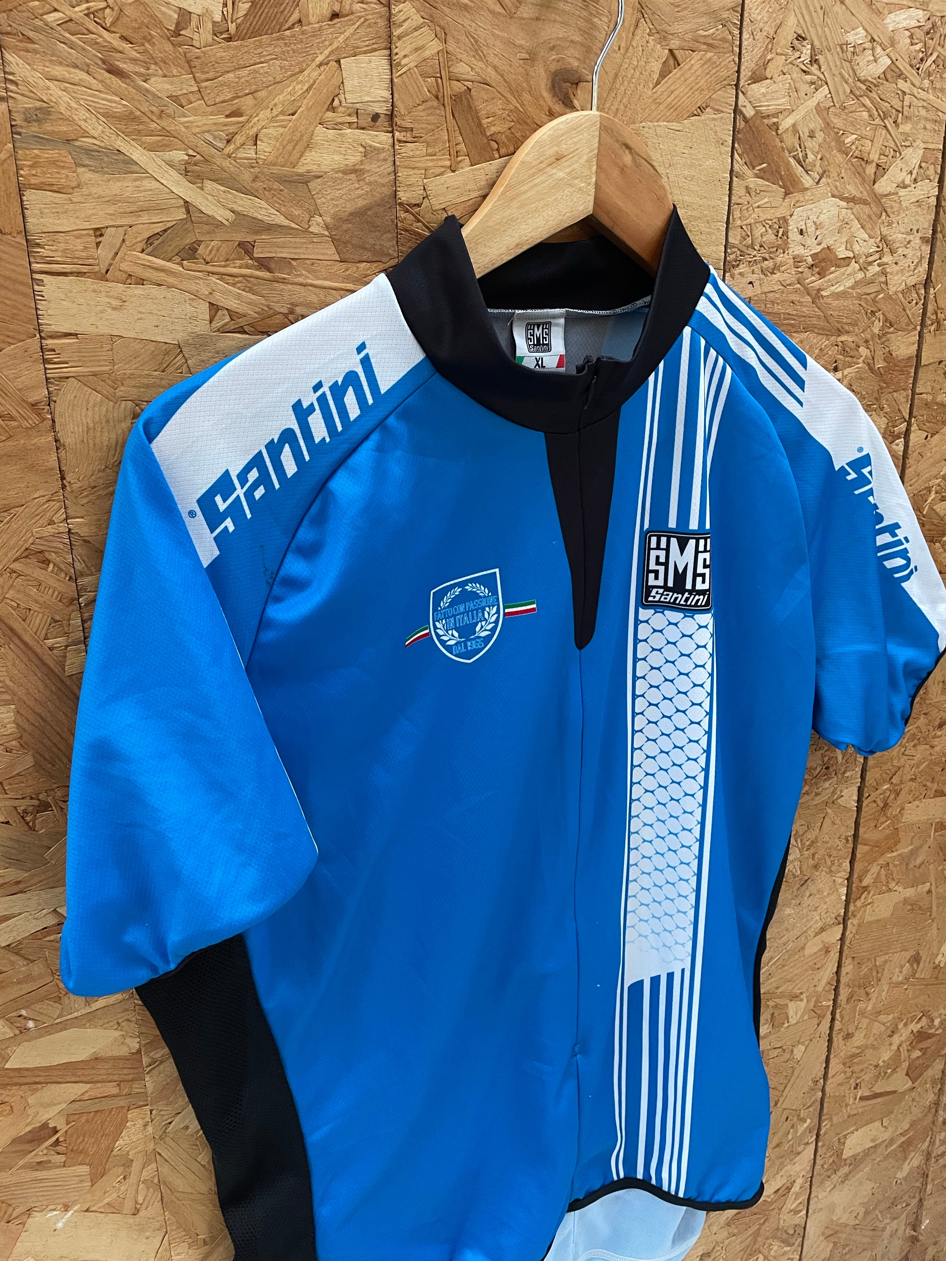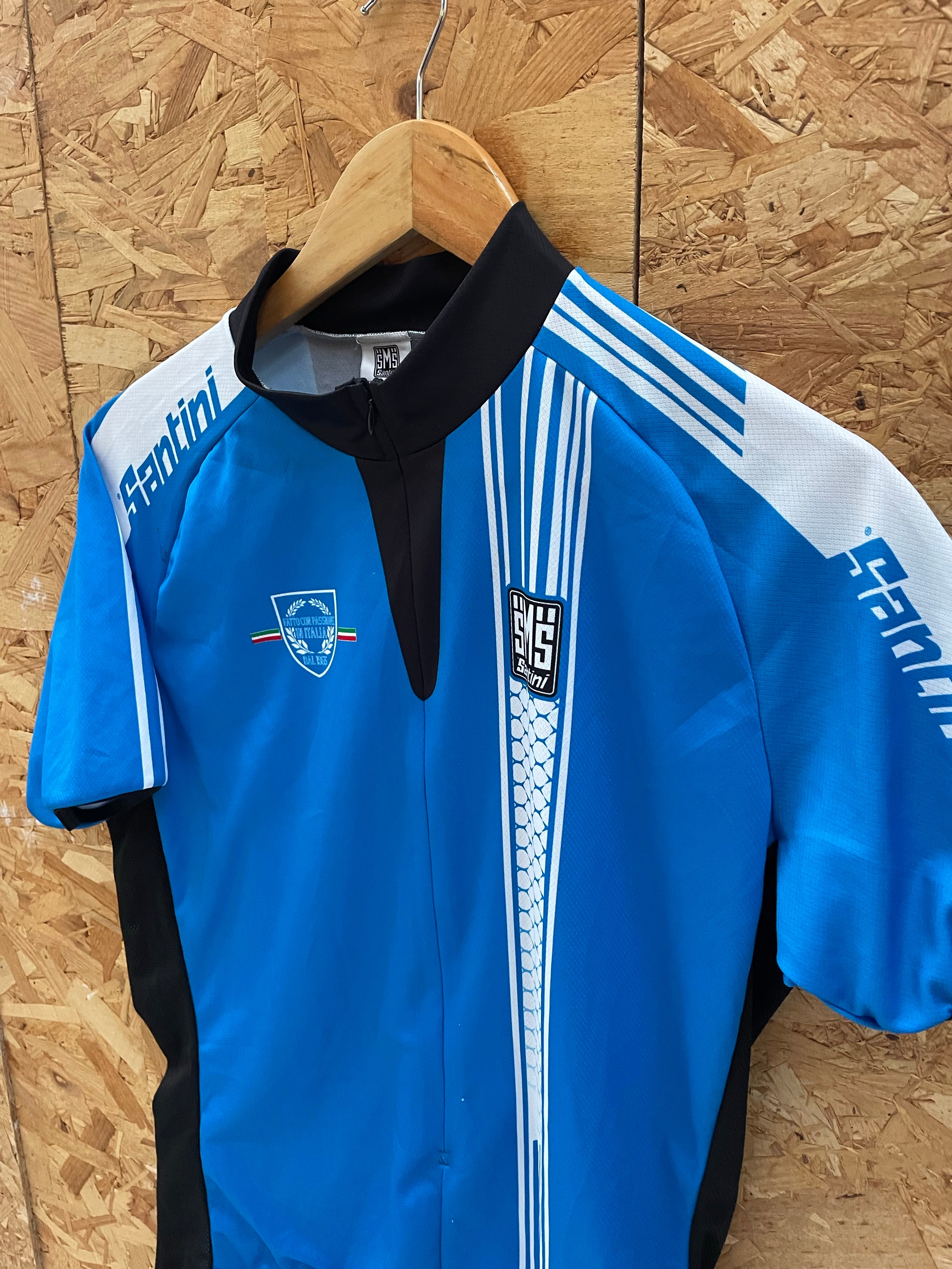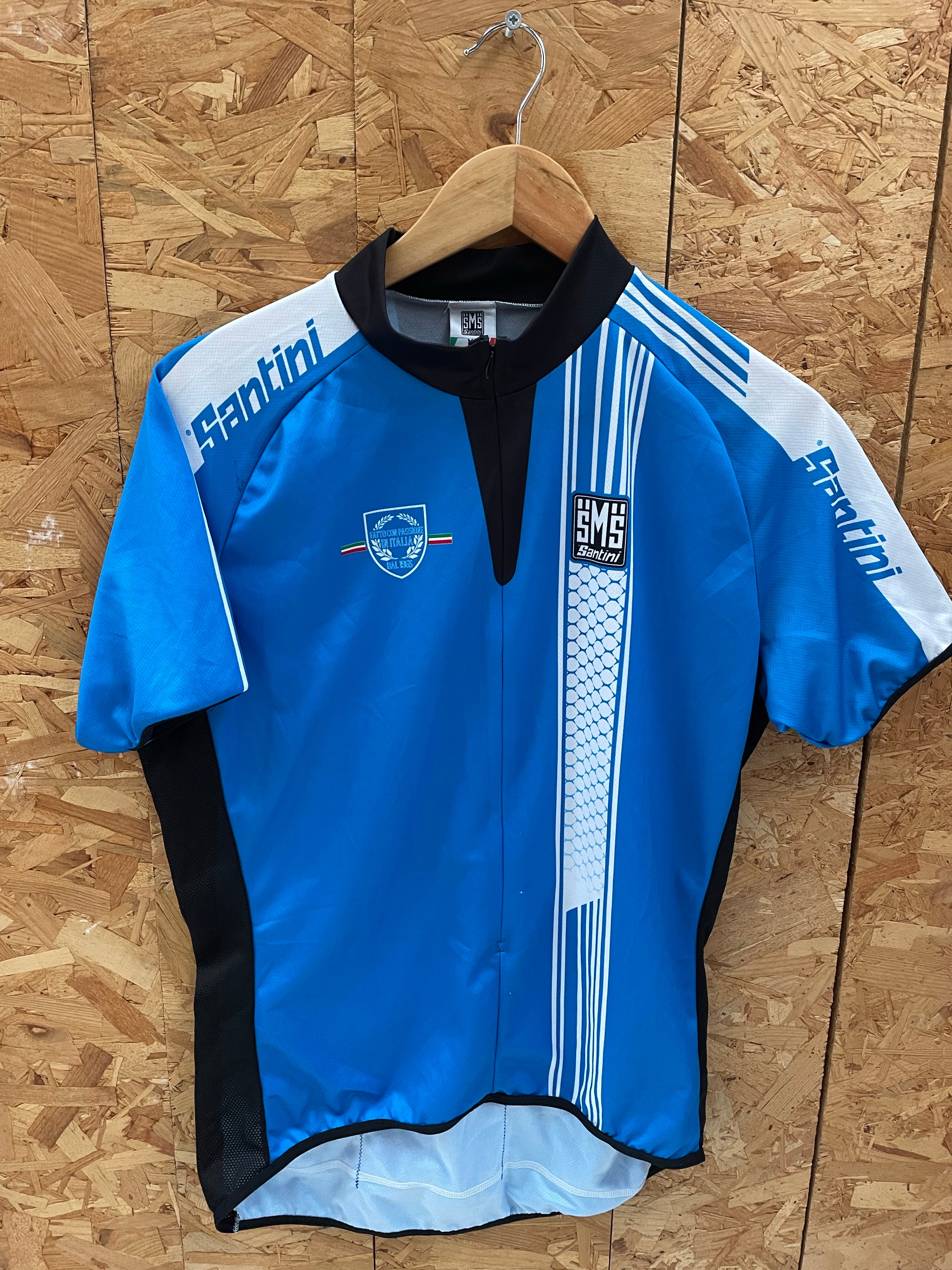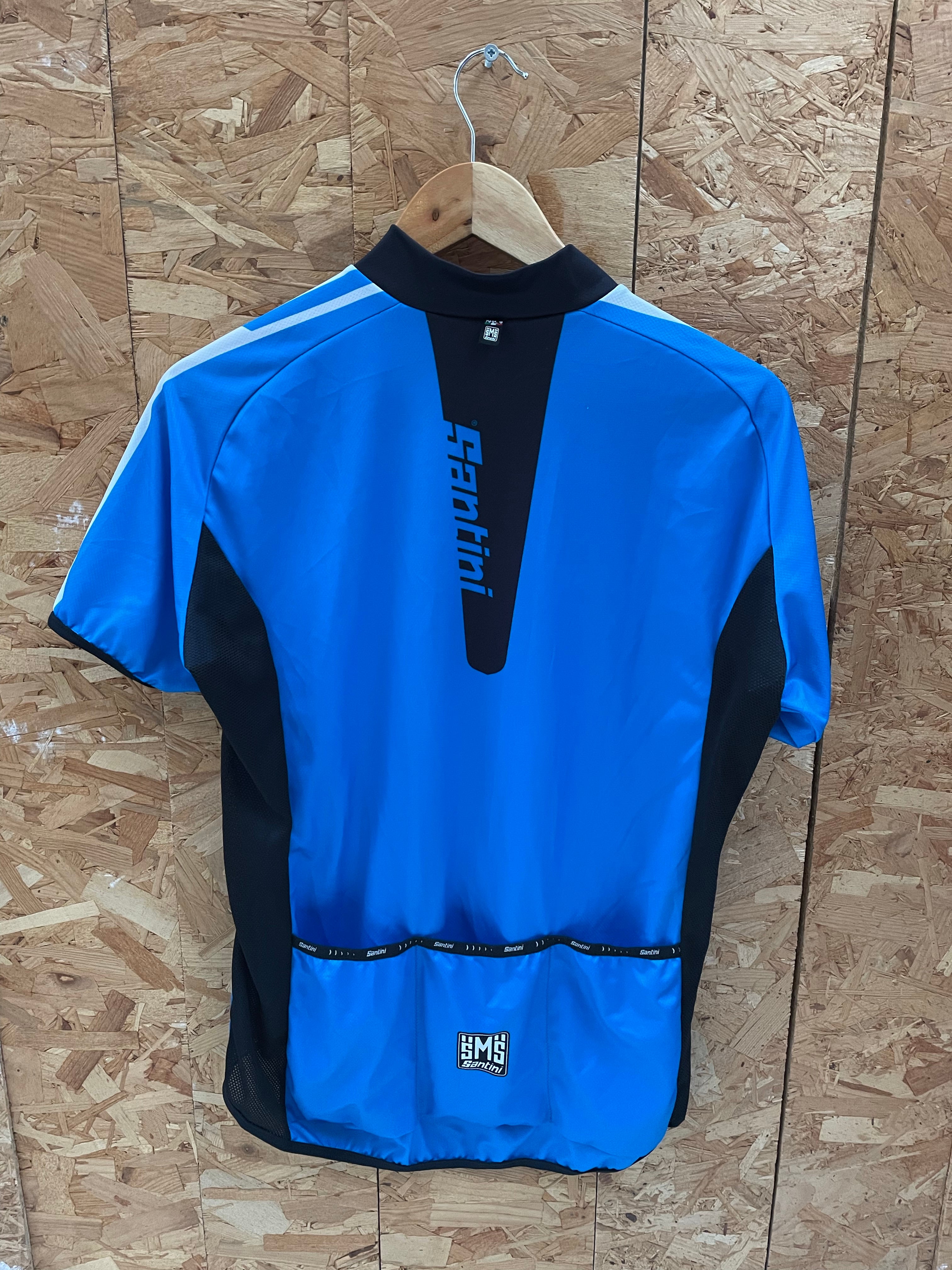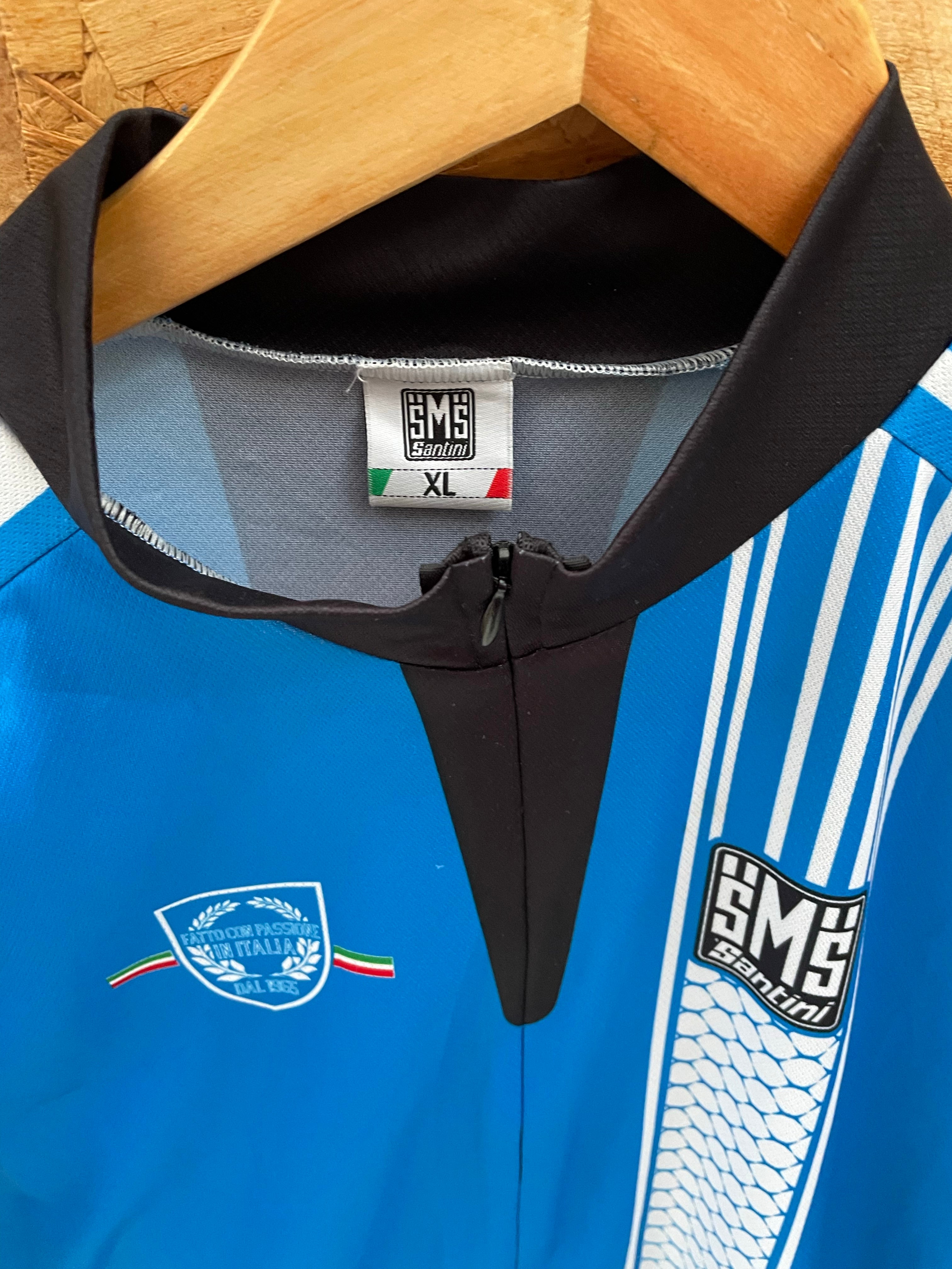 Performance short sleeve cycling jersey by Santini SMS. Features a vibrant blue color with white and black accents. Designed for comfort and breathability during rides. Includes a full zip front and multiple back pockets for storage. Color: Blue. Size: XL