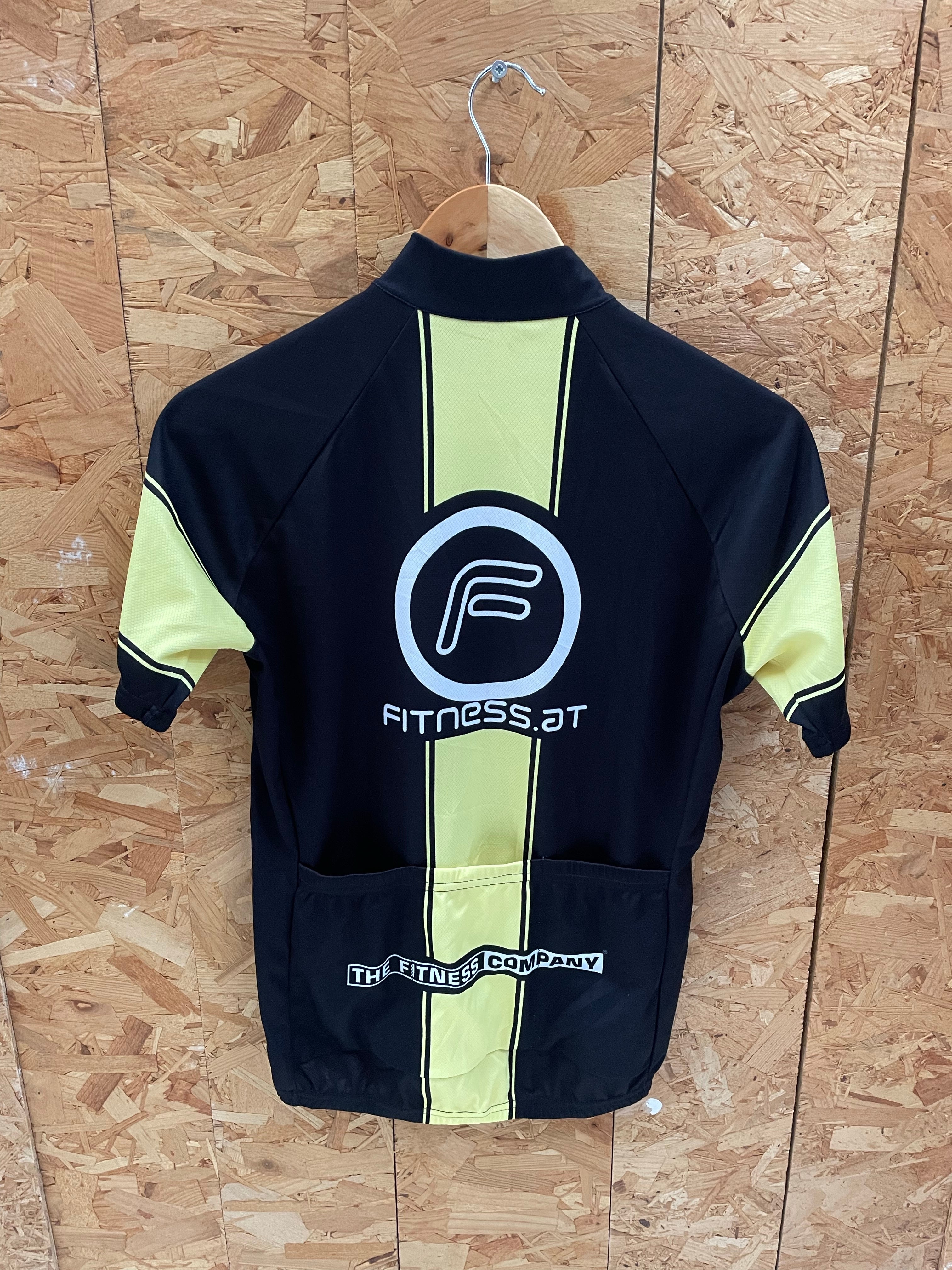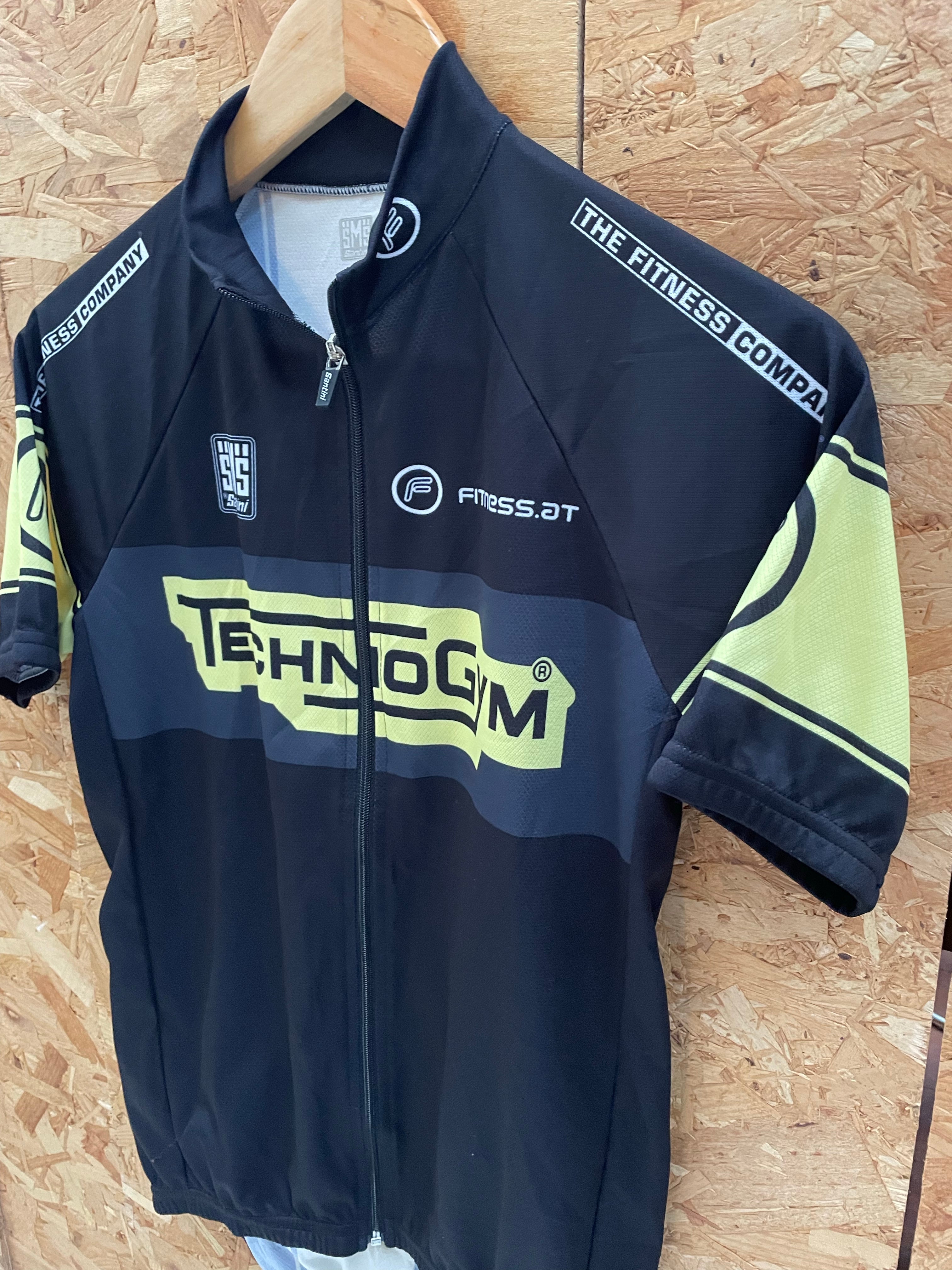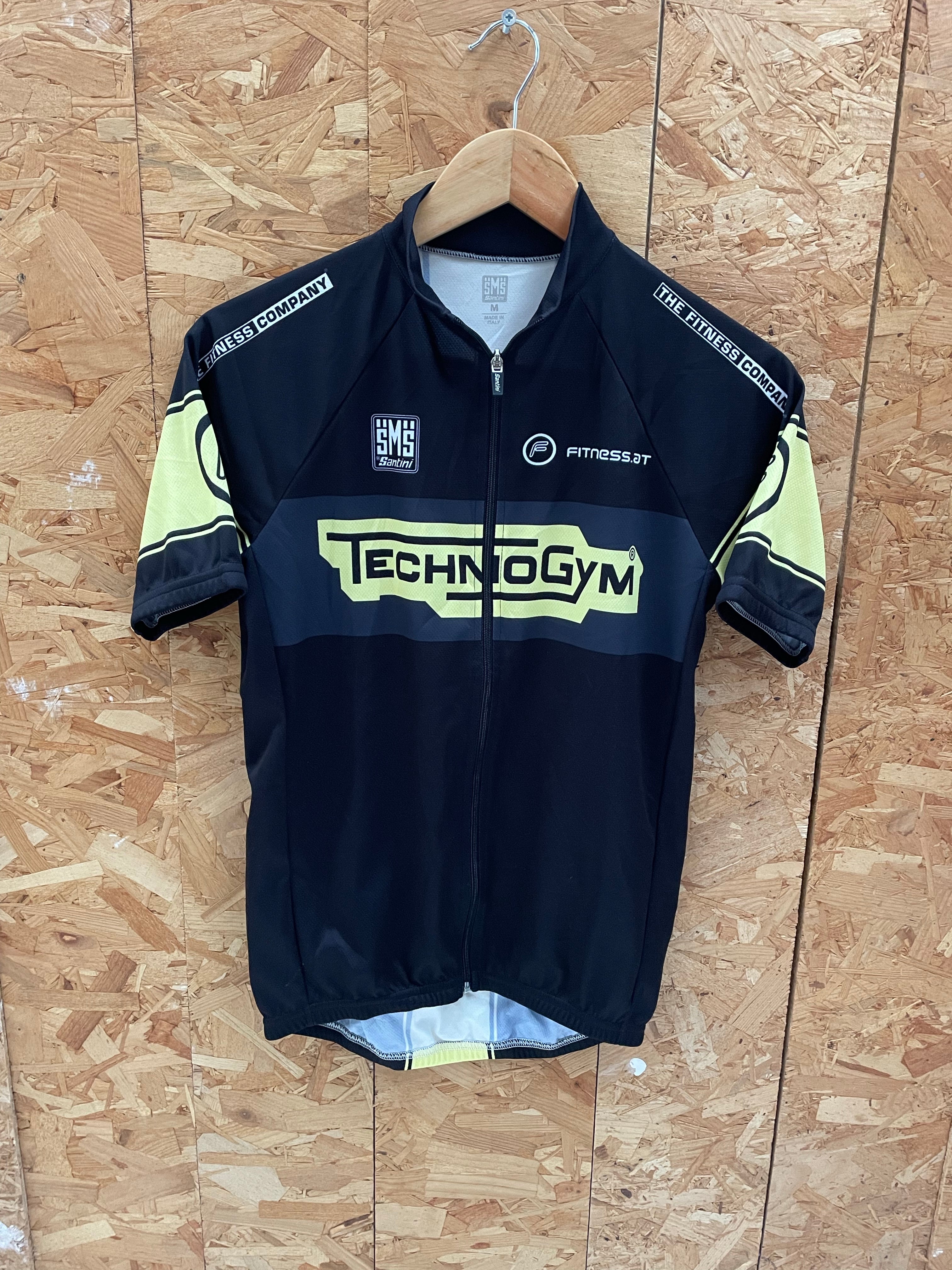 Short sleeve cycling jersey by Santini for Technogym Fitness Company. Features a full zip front, breathable fabric, and multiple pockets on the back. Classic black with yellow accents and bold Technogym branding. Perfect for training or casual rides. Color: Black/Yellow. Size: M
