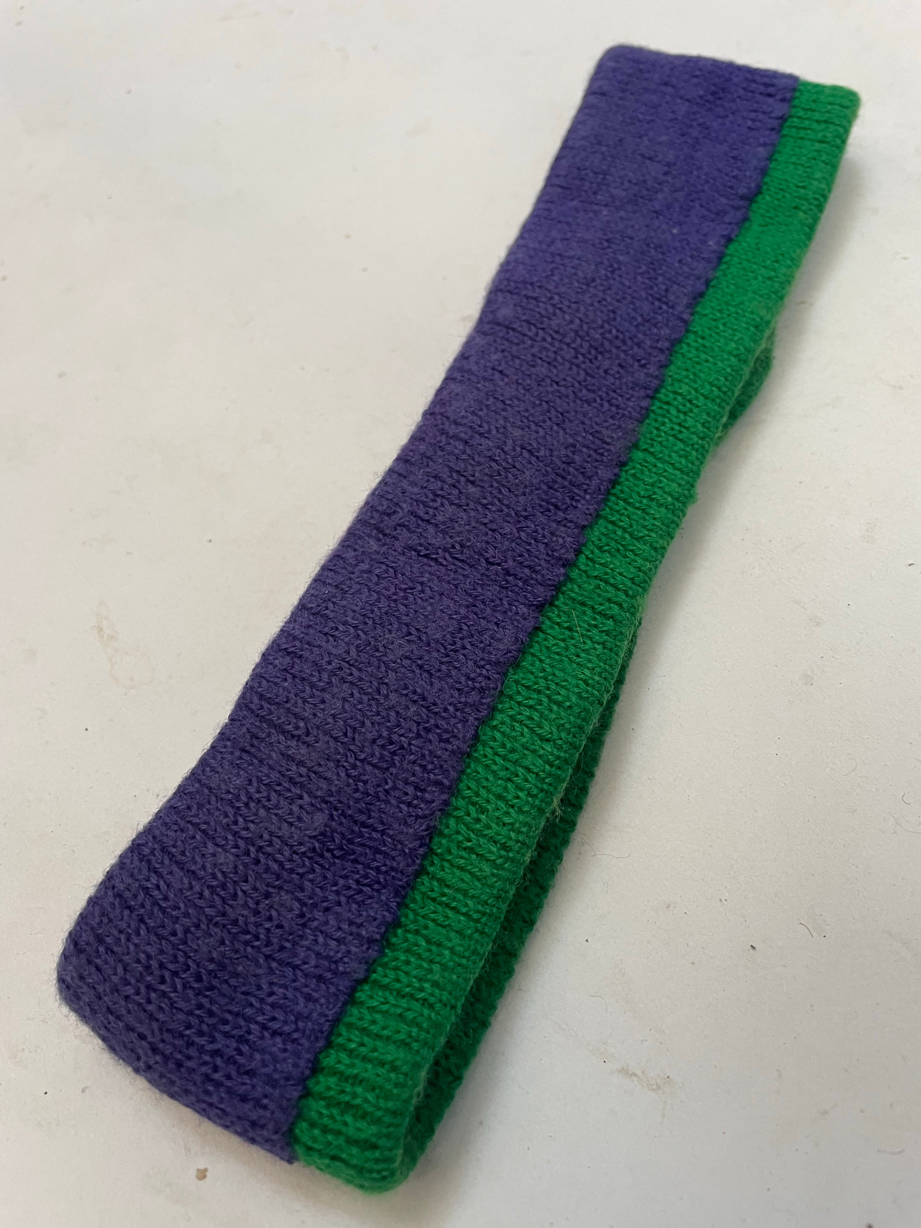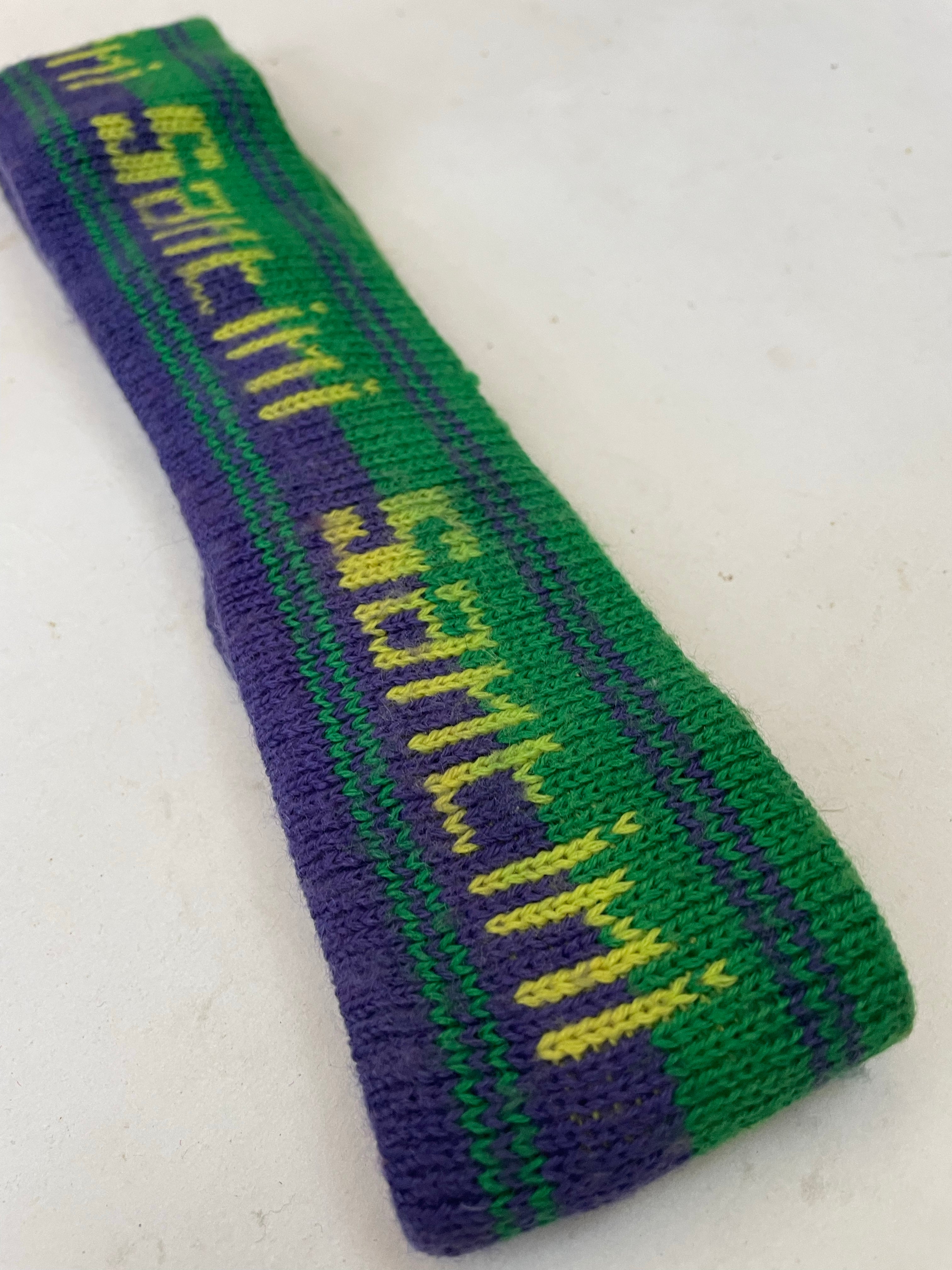 Vintage Santini knit headband in green, purple, and yellow. Features the Santini logo knitted into the fabric. Perfect for sports like tennis, cycling, or as a retro fashion accessory. One size fits most. Color: Green/Purple/Yellow.
