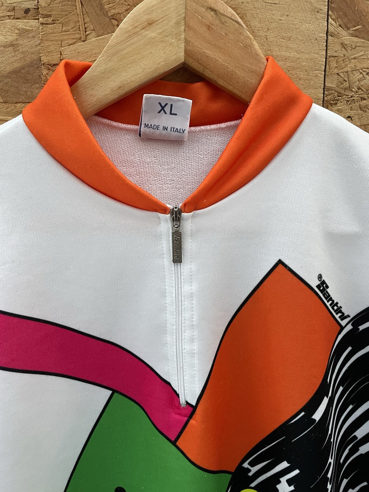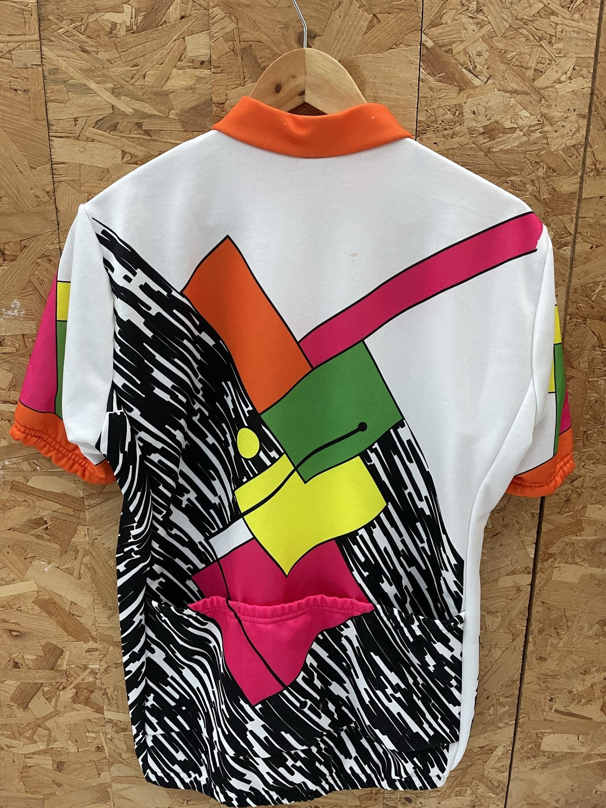 Vintage Santini cycling jersey with a bold geometric abstract print. Features short sleeves, a quarter-zip neck, and vibrant colors. Made in Italy. Perfect for collectors or cycling enthusiasts looking for a retro look. has a minor ghost stain on shoulder