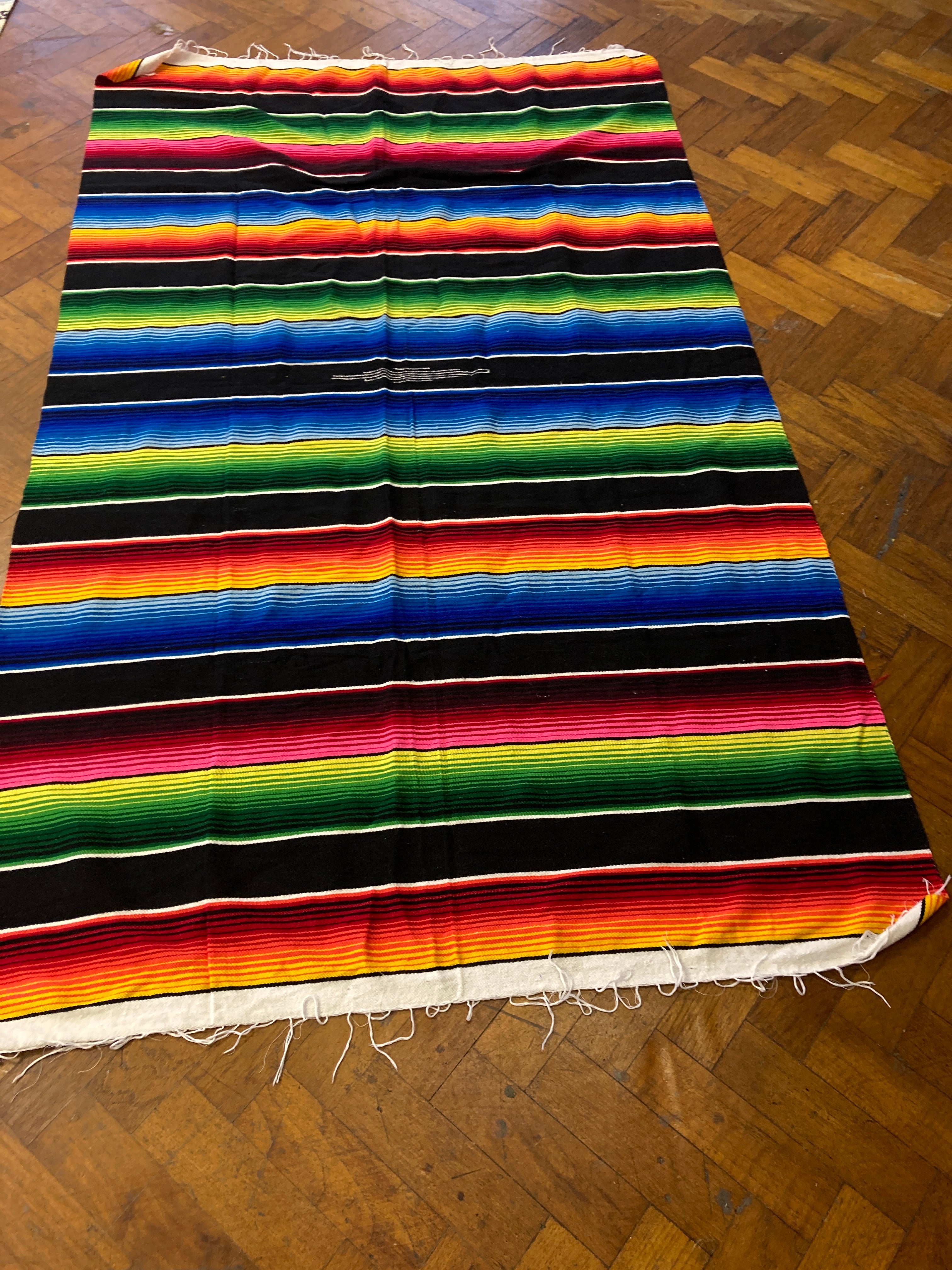 Vibrant Mexican Serape blanket featuring a classic rainbow stripe pattern on a black background. This versatile blanket is perfect for adding a pop of color to your home decor, as a picnic blanket, or for yoga and meditation. Made from a durable cotton b Color: Multicolor.