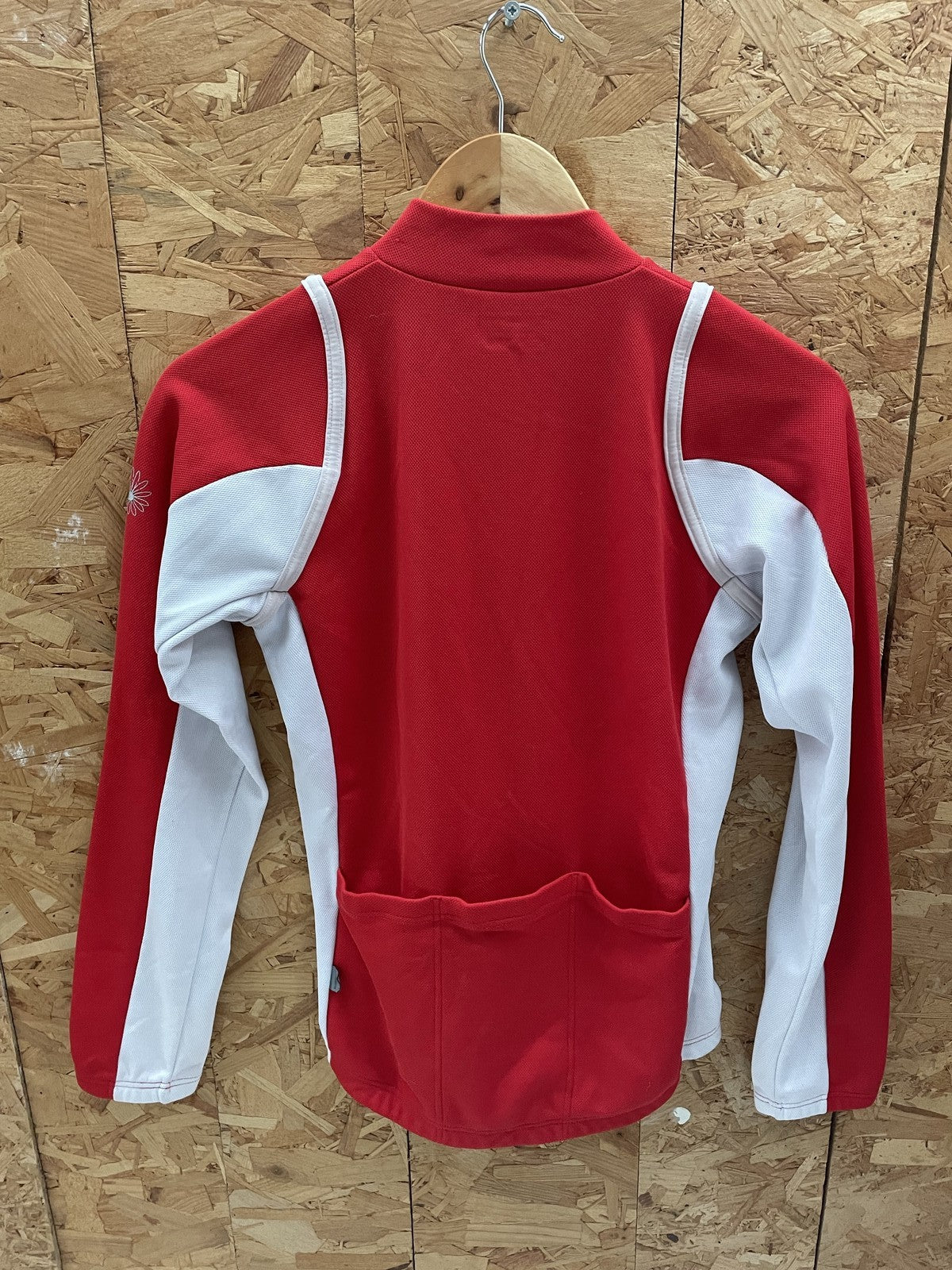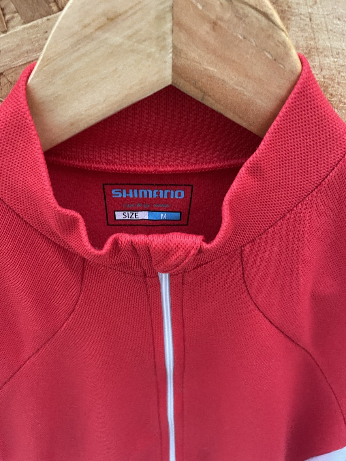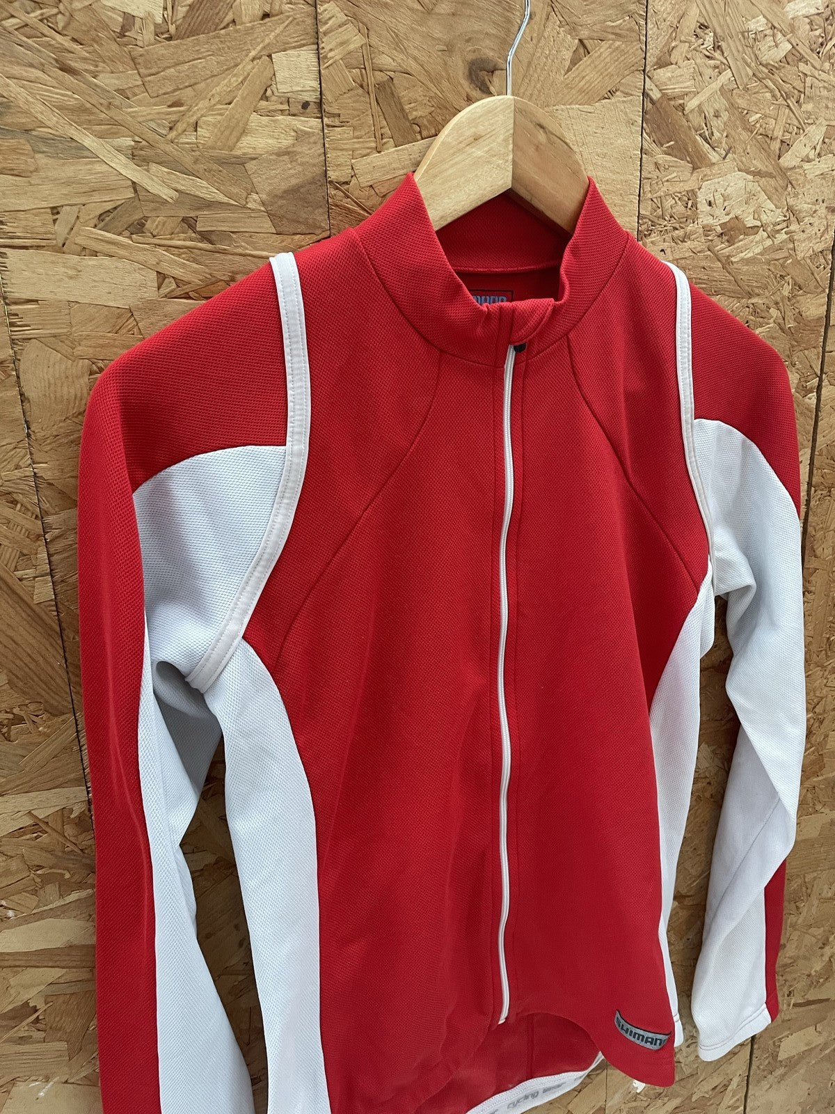This Shimano cycling jersey is perfect for your next ride. Featuring a vibrant red and white color block design, long sleeves, and a full zip front for easy ventilation. Made with breathable fabric to keep you comfortable on the go. Excellent condition, r