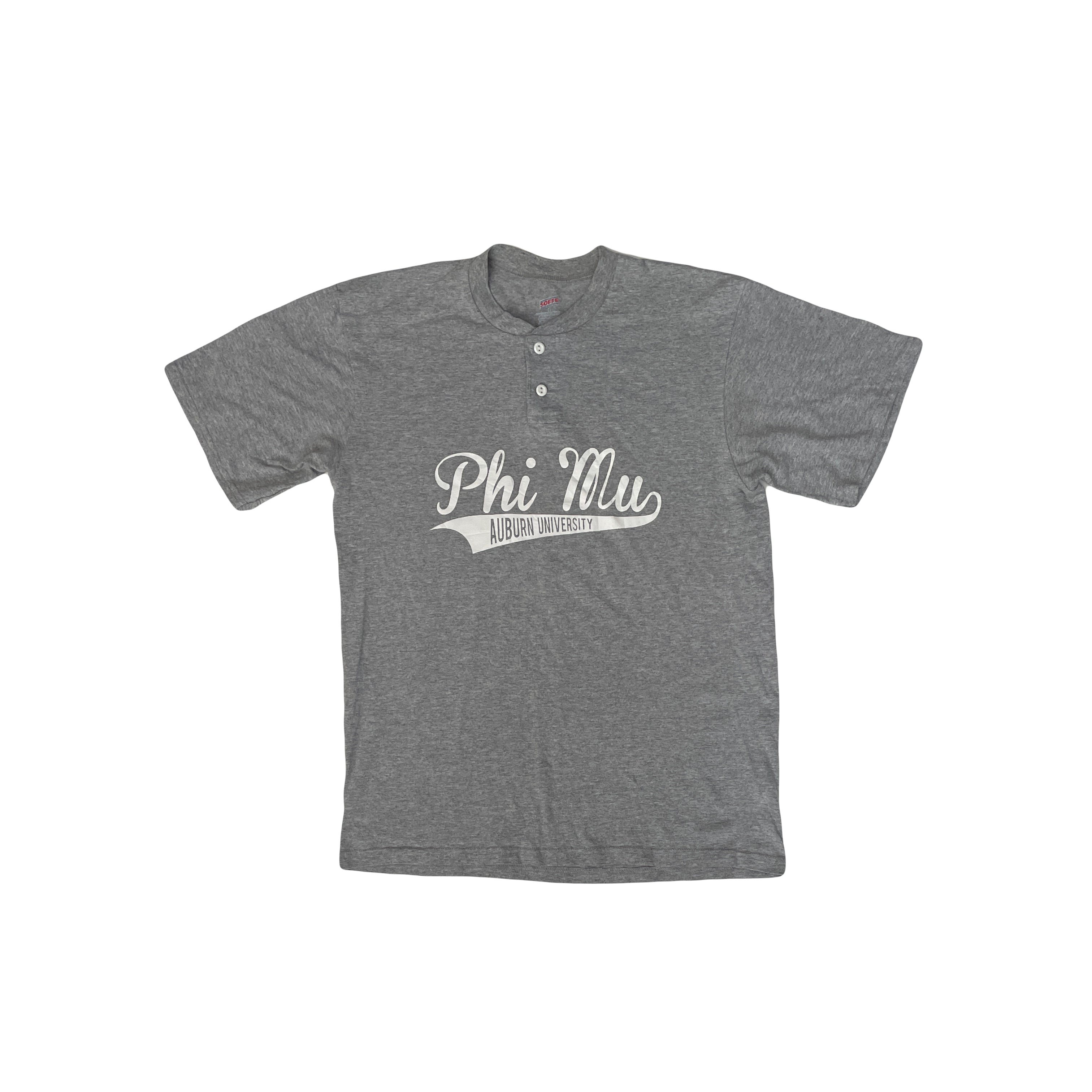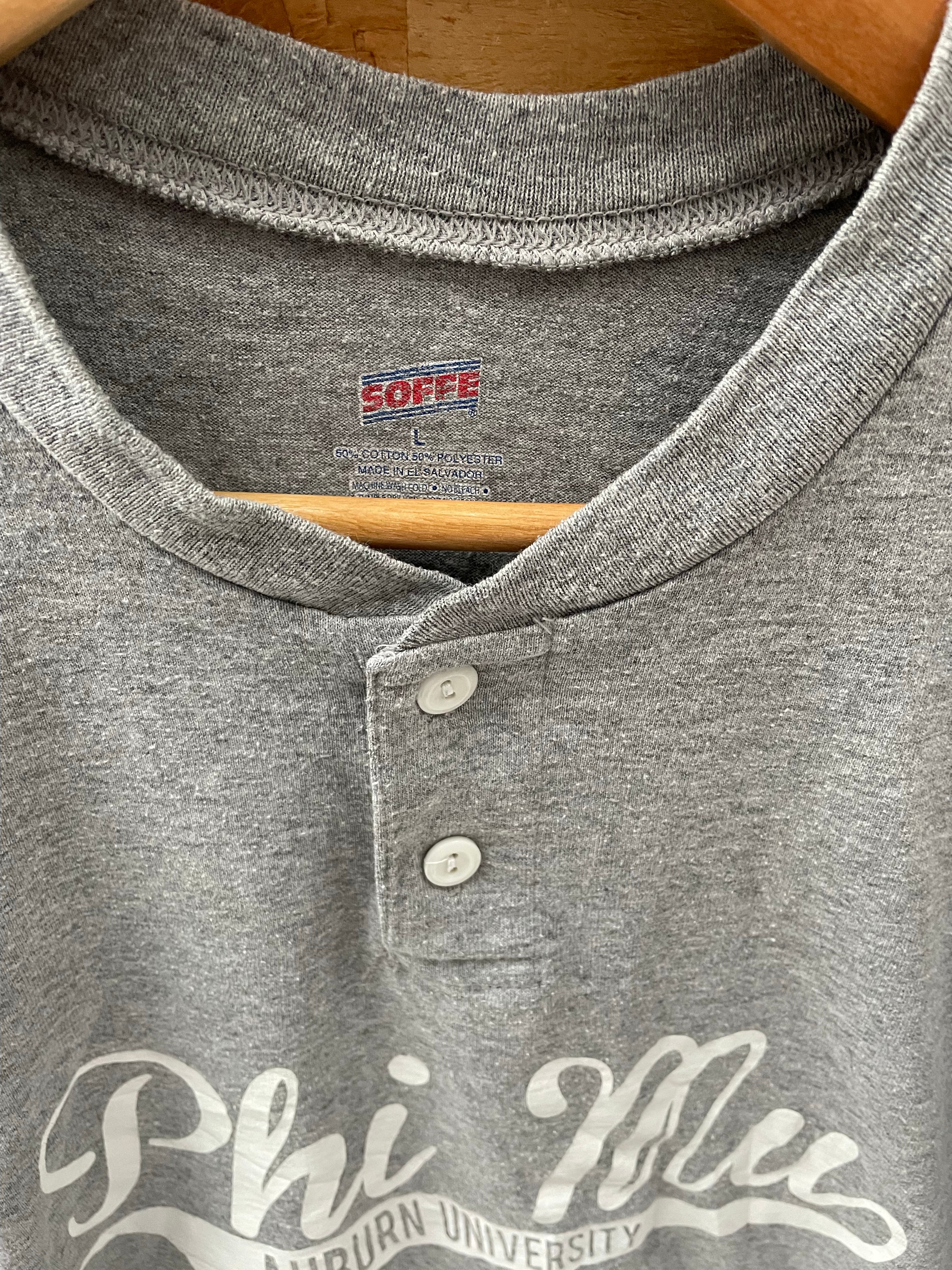 Soffe brand henley t-shirt. Gray color. Features a Phi Mu Auburn University graphic. Large size. Color: Gray.