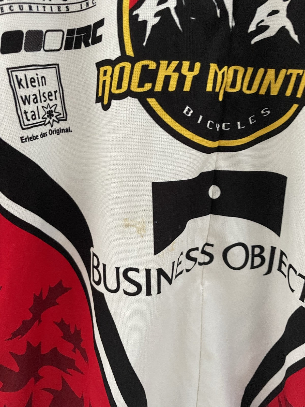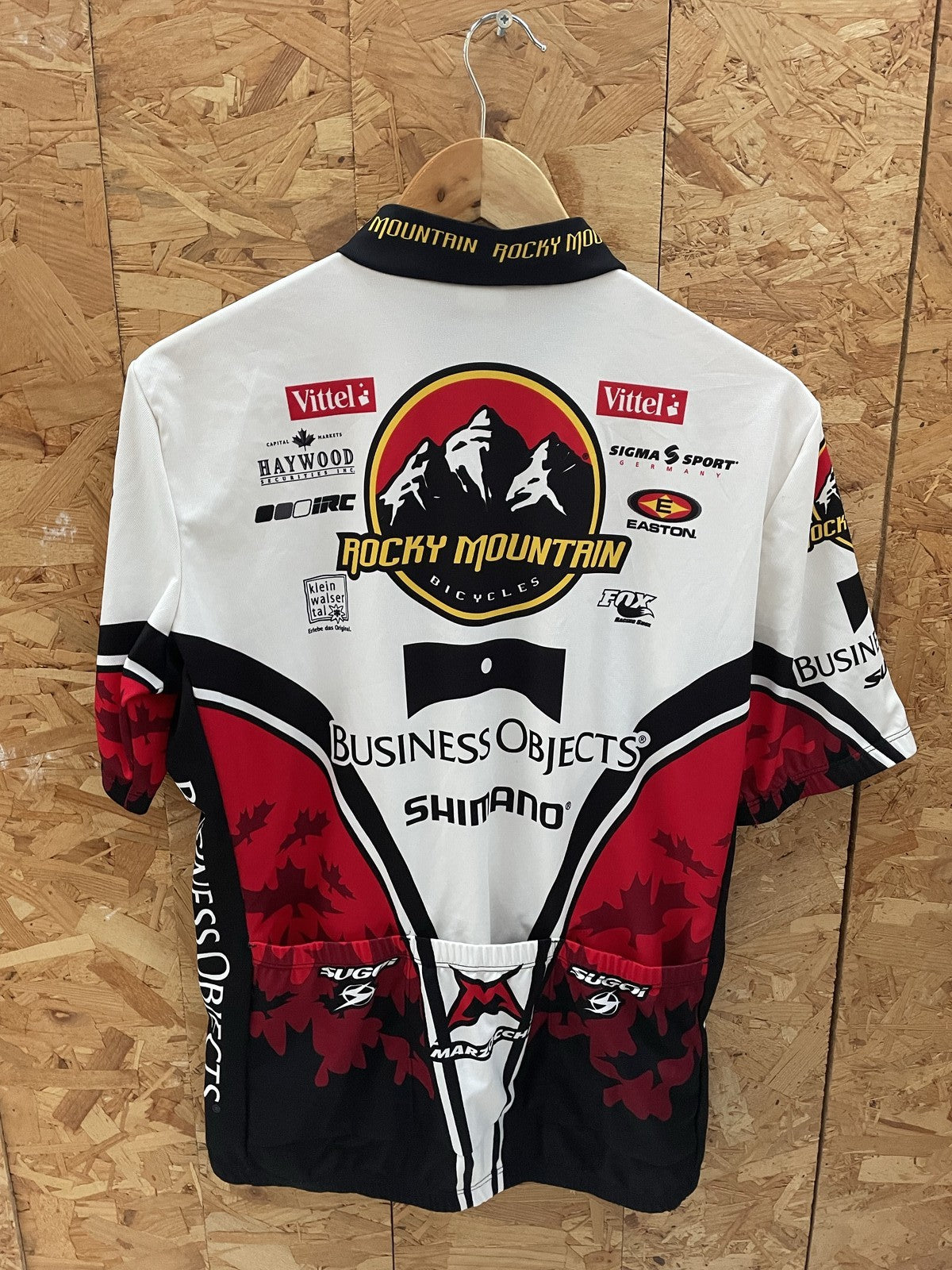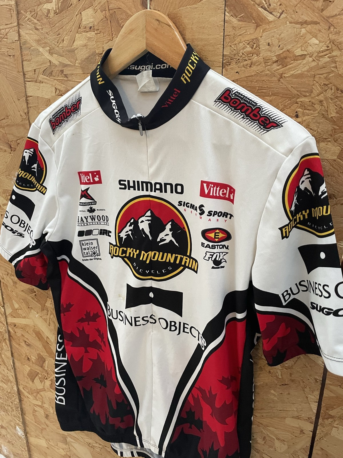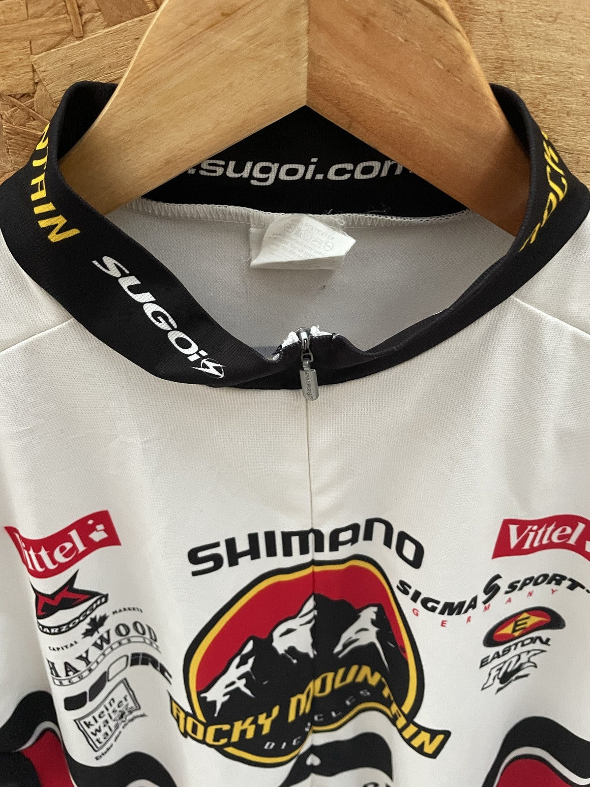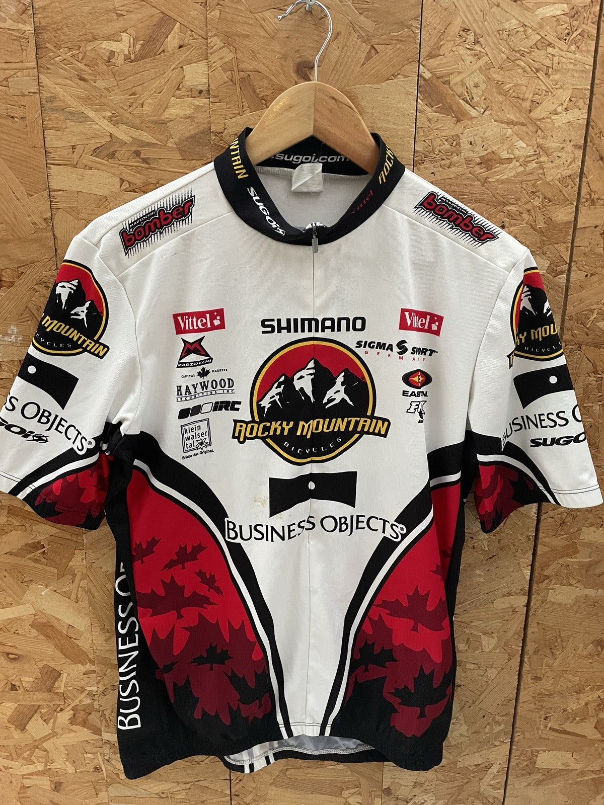 This Sugoi cycling jersey features the Rocky Mountain Bicycles branding with Shimano and other sponsor logos. It has a full zip front and short sleeves. The design includes red maple leaf accents. There is a small stain on the front, as shown in the photo
