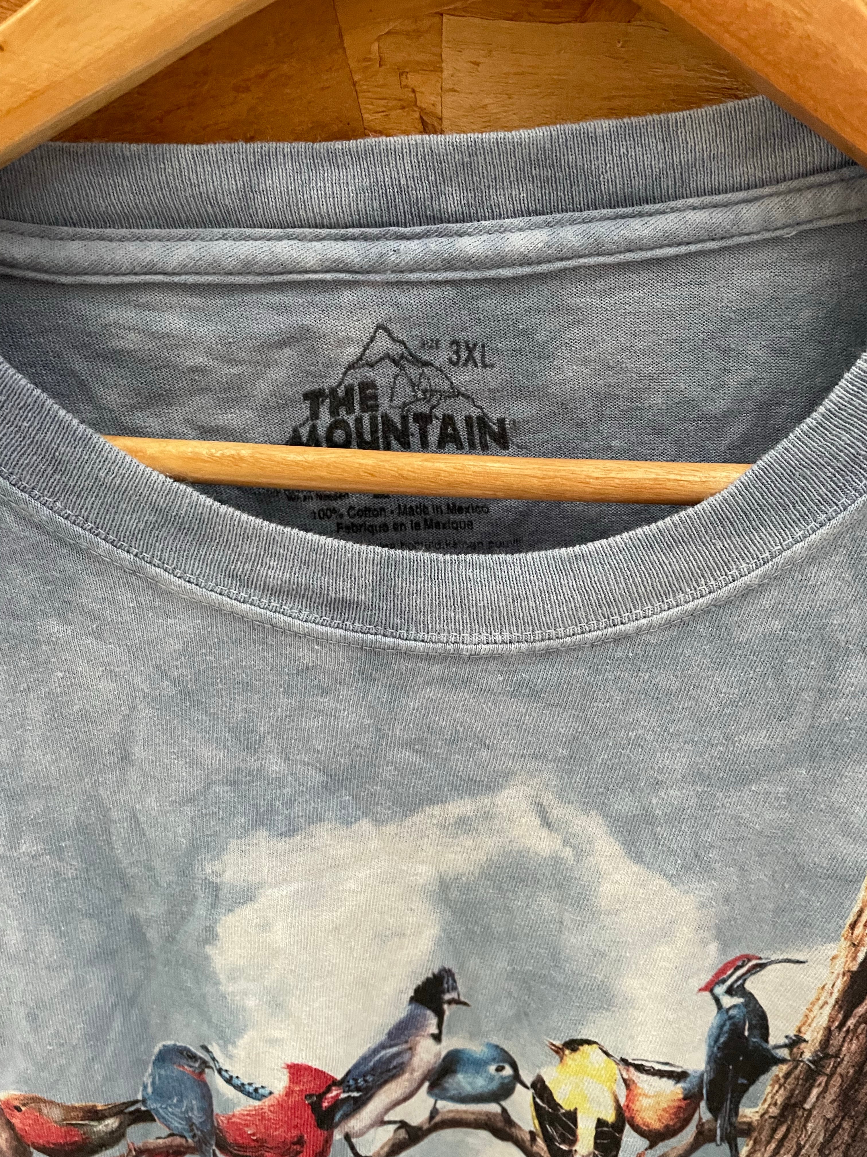 This unique long-sleeve t-shirt from The Mountain features a striking tie-dye pattern in shades of blue and grey. The front showcases a vibrant graphic print of various birds perched on a branch against a cloudy sky. Made from 100% cotton, this shirt offe Color: Blue/Grey Tie-Dye. Size: 3XL