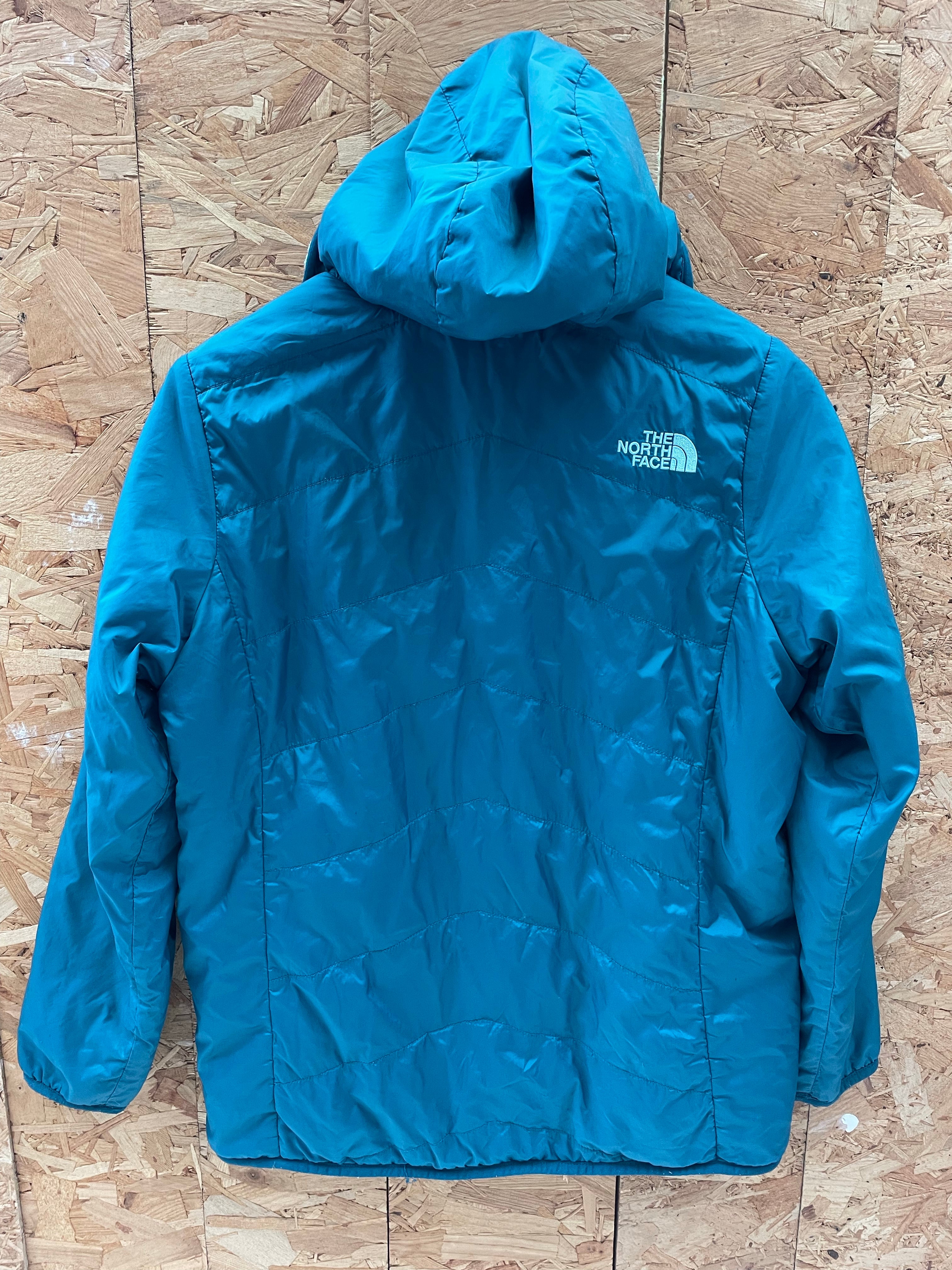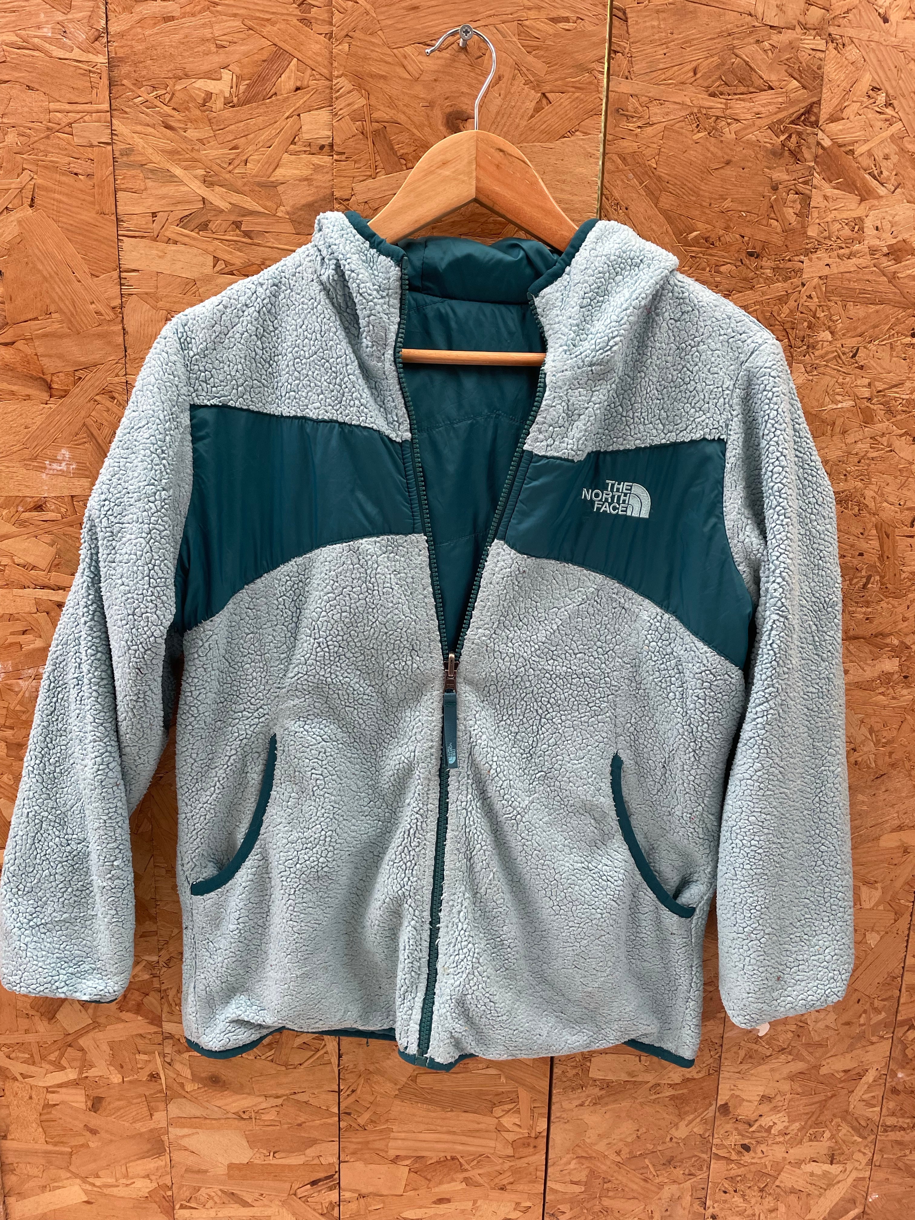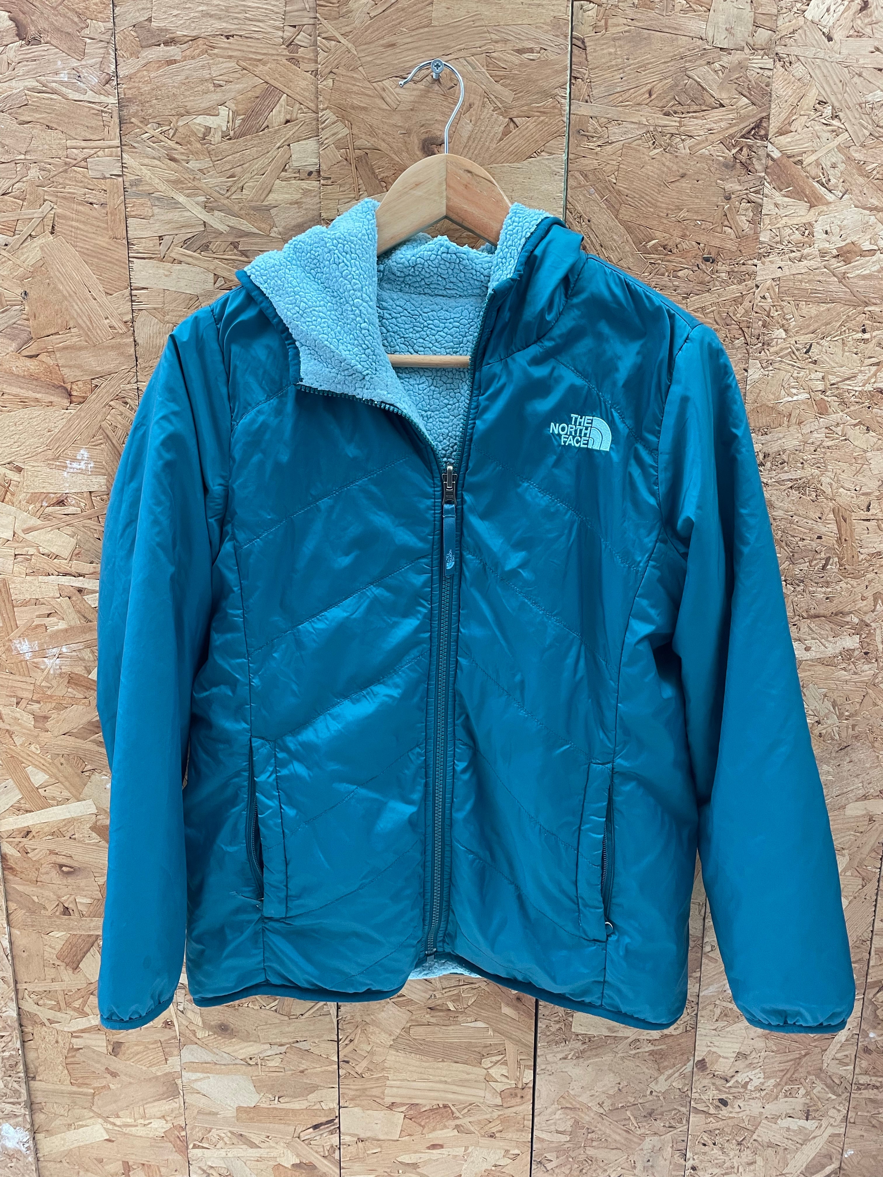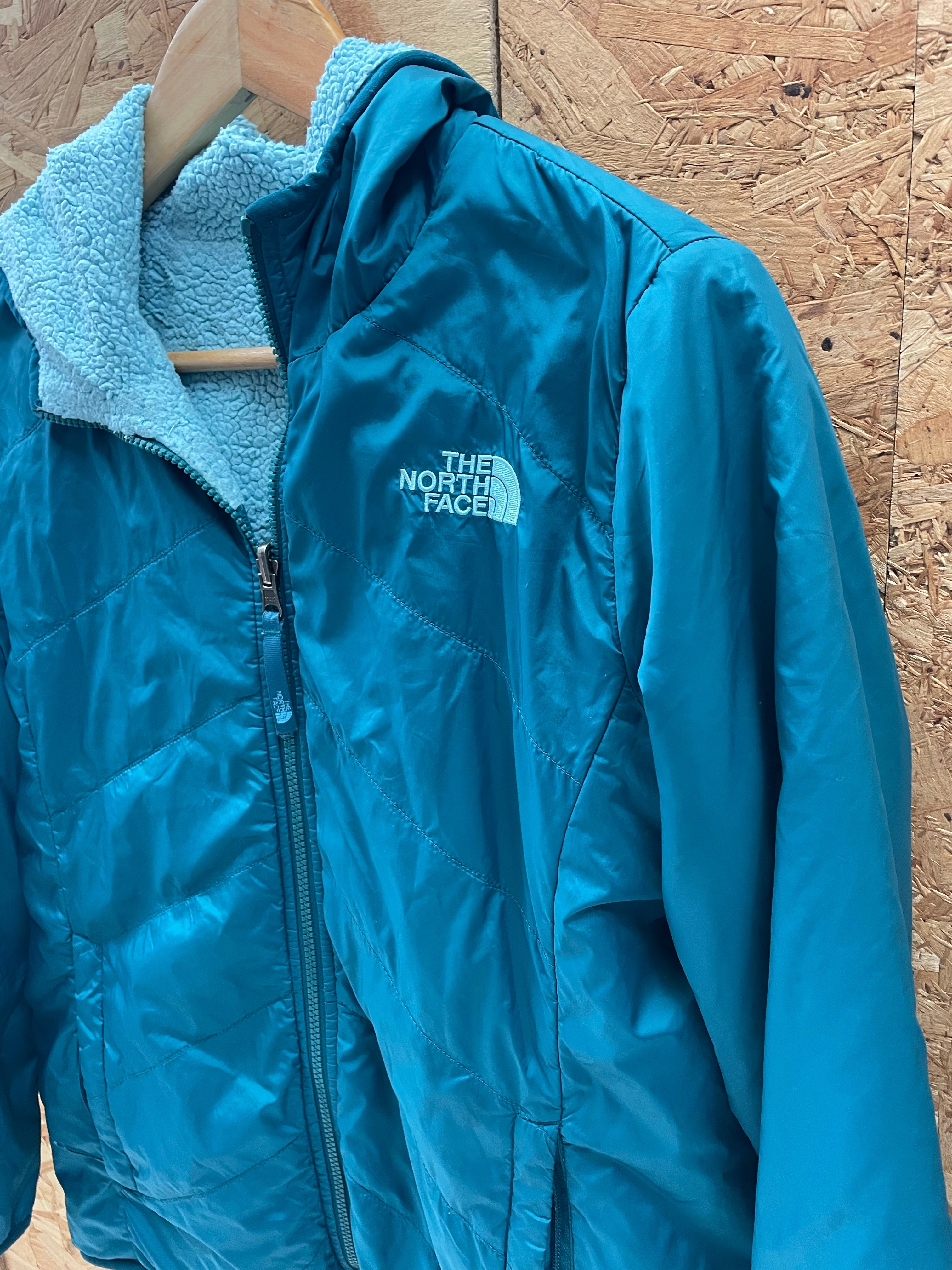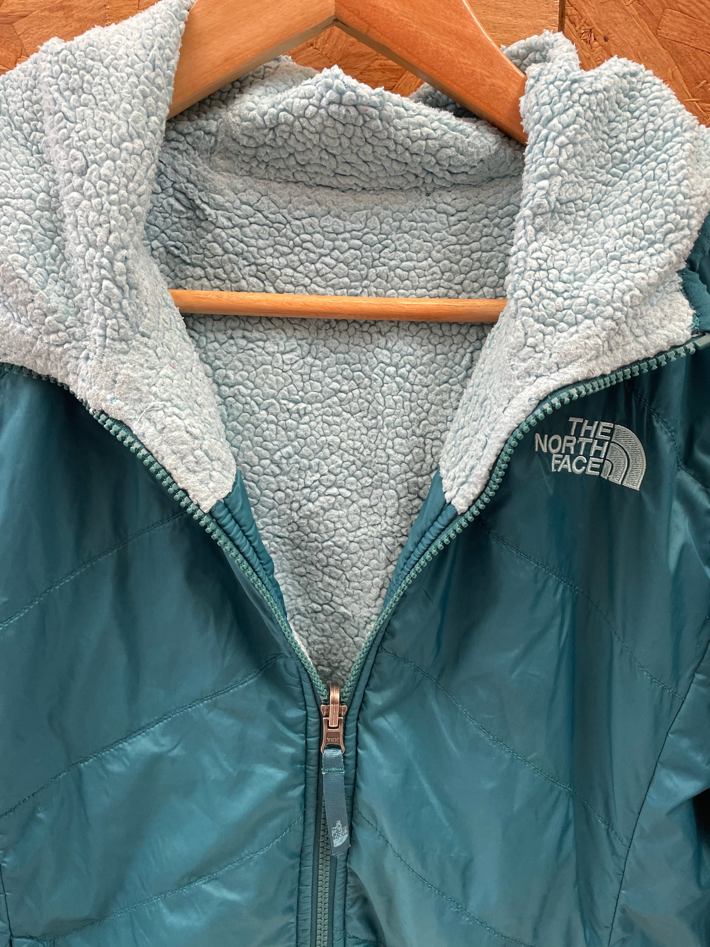 Stay warm and stylish with this reversible The North Face hooded jacket. Features a teal quilted shell on one side and a cozy grey sherpa fleece on the other. Perfect for layering and outdoor adventures. Excellent condition. Color: Teal/blue.