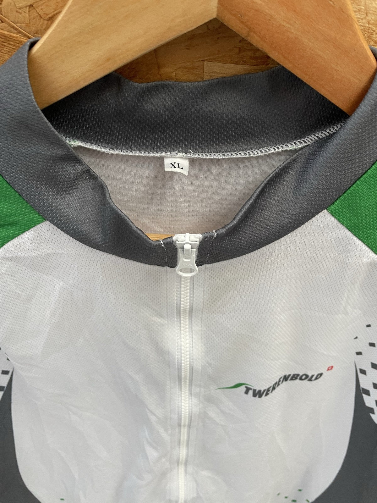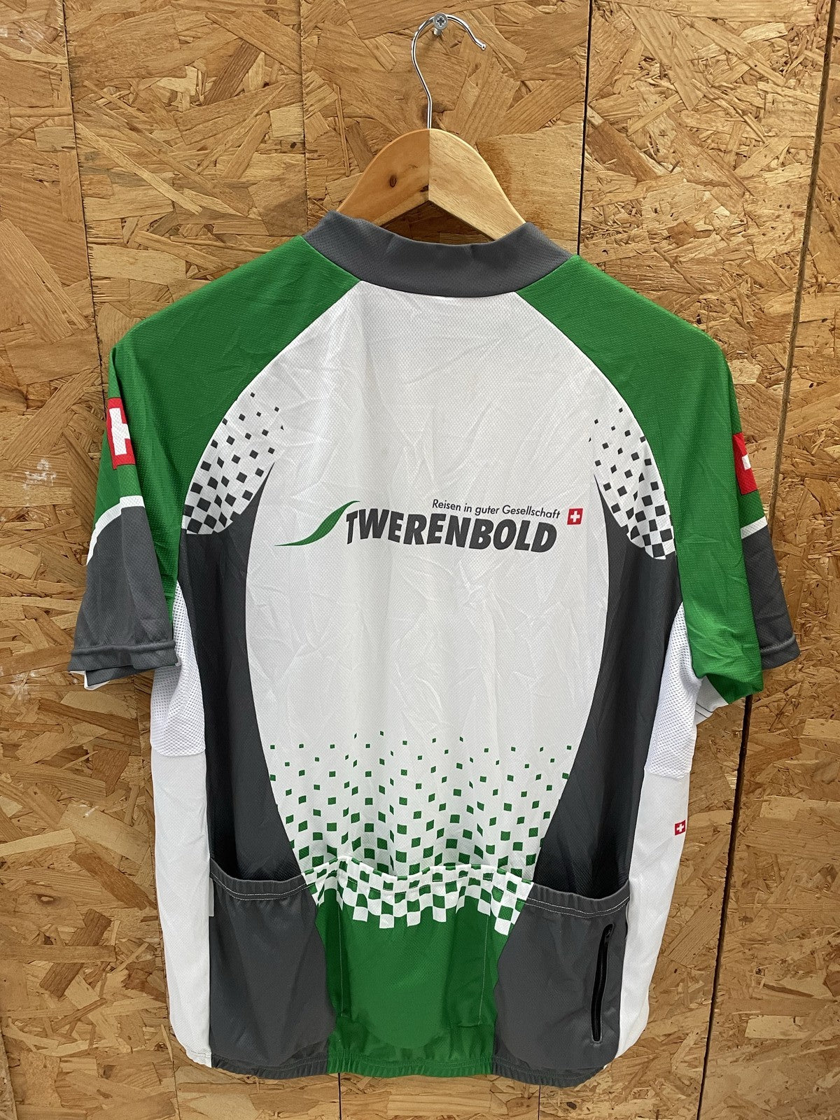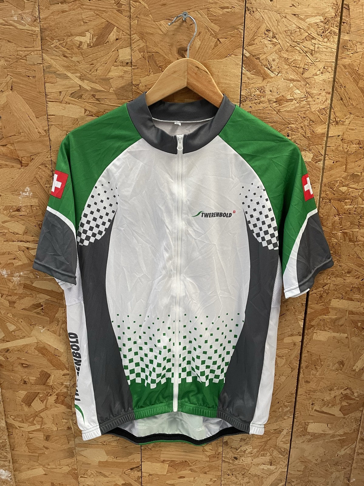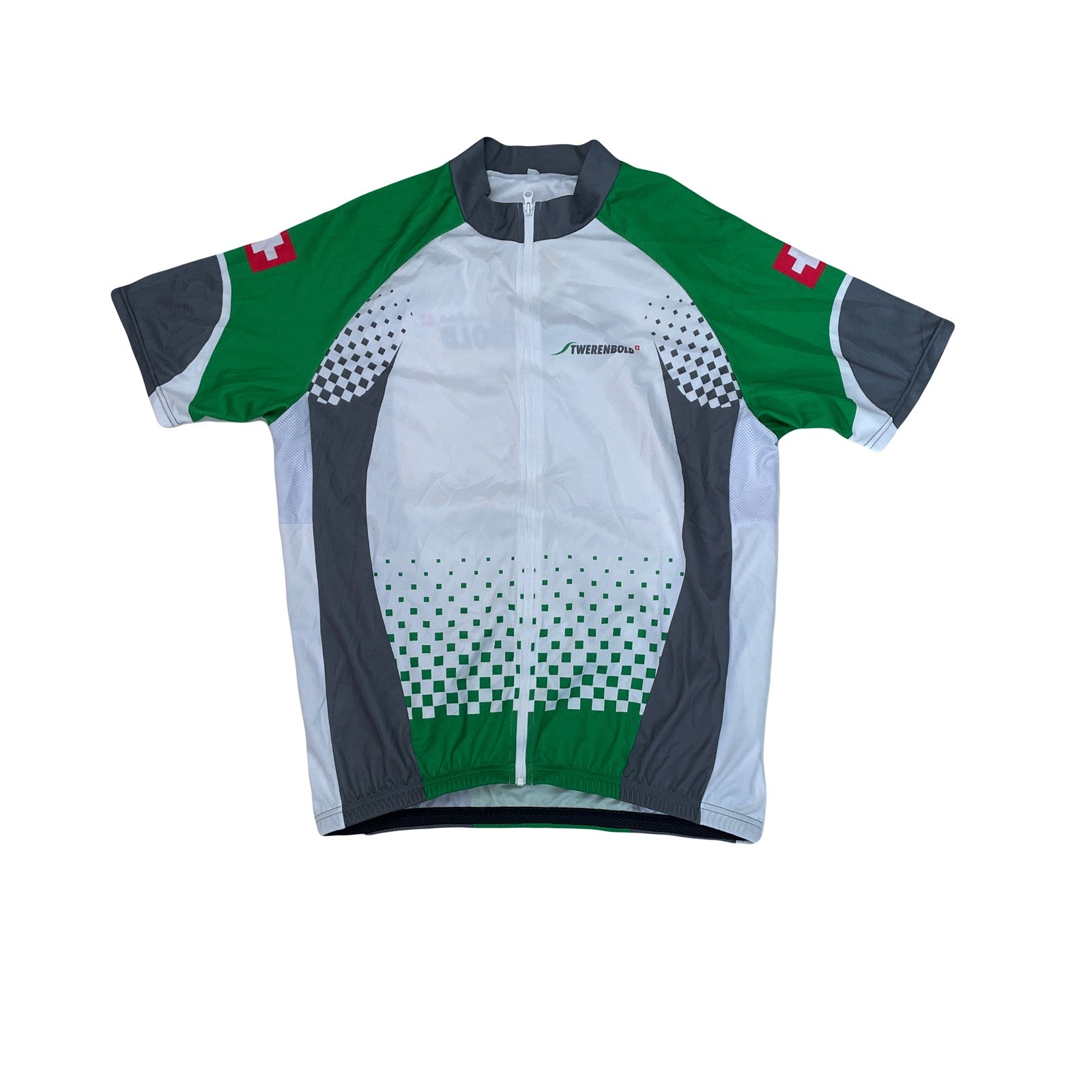 Performance cycling jersey by Twerenbold. Features a full zip front, short sleeves, and a breathable fabric. The design includes green, white, and grey color blocking with a checkered pattern and Swiss flag accents. Ideal for cycling enthusiasts.