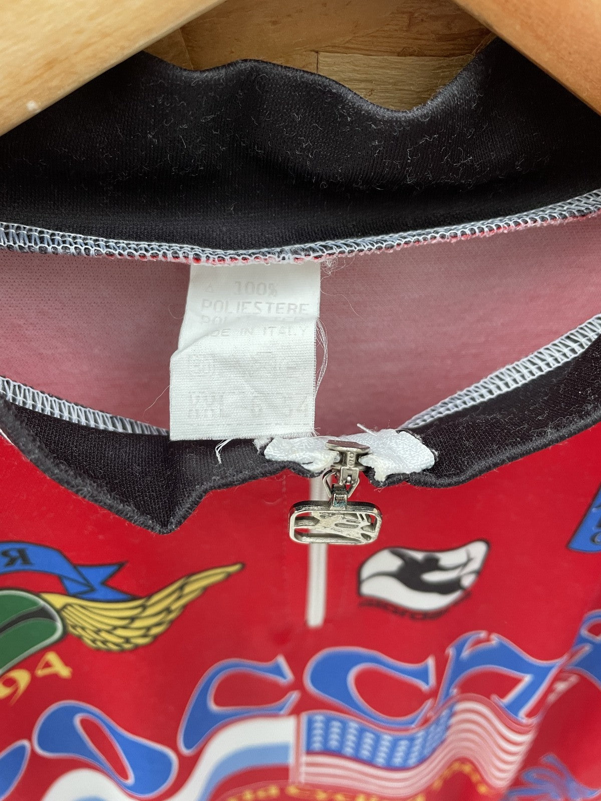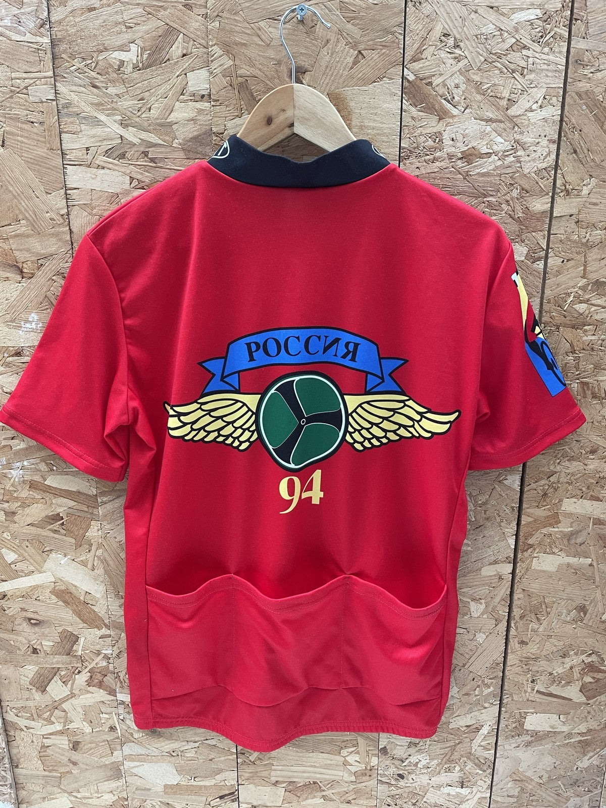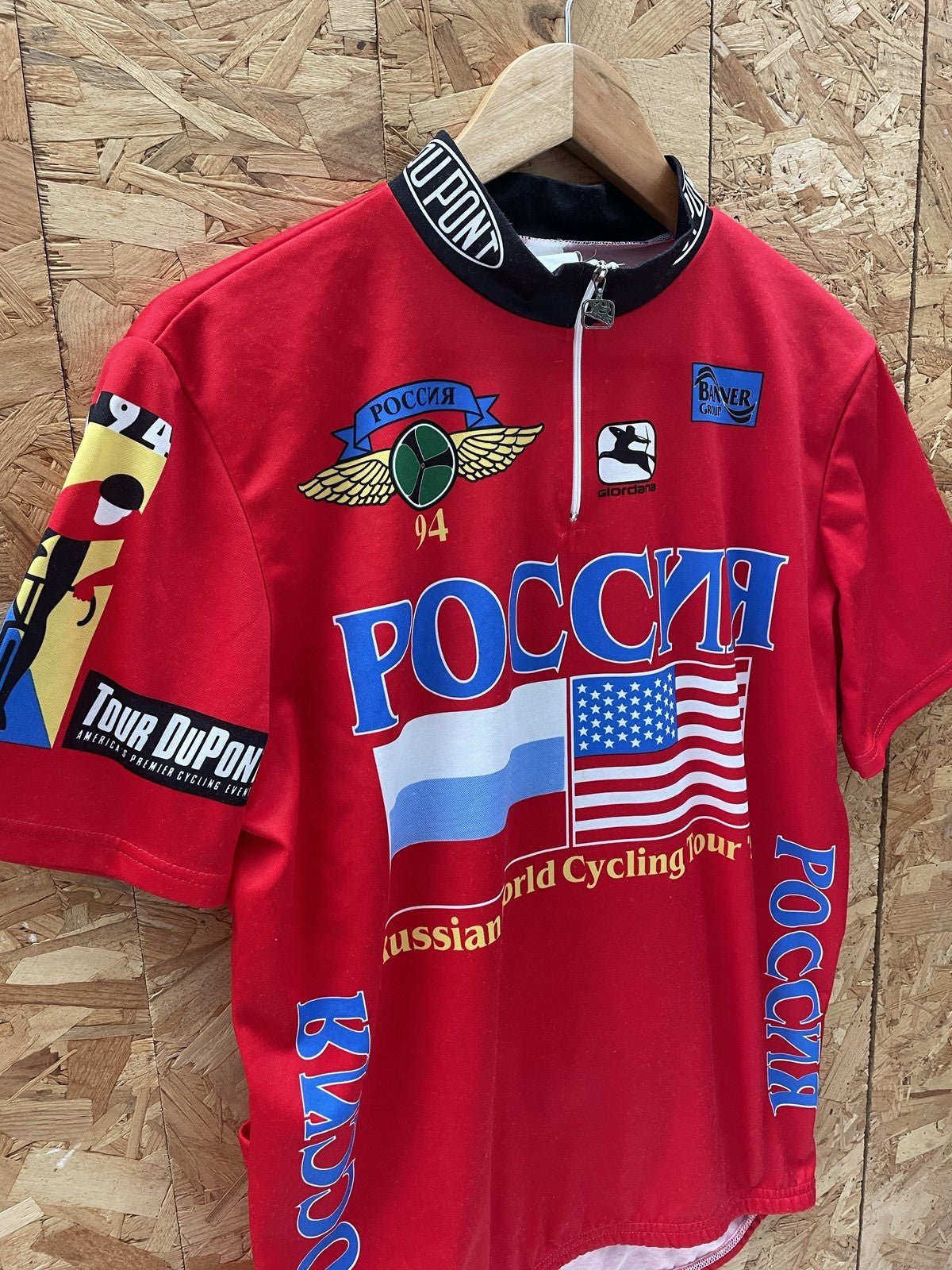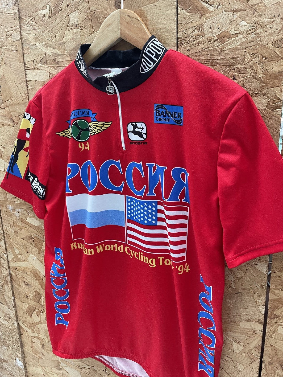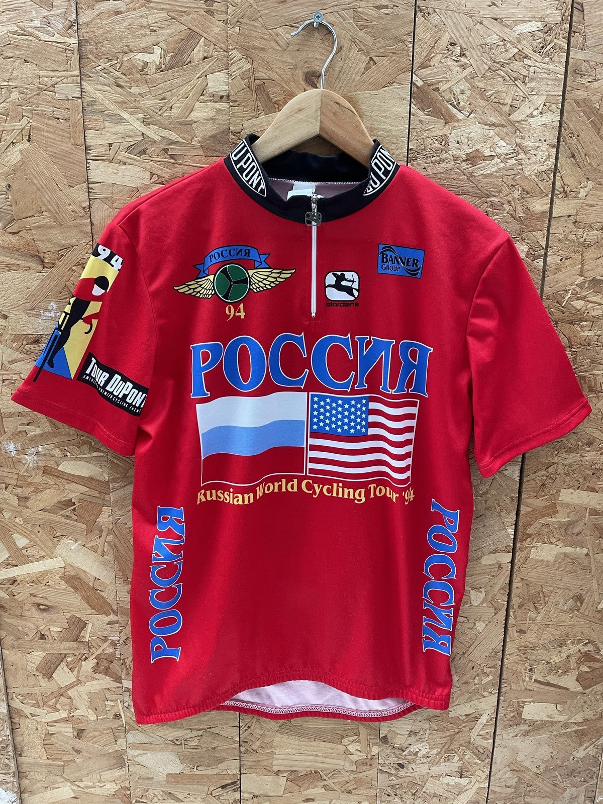 Vintage 1994 cycling jersey from the Russian World Cycling Tour. Features bold graphics with Russian and US flags, 'РОССИЯ' text, and sponsor logos. Made in Italy from 100% polyester. Excellent condition.