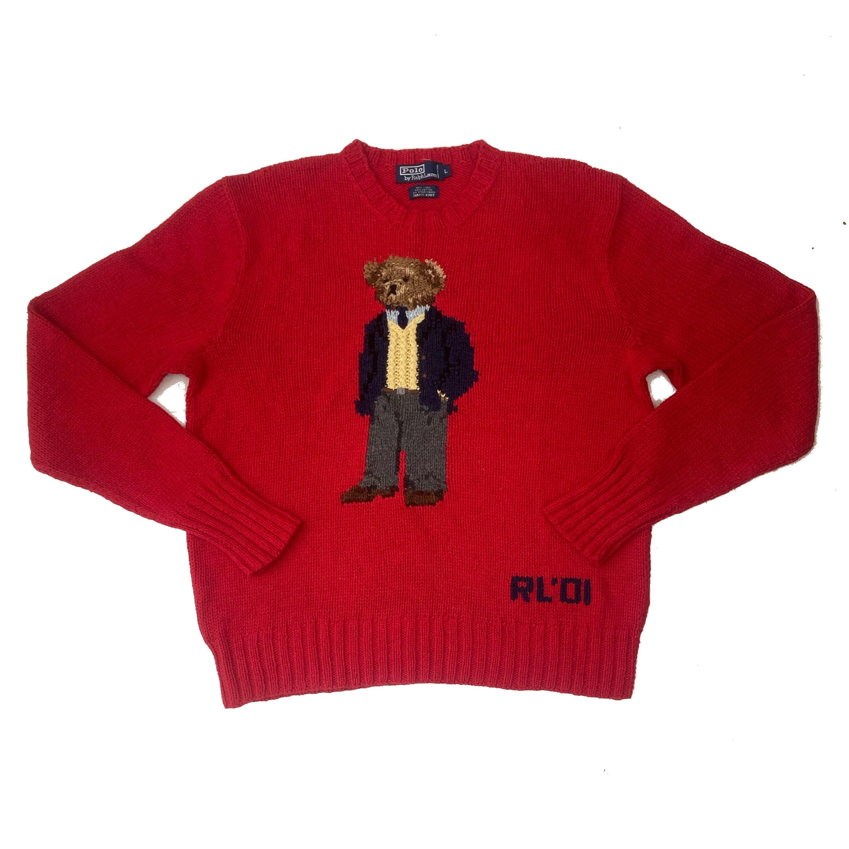 Vintage 2001 rare collectable Polo Ralph Lauren “Executive Bear” red hand-knit crew neck sweater jumper size large as seen on Kanye West college dropout album