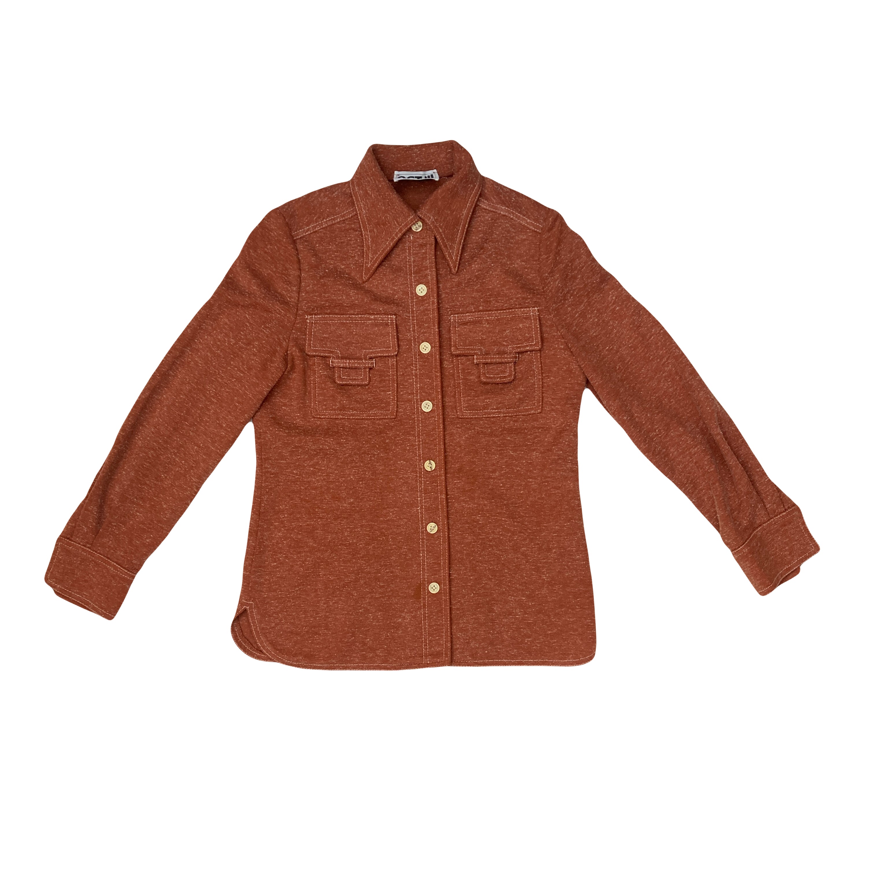 Vintage 70s brown polyester twin pocket long sleeve ladies shirt size small
