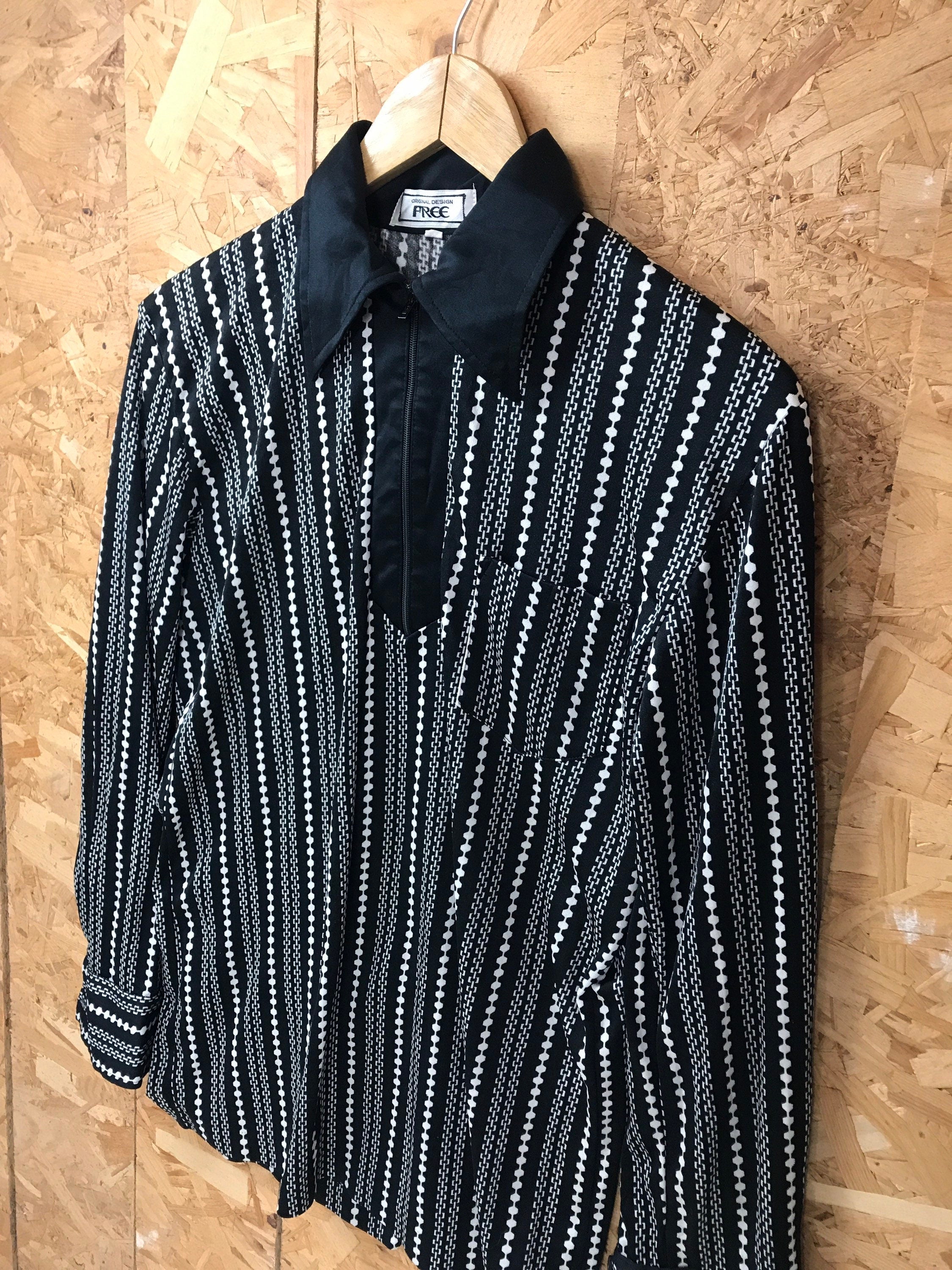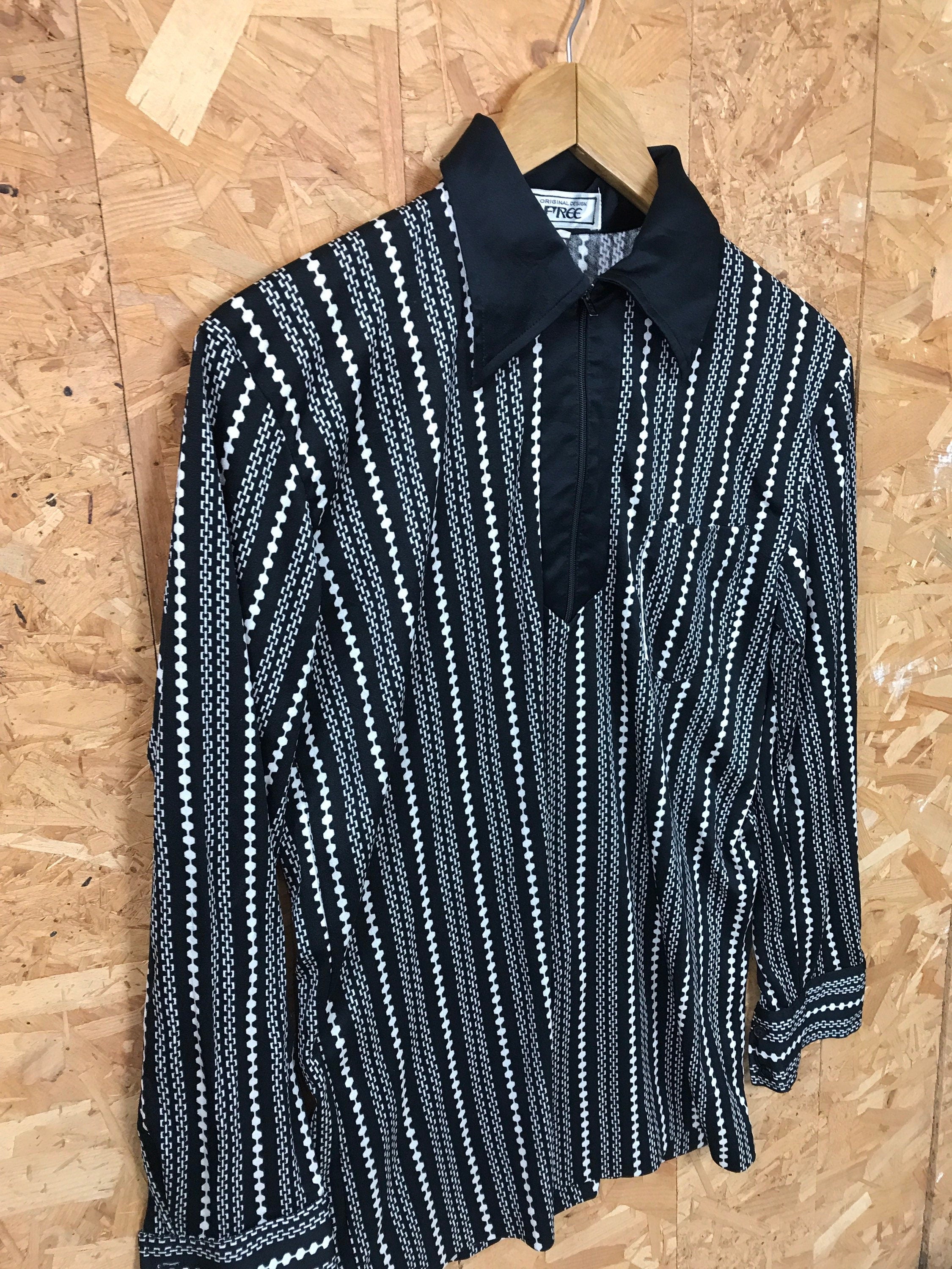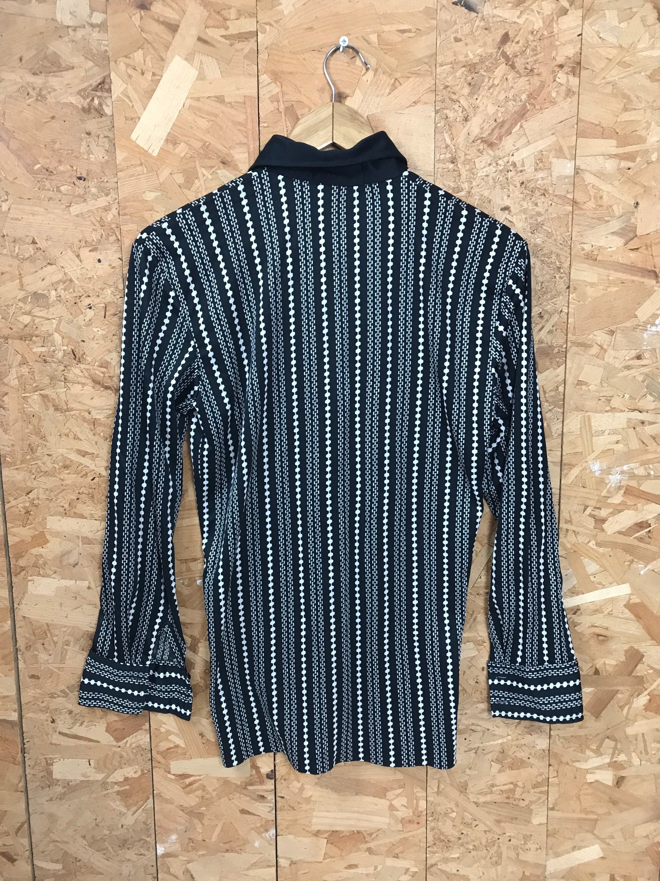 Vintage 70s white black faded stripe pattern pointed collar retro polyester disco shirt size medium slim fit