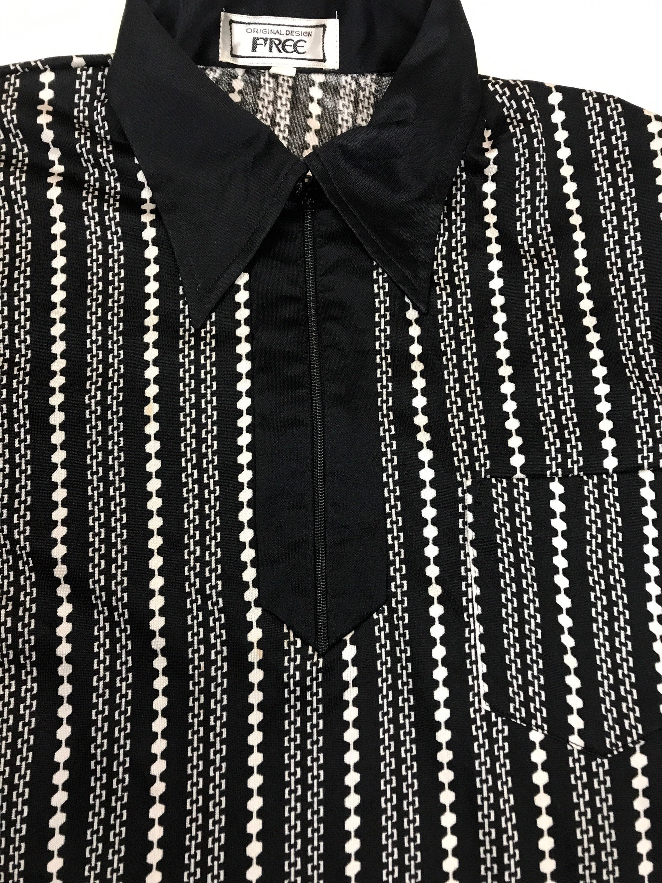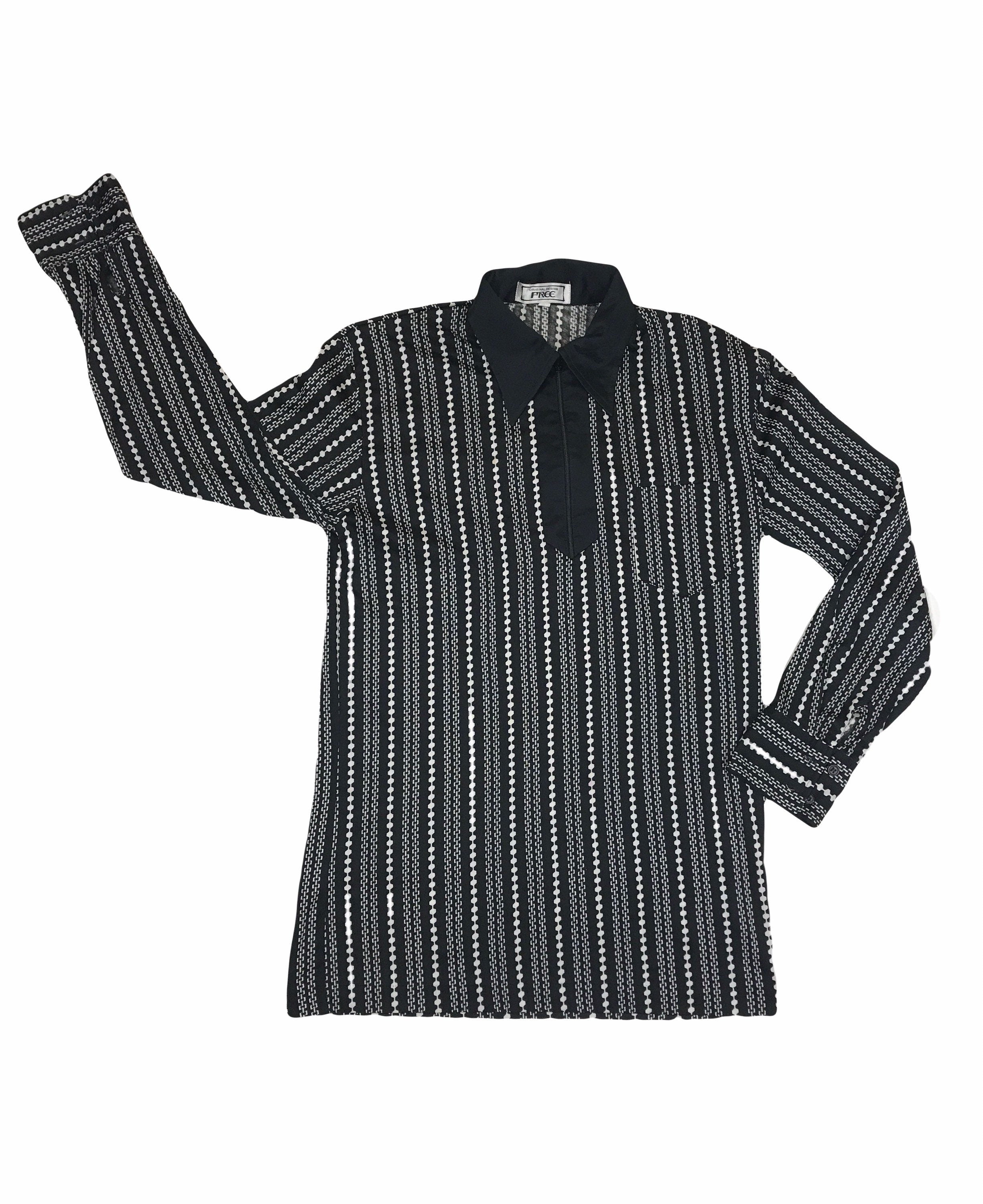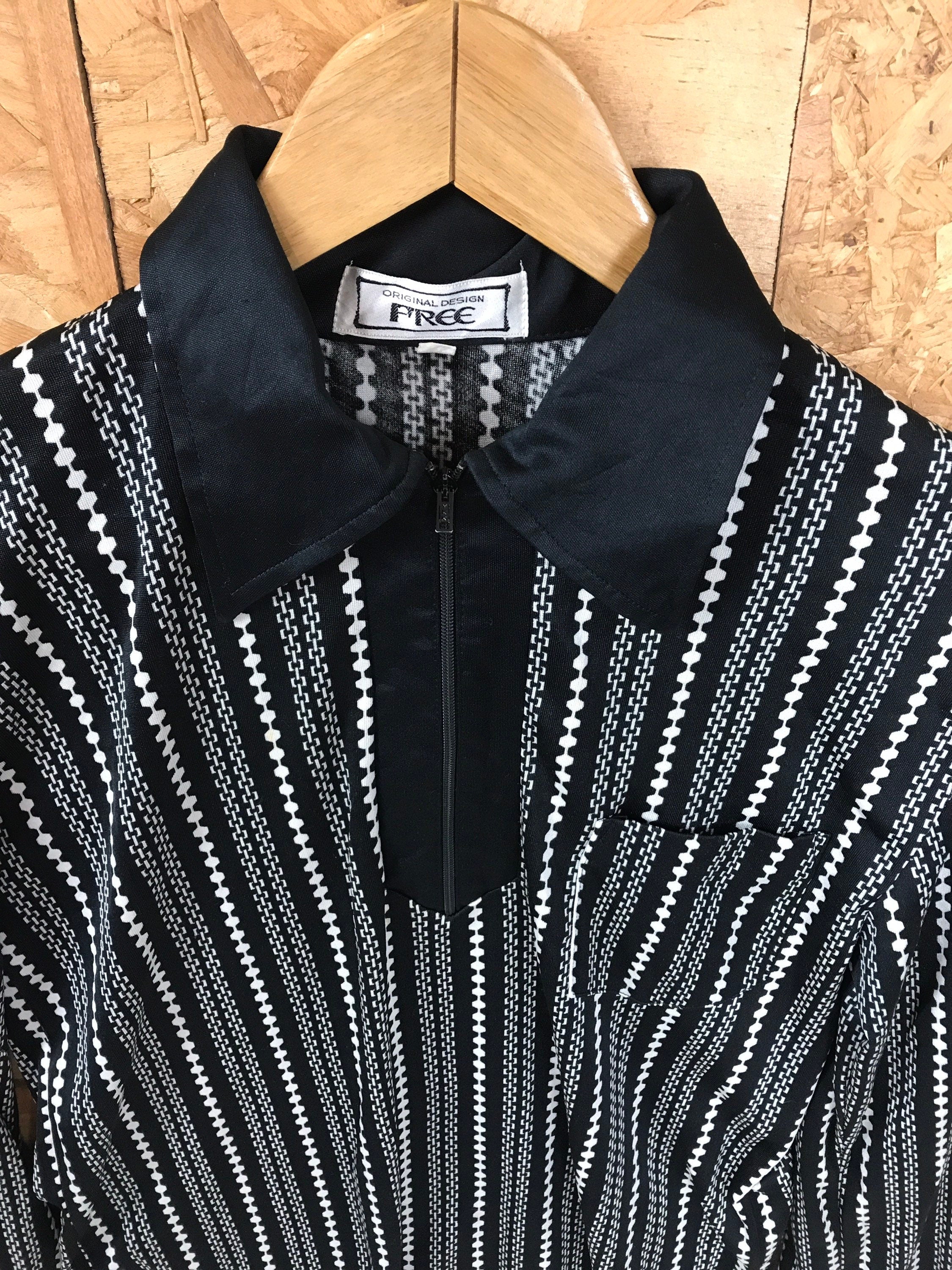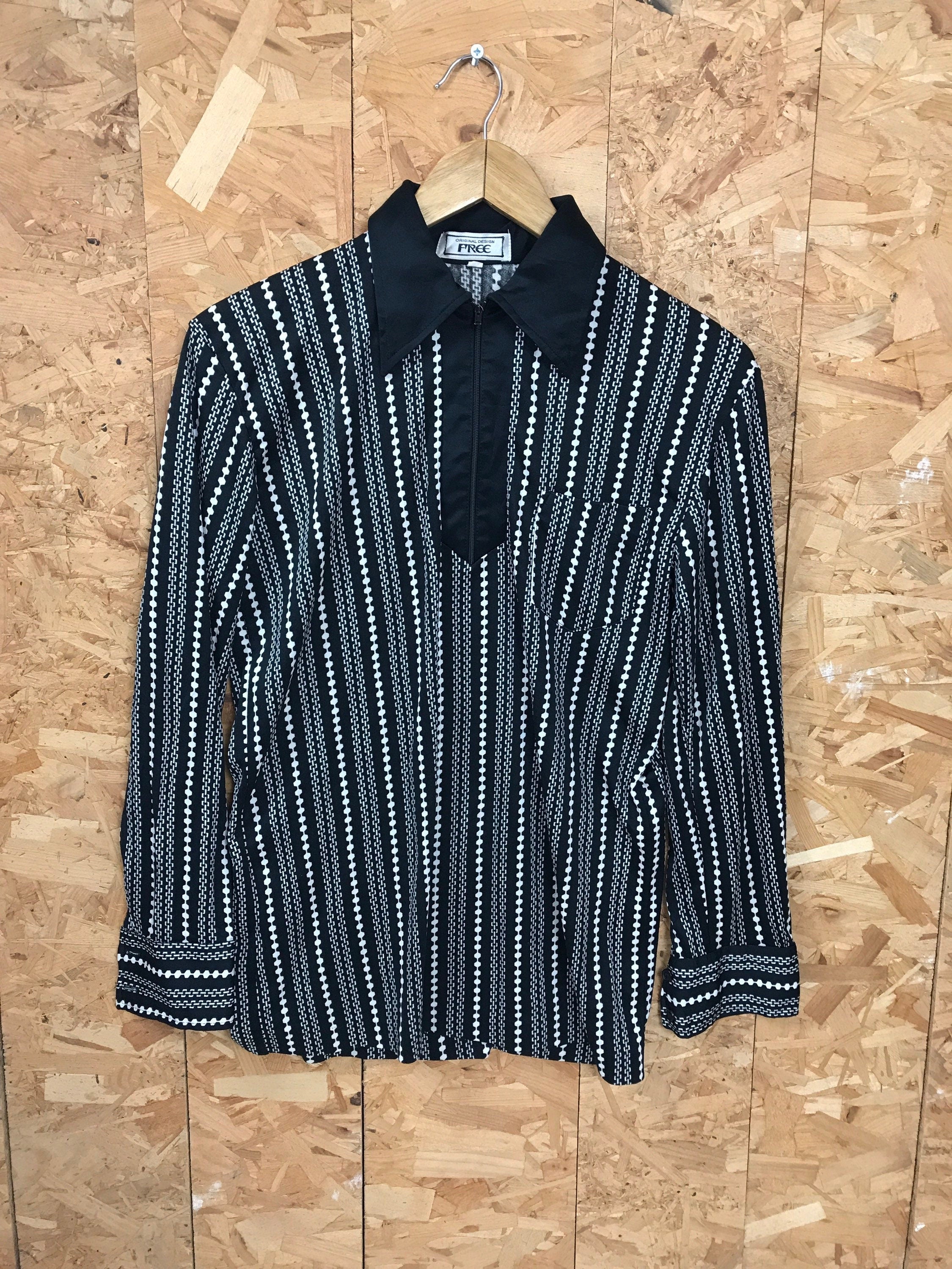 Vintage 70s white black faded stripe pattern pointed collar retro polyester disco shirt size medium slim fit