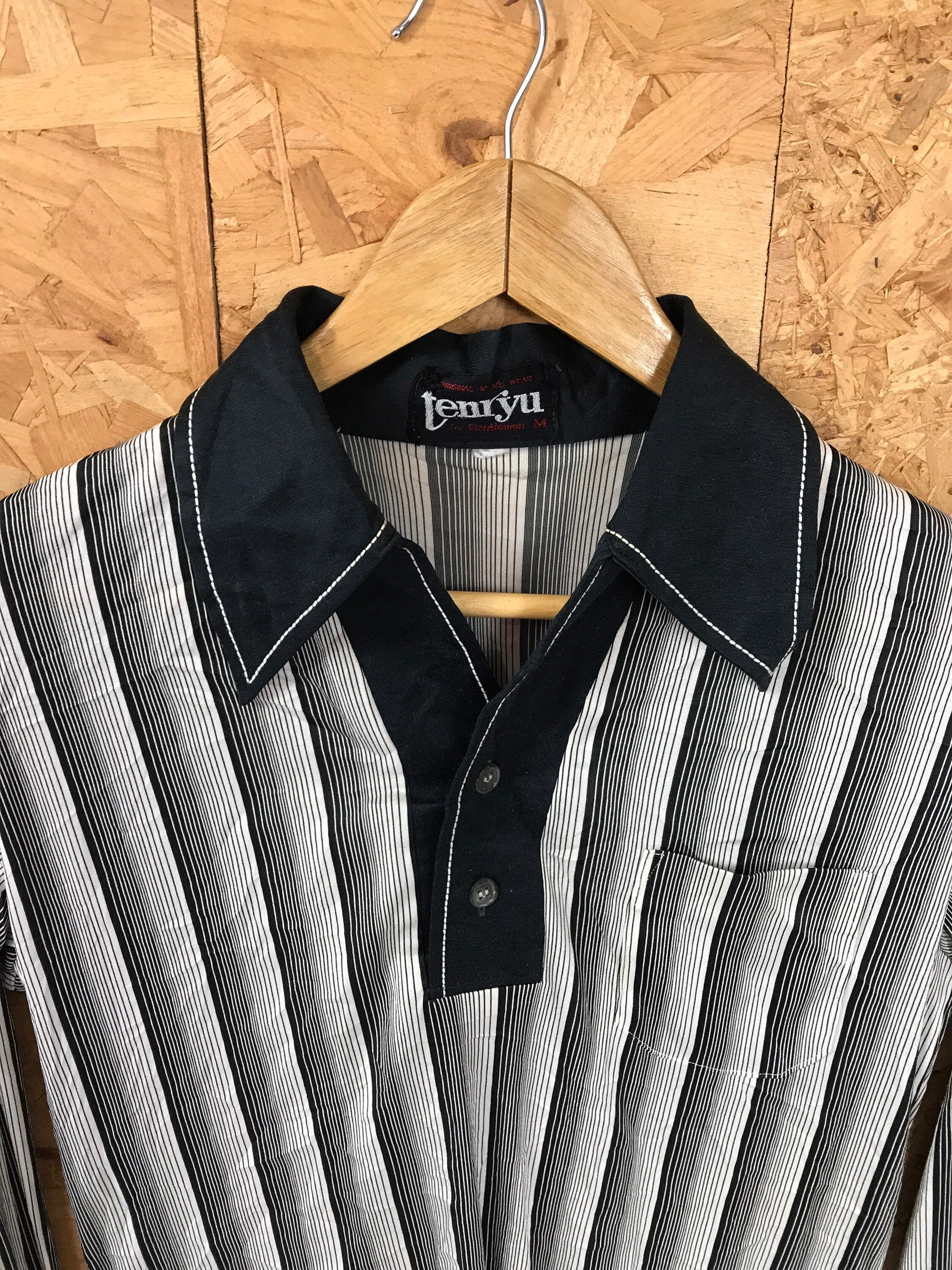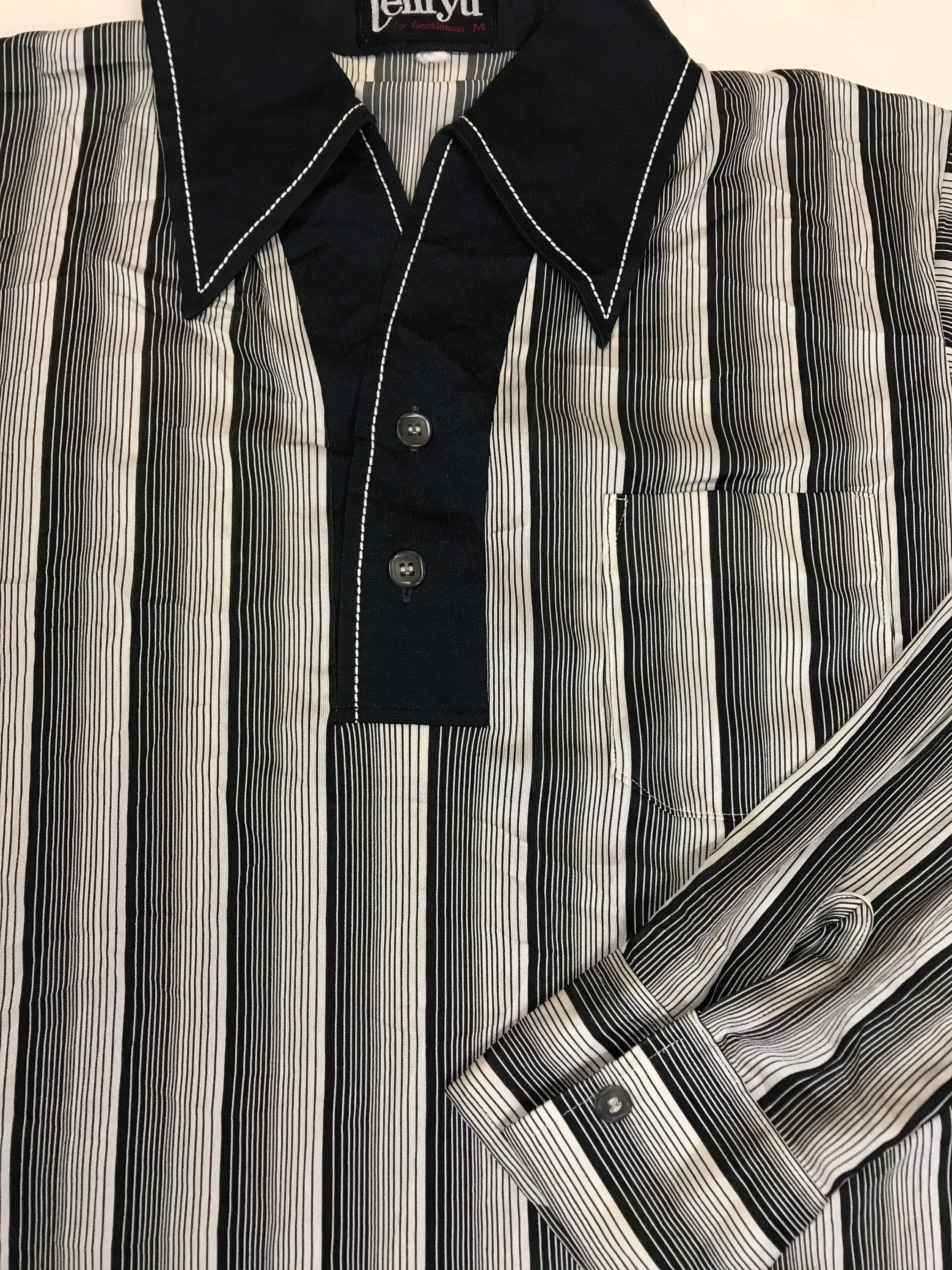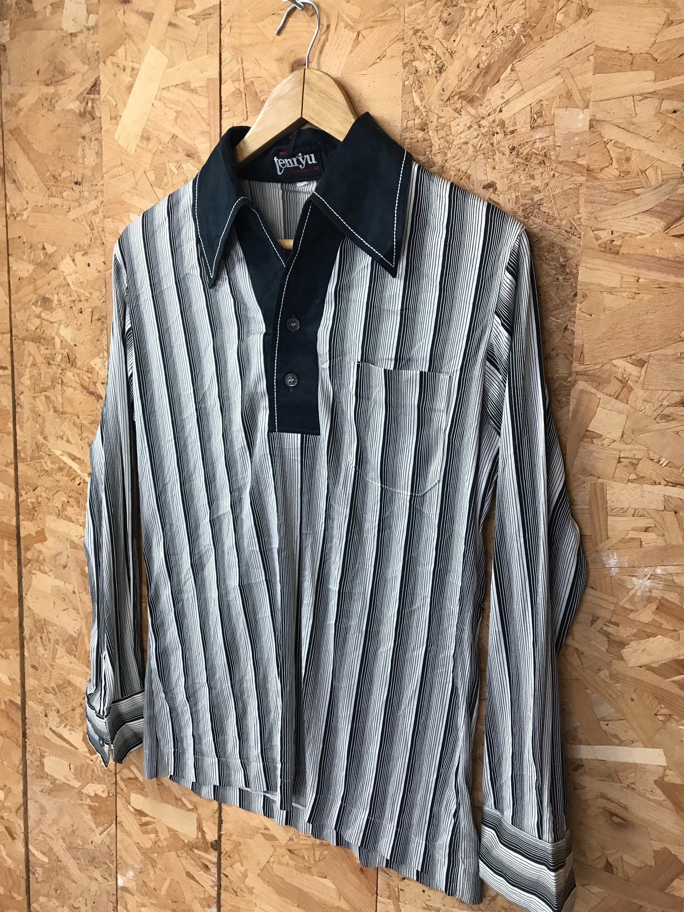 Vintage 70s white black faded stripe pattern pointed collar retro polyester disco shirt size medium slim fit