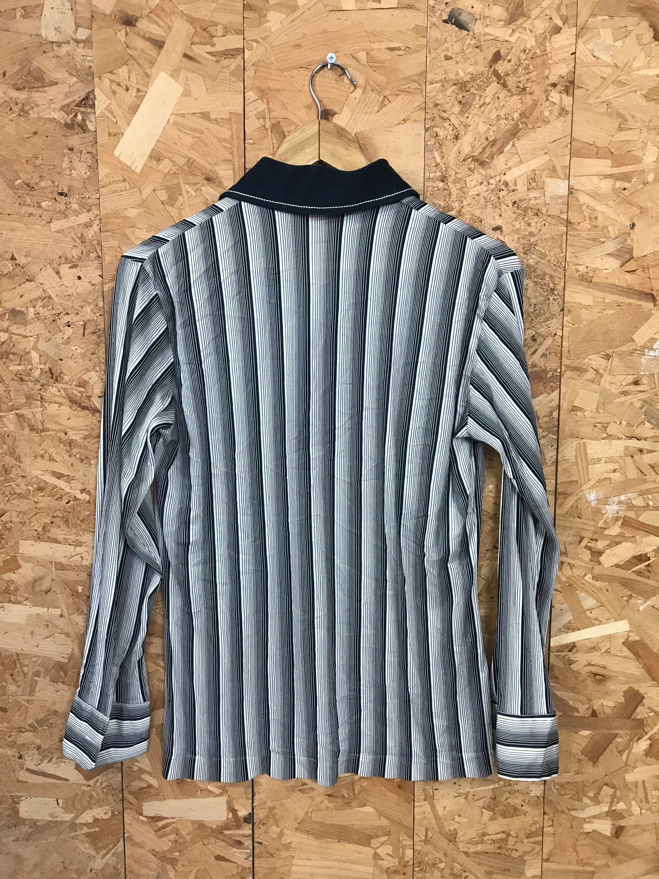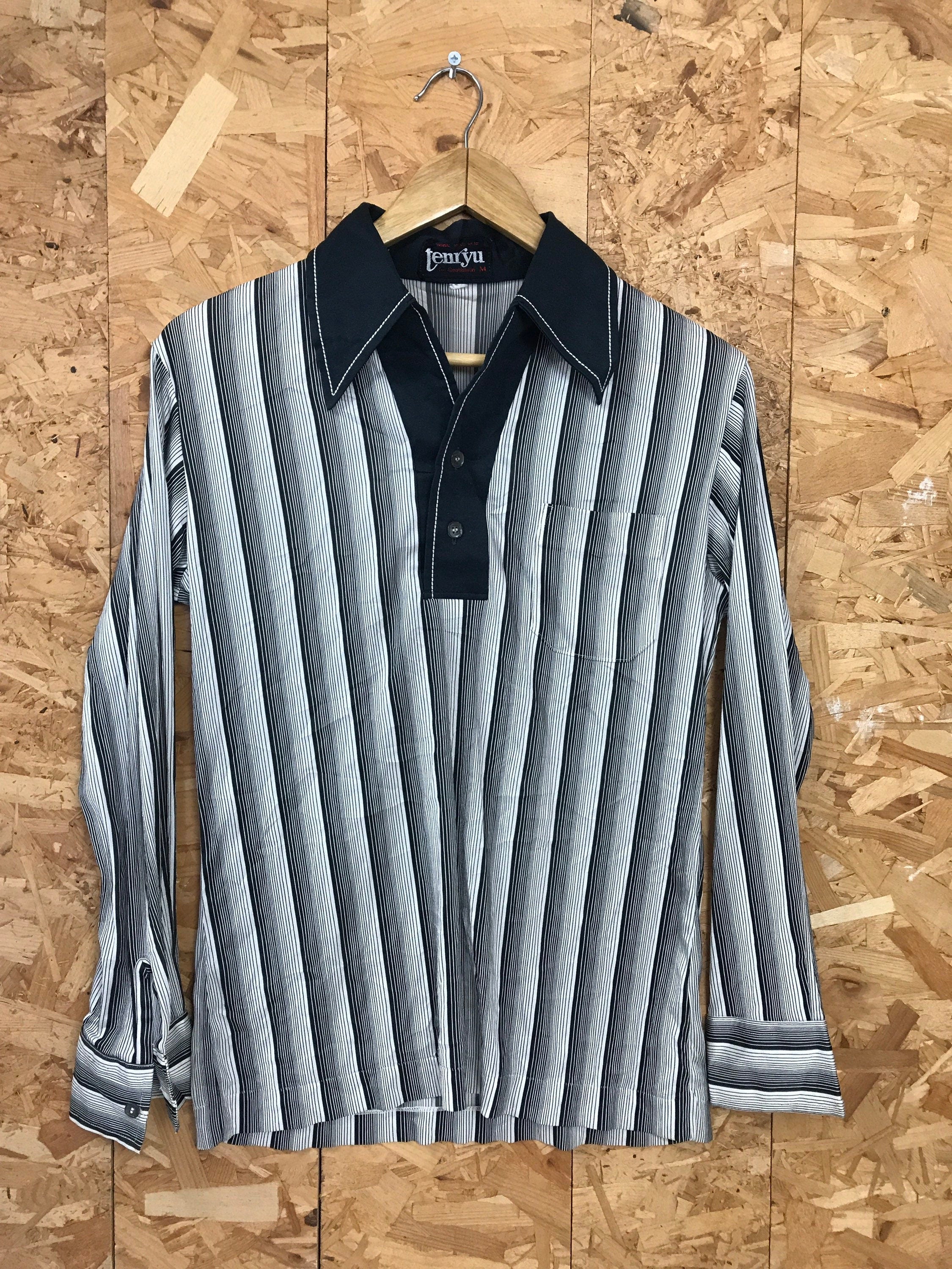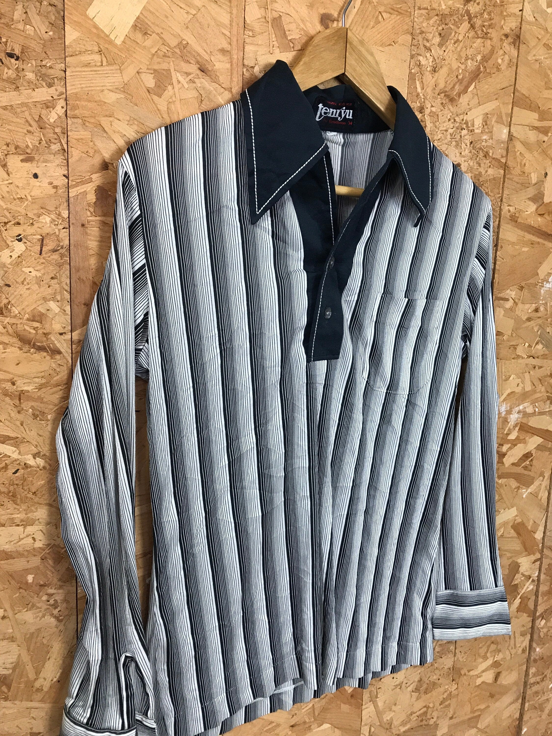 Vintage 70s white black faded stripe pattern pointed collar retro polyester disco shirt size medium slim fit