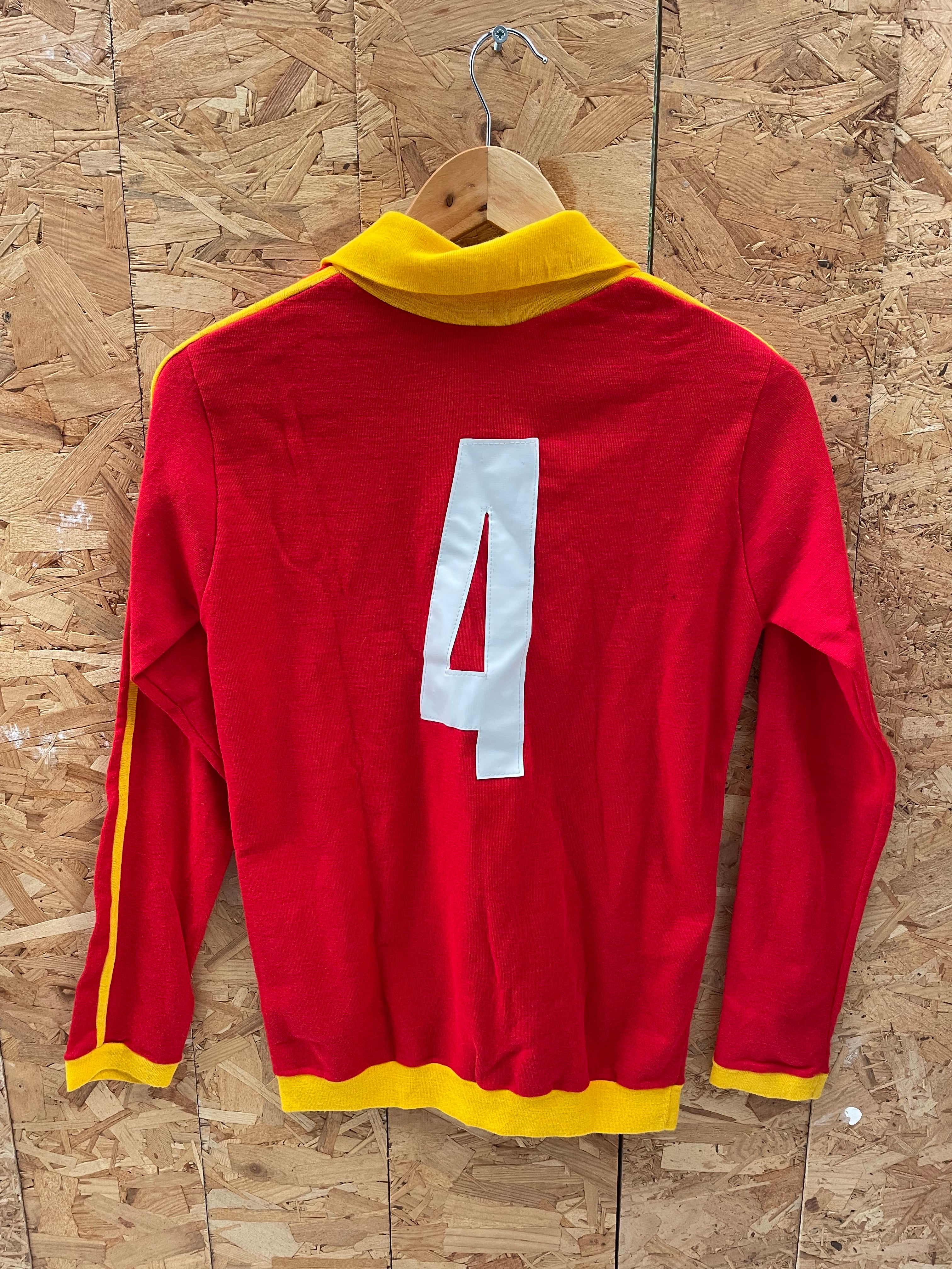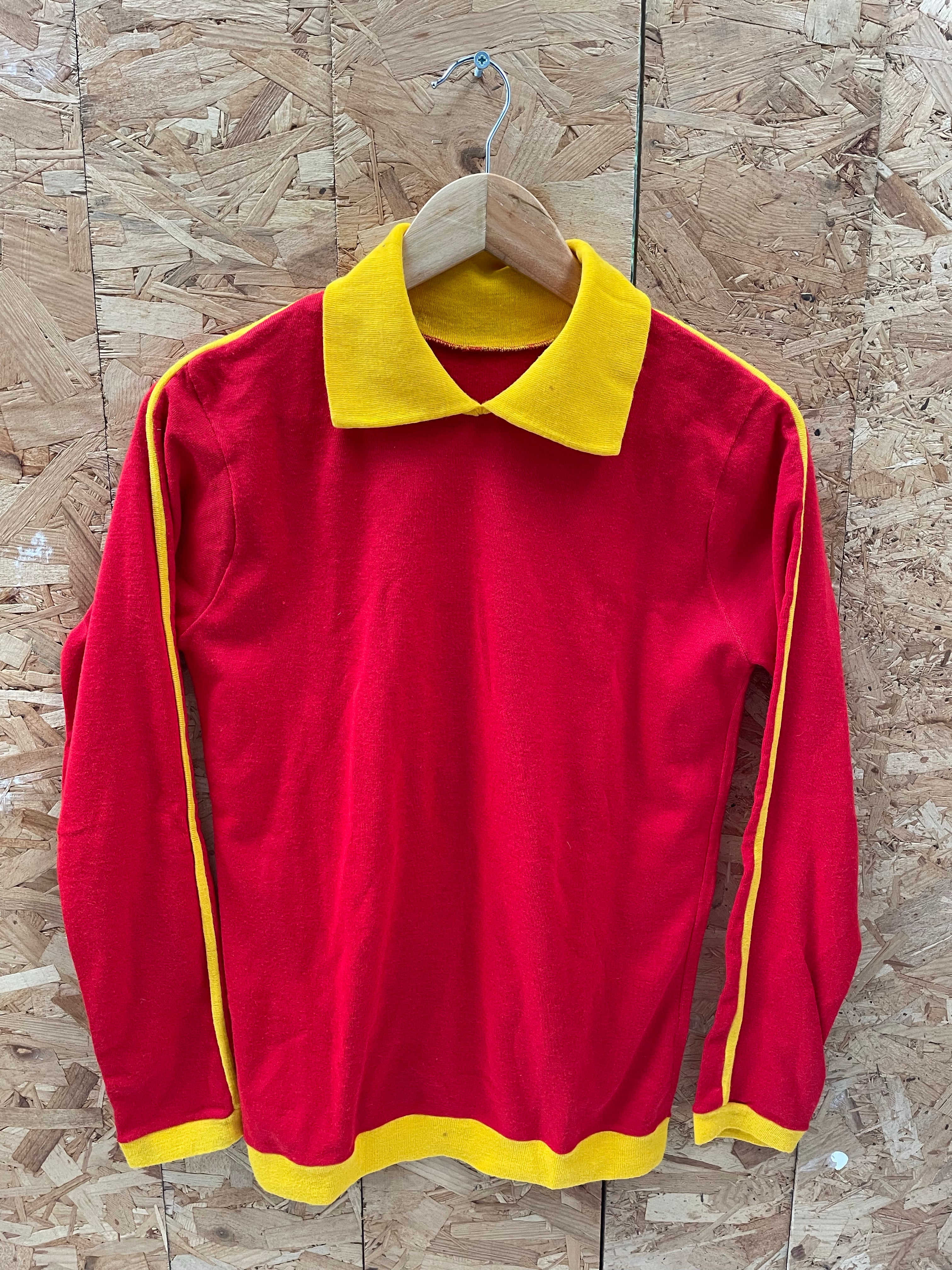 Vintage long sleeve polo shirt. Red with yellow collar and stripes. Great condition. Size not visible on tag. Fits as M or S Color: Red.