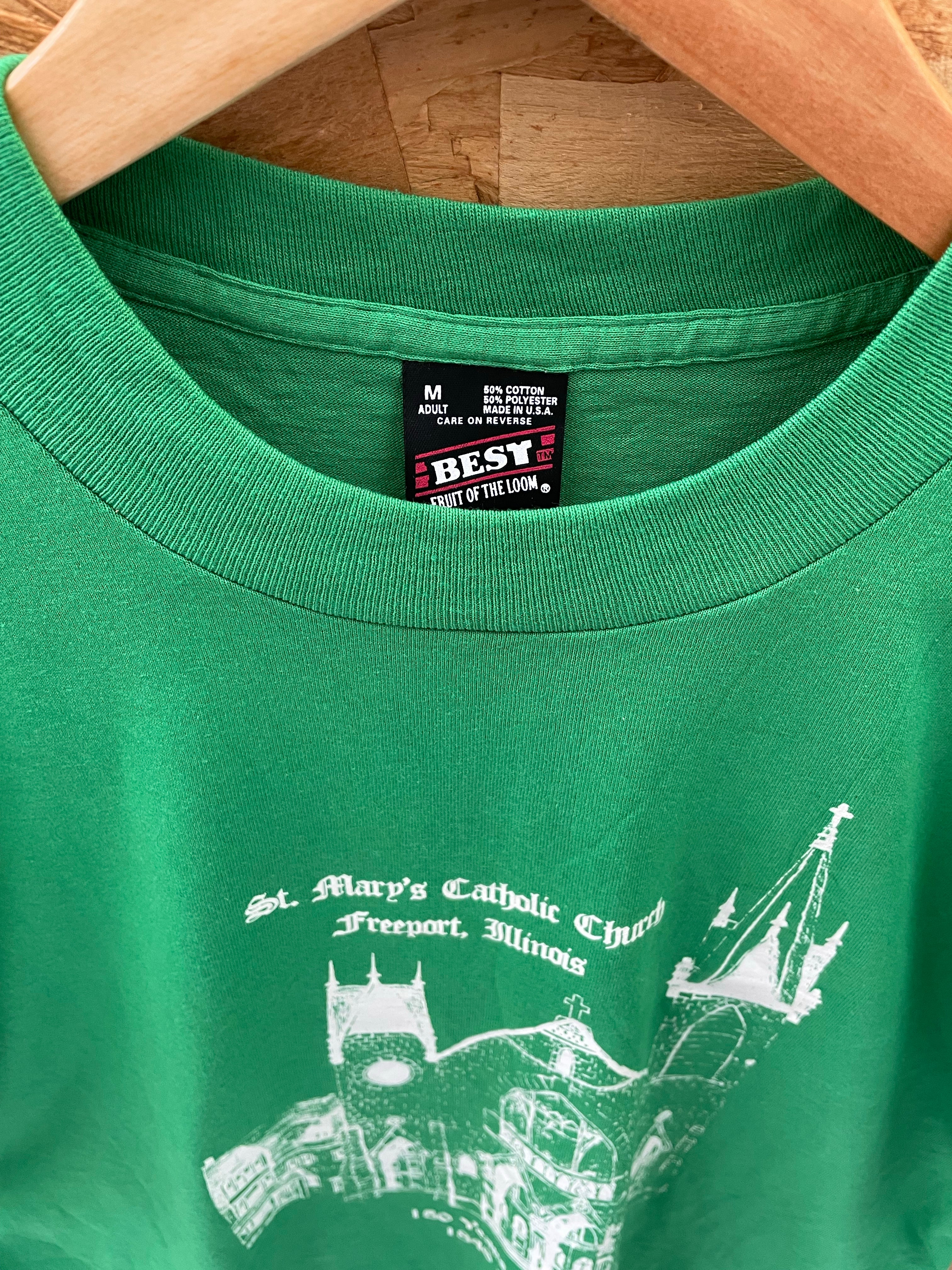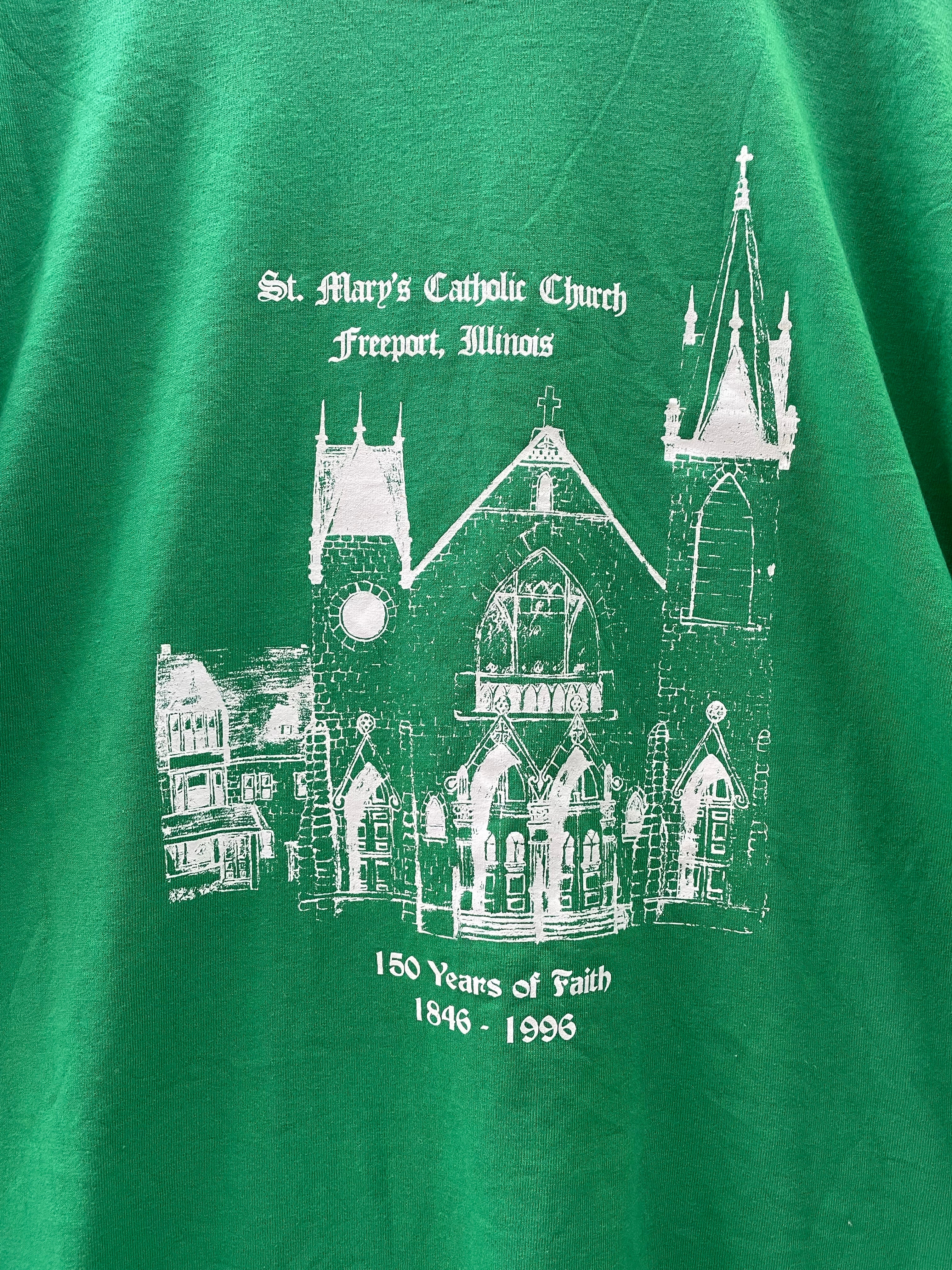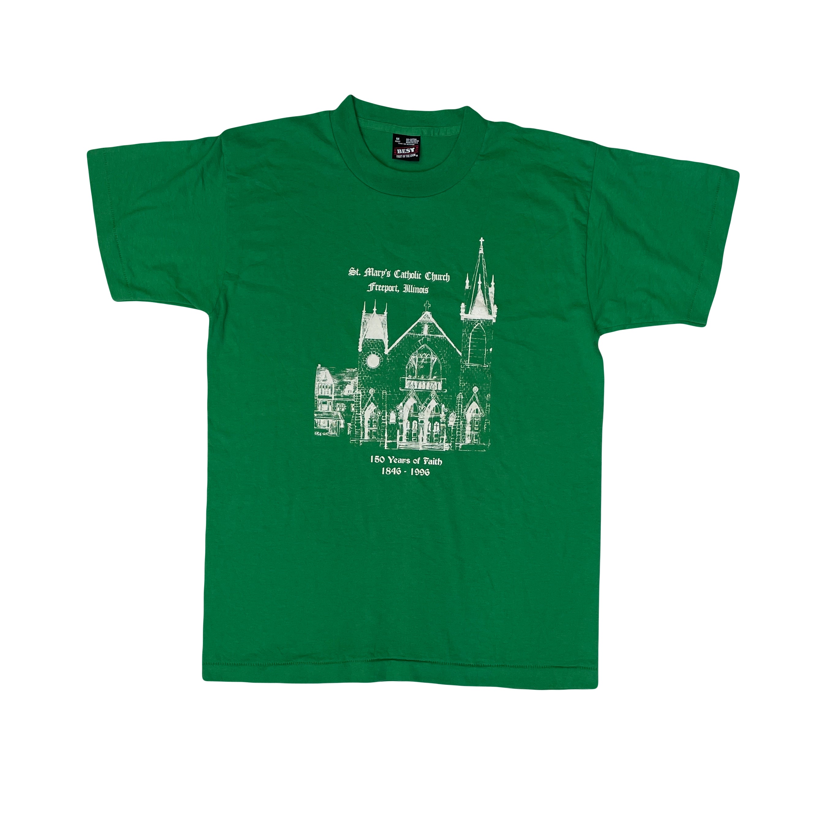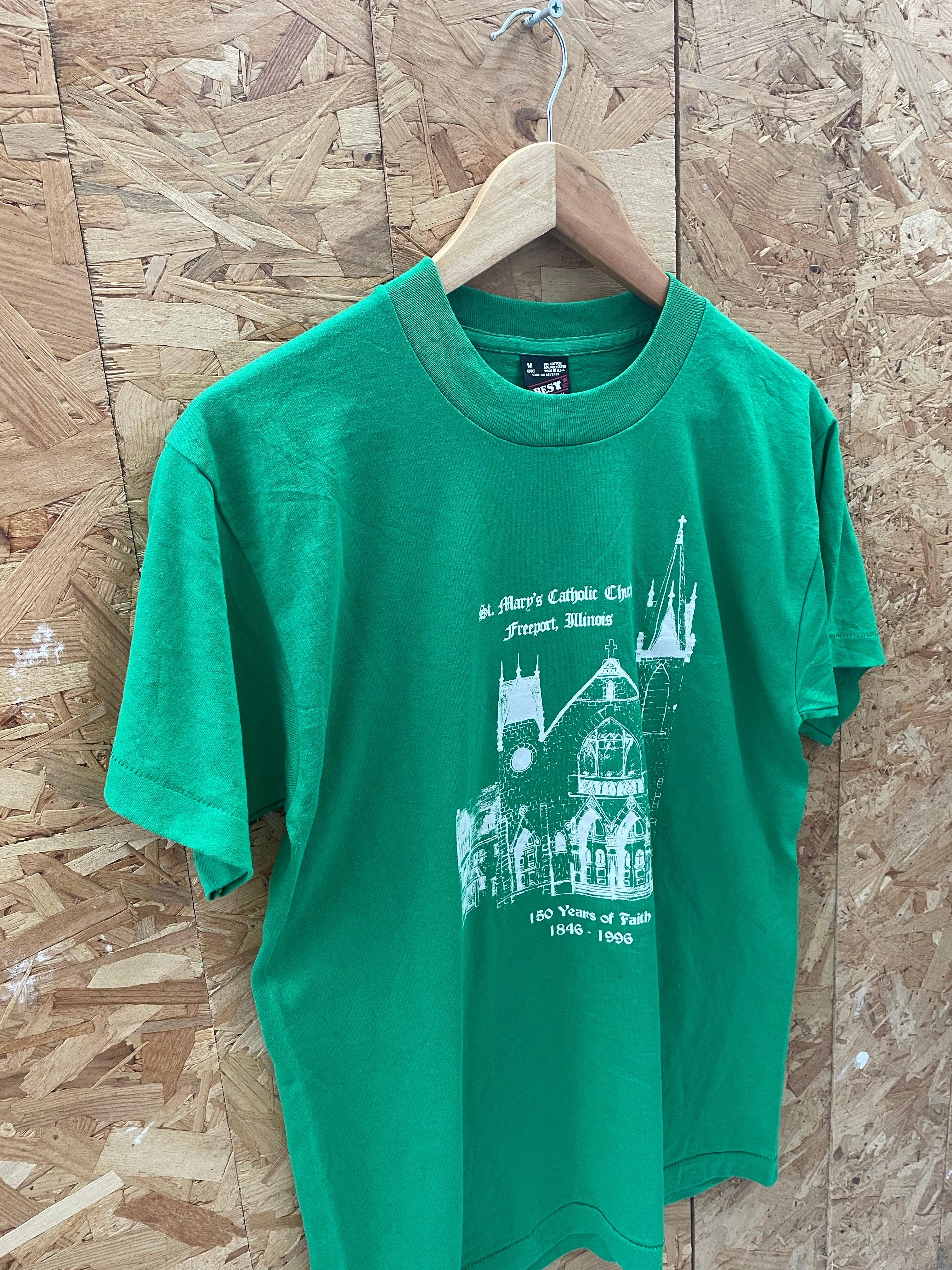 Vintage single stitch green t-shirt featuring St. Mary's Catholic Church, Freeport, Illinois. BEST brand. Size M. Great condition. 150 Years of Faith 1846-1996 graphic. Color: Green.