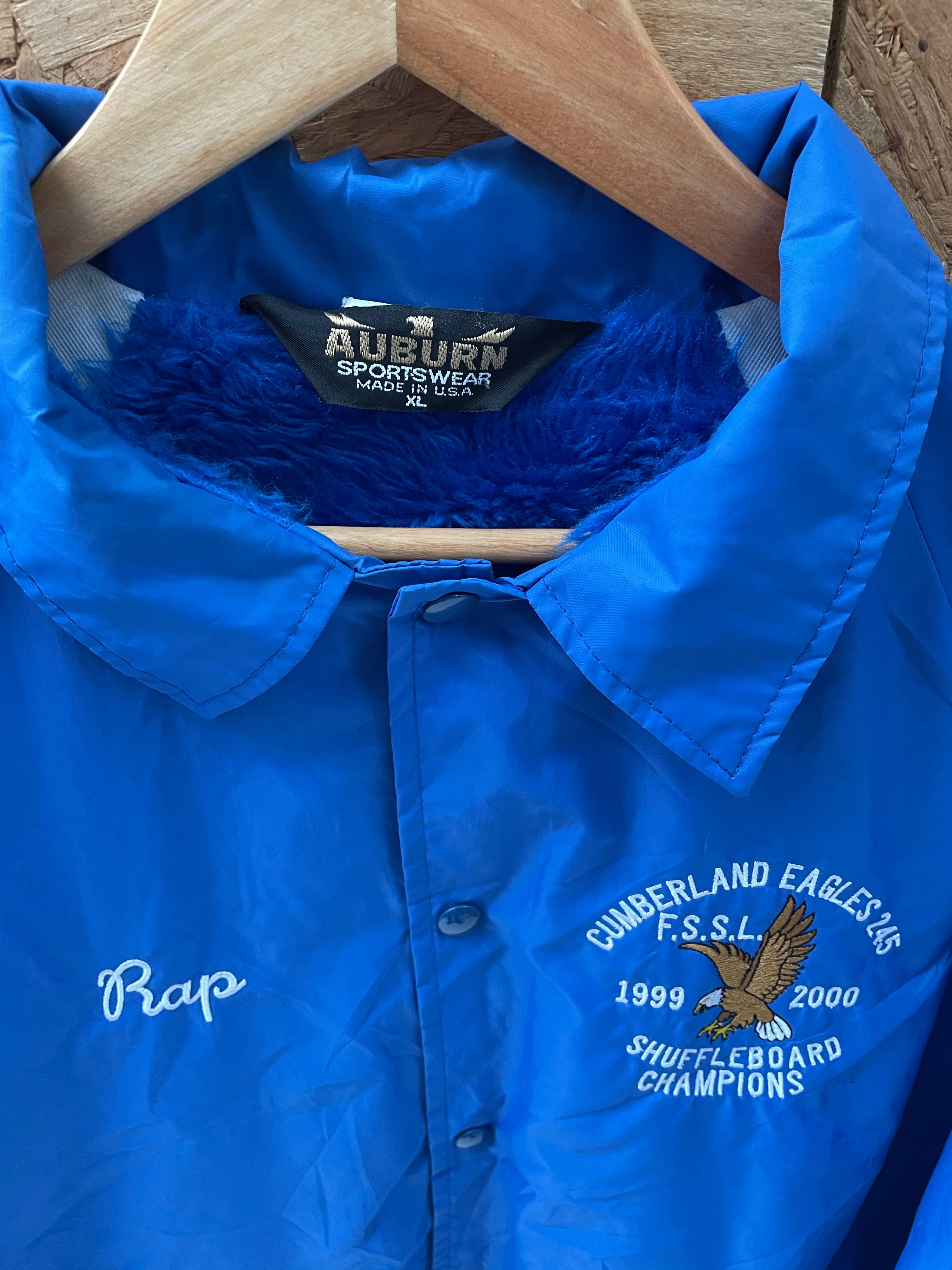 Vintage Auburn Sportwear XL blue coach jacket. Features embroidered Cumberland Eagles logo and 'Rap' embroidery. True Vintage Color: Blue.