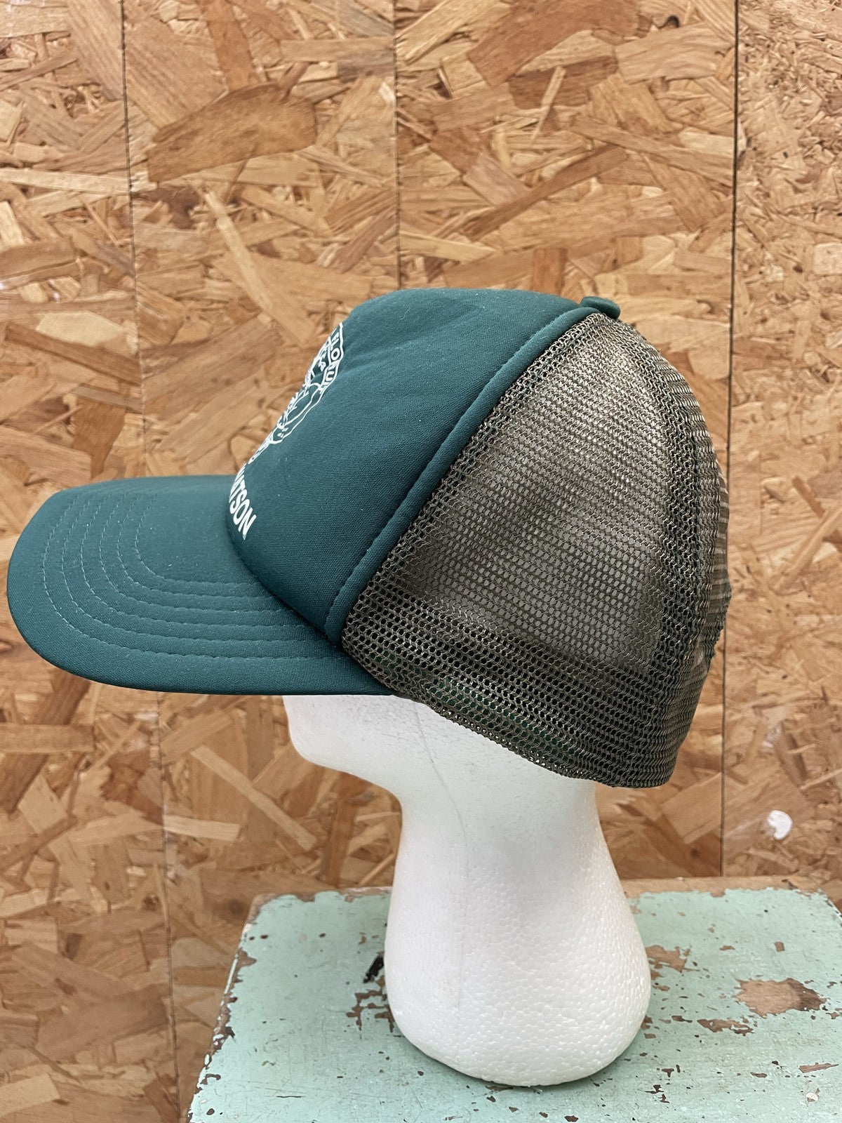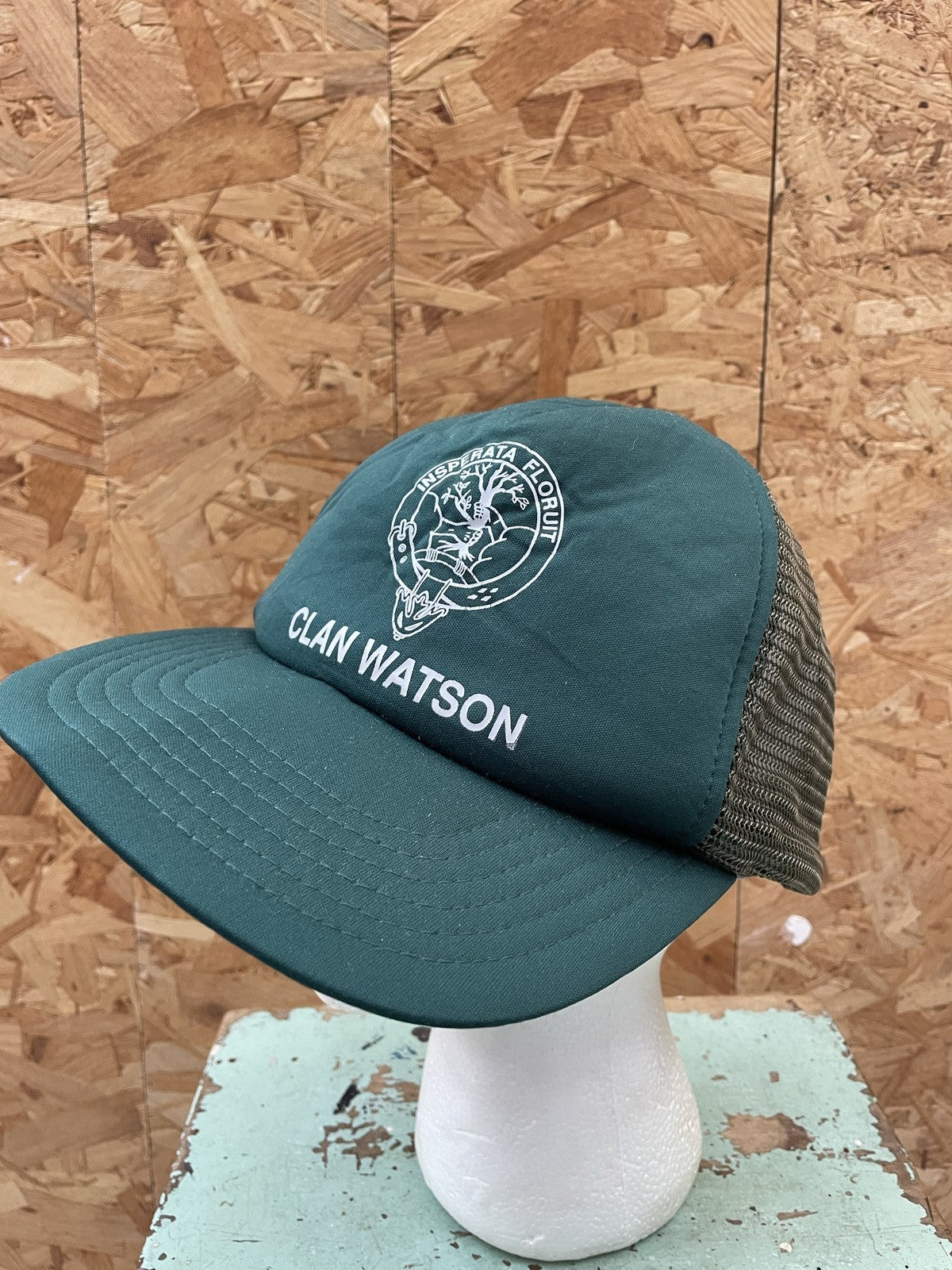This true vintage green trucker hat features a printed Clan Watson crest and text. It has a classic mesh back with an adjustable snapback closure for a comfortable, custom fit. Perfect for fans of Scottish heritage or anyone looking for a stylish casual hat. Era: Modern.