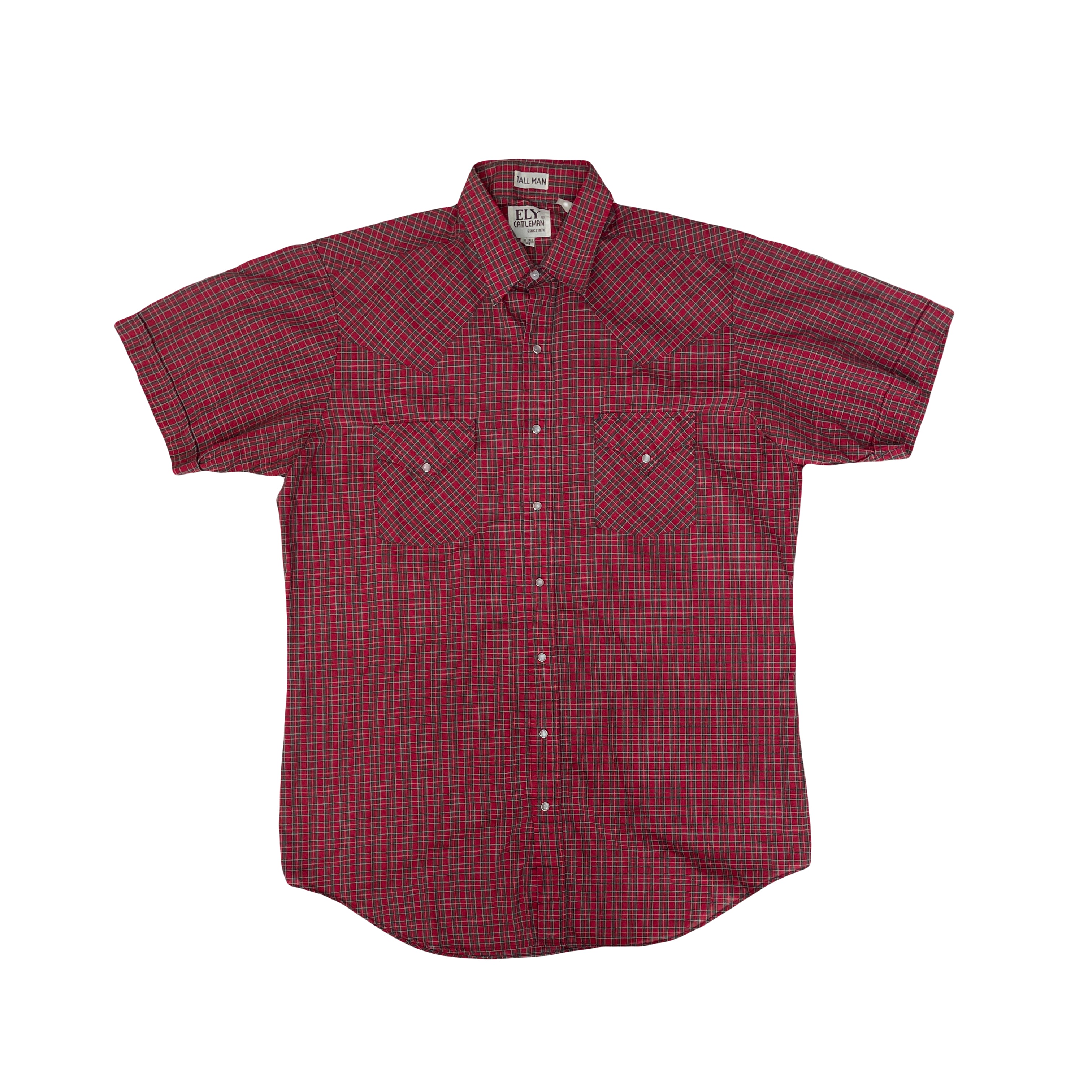 Vintage Ely Cattleman Tall Man size 16-34 red and green plaid western shirt. Short sleeves, pearl snaps, and classic western pockets. Excellent pre-owned condition. Color: Red.