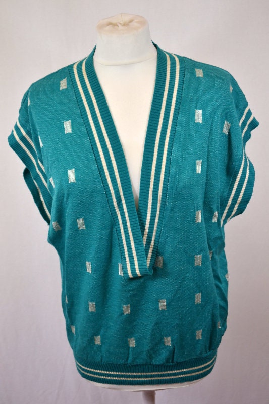 Vintage 80s ladies turquoise & white tank top jumper plunging v-neck size large